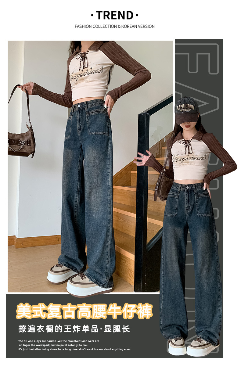 플러스 사이즈 스트레이트 기모 청바지 여성의 2024 년 새로운 가을 및 겨울 폭발, 느슨한 높은 허리 넓은 다리 바지 통통녀 슬리밍