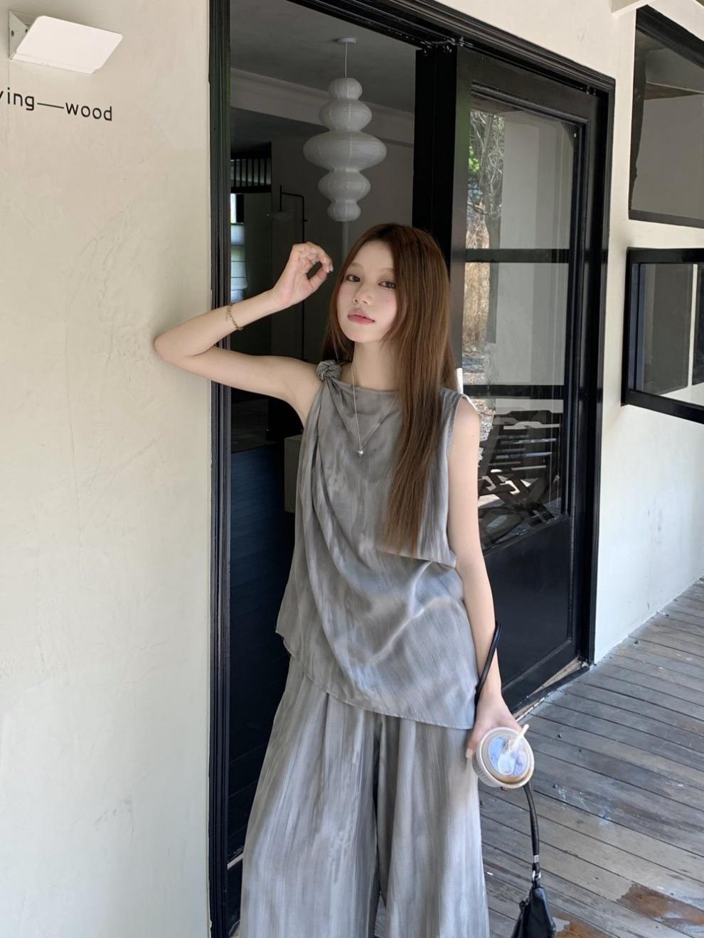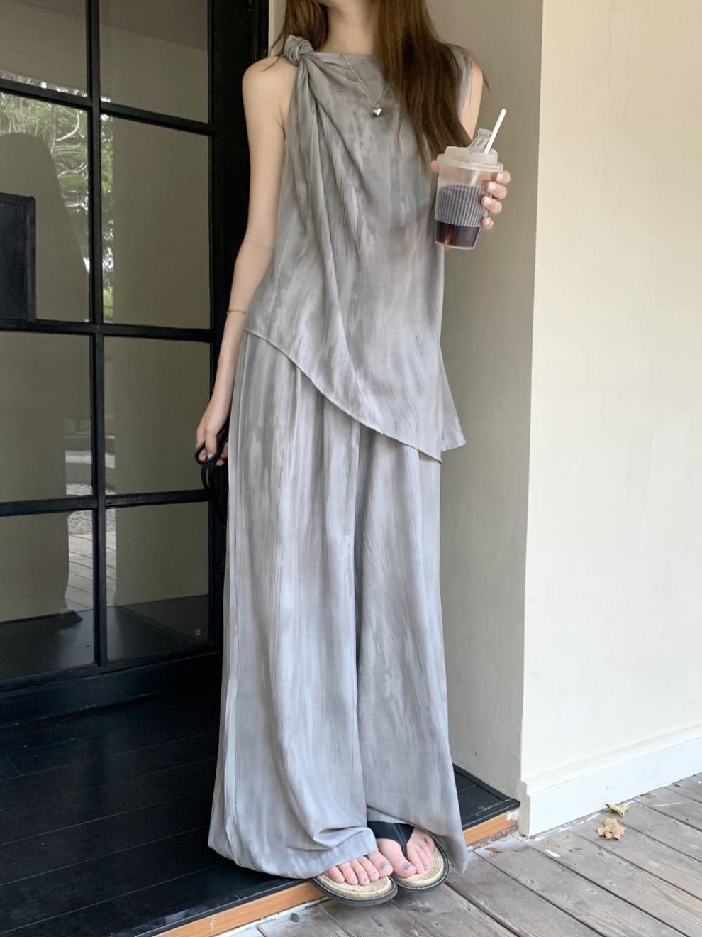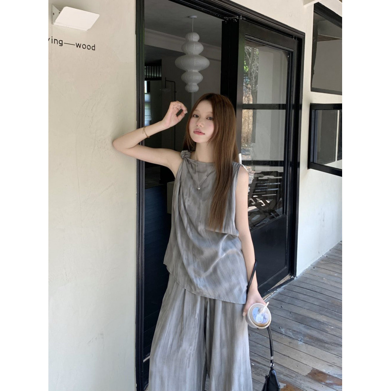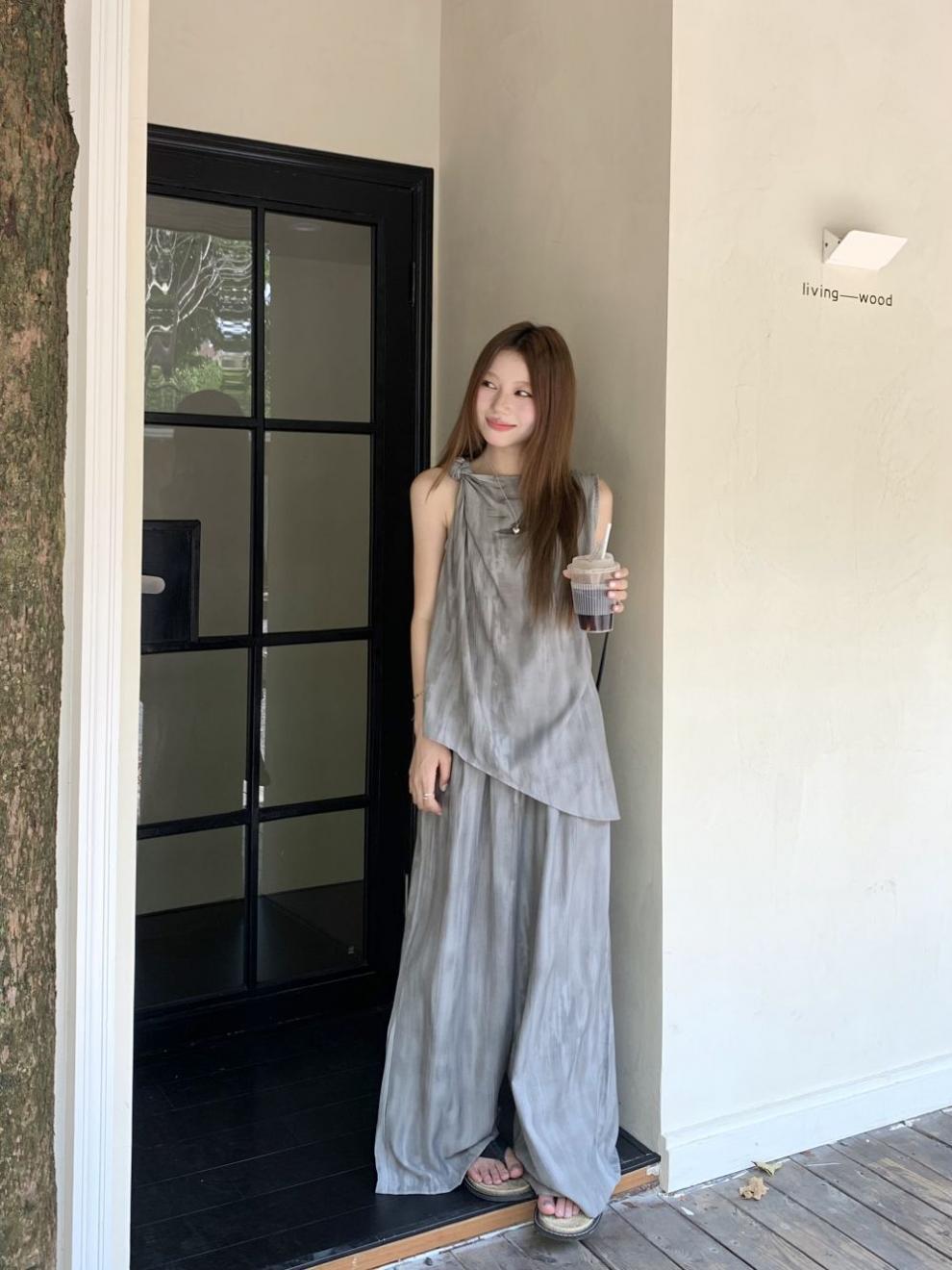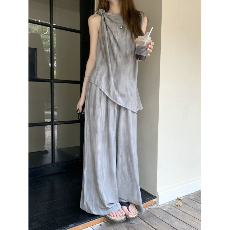 2025년 신상 여름 루즈웨어, 부드러운 새로운 불규칙 민소매 탑과 와이드 팬츠 투피스 세트 여성용스토어 가기