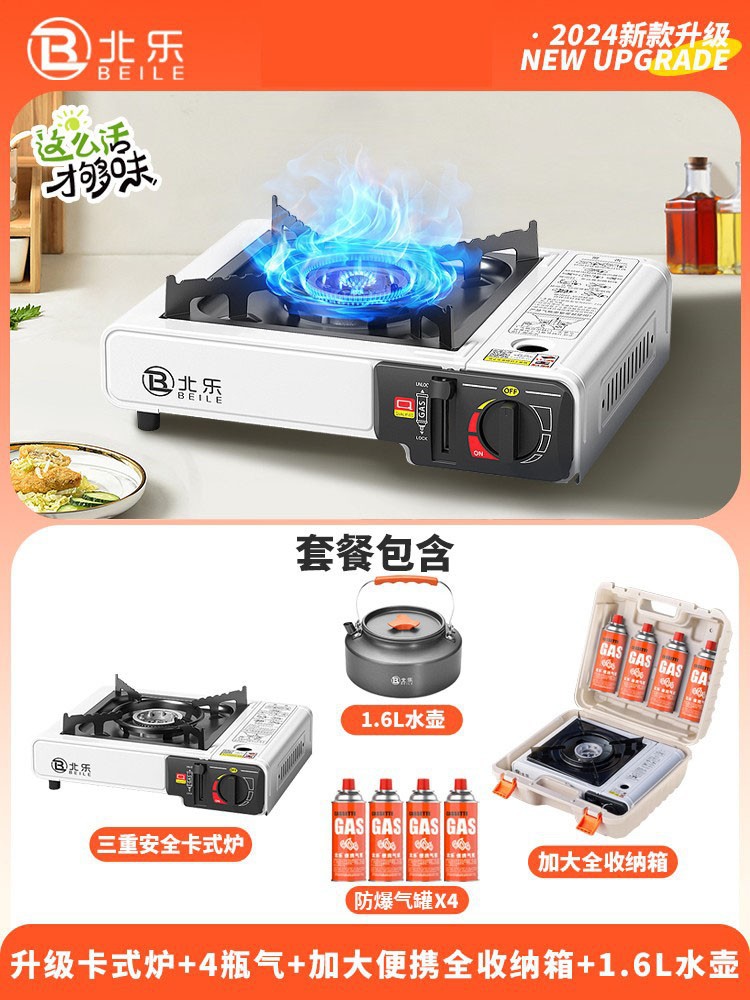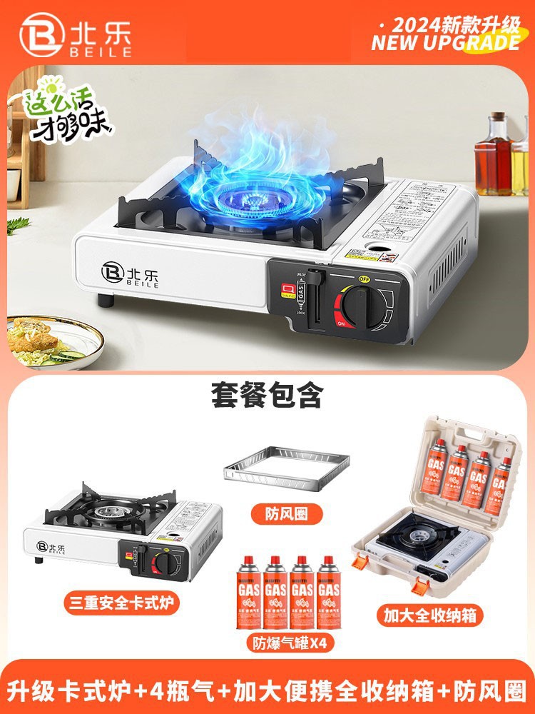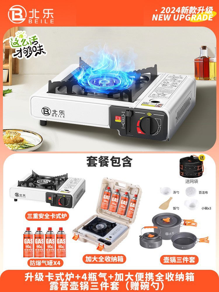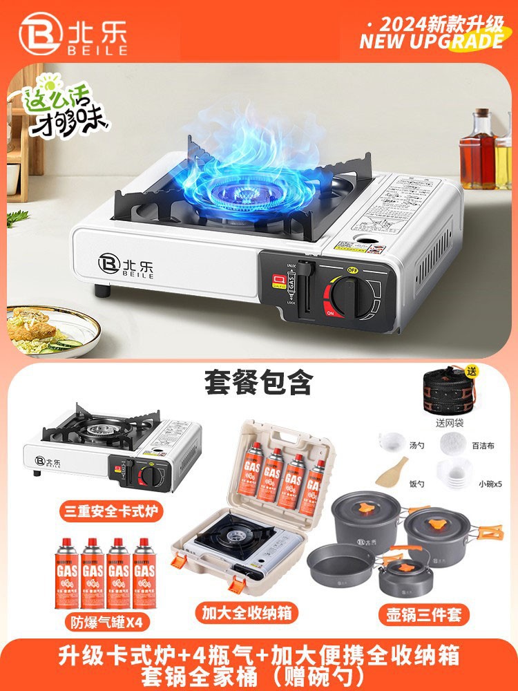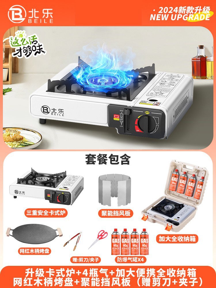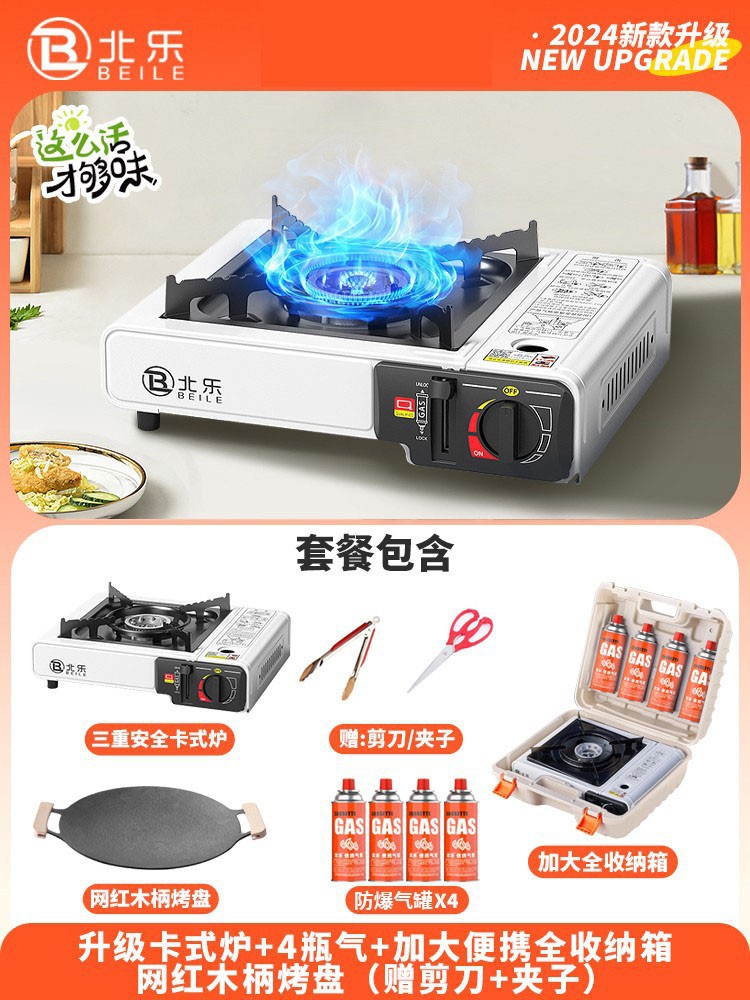 • 업그레이드된 카세트 스토브 + 가스 4병 + 대형 휴대용 풀 수납함 + 인터넷 연예인 나무 손잡이 베이킹 팬(무료 가위 + 클립)