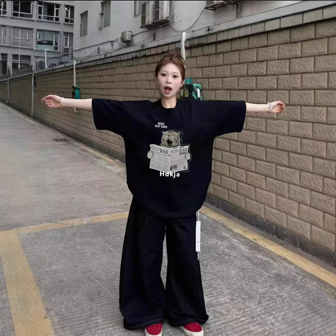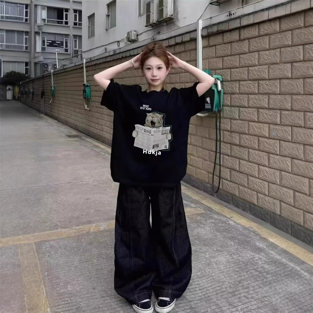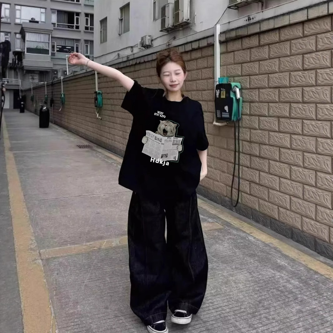 퓨어 코튼 숄더 블랙 반팔 티셔츠 여성 여름 2025 새로운 핫 아메리칸 스타일 느슨한 틈새 디자인 센스 탑스토어 가기