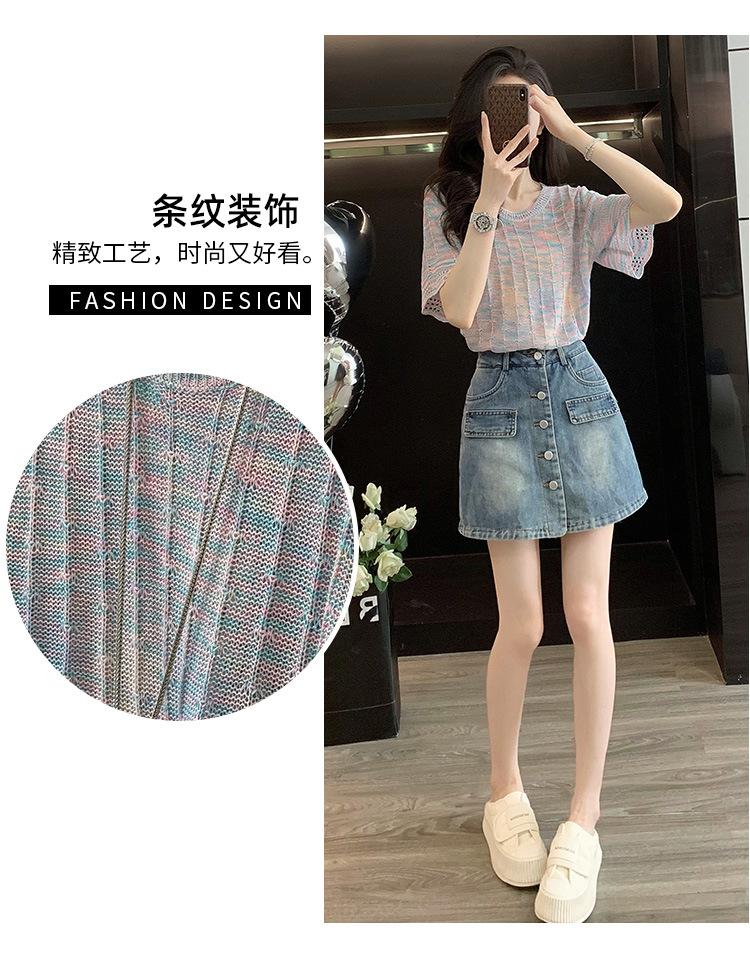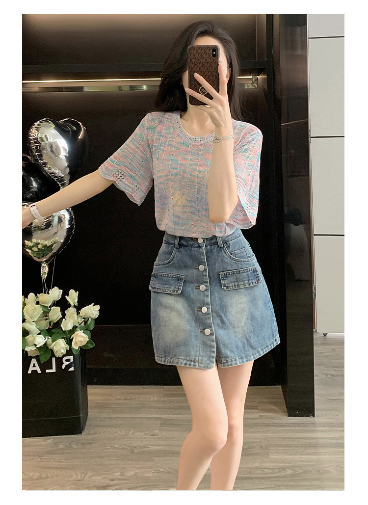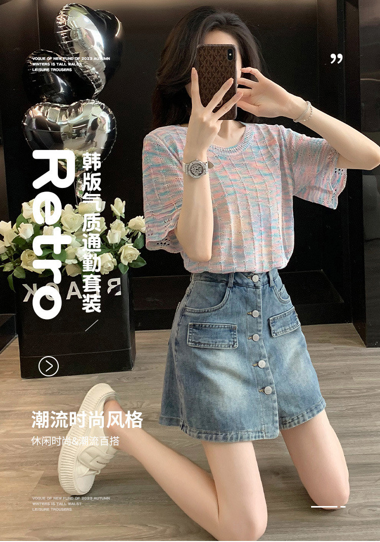 여름에는 여성 패션 슬리밍 연령 감소 니트 반팔 탑 여성 디자인 감각 데님 스커트 세트를 착용합니다.스토어 가기