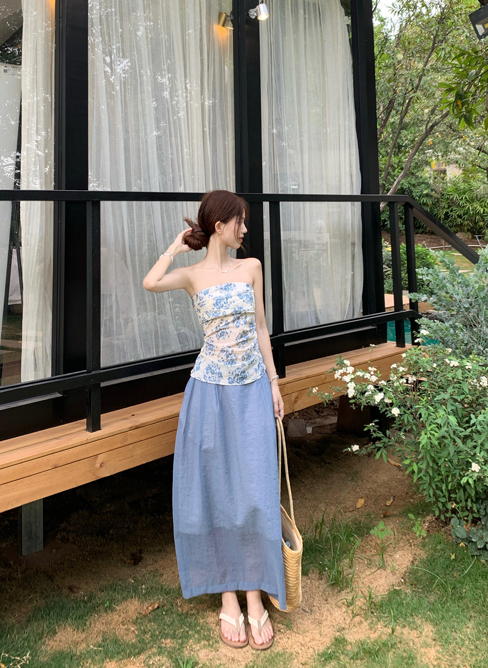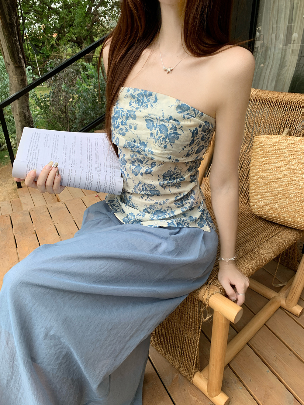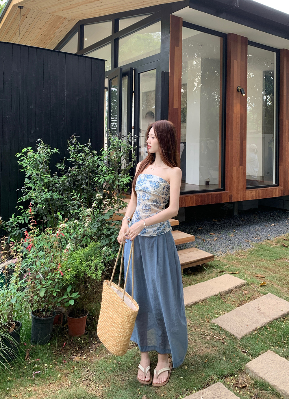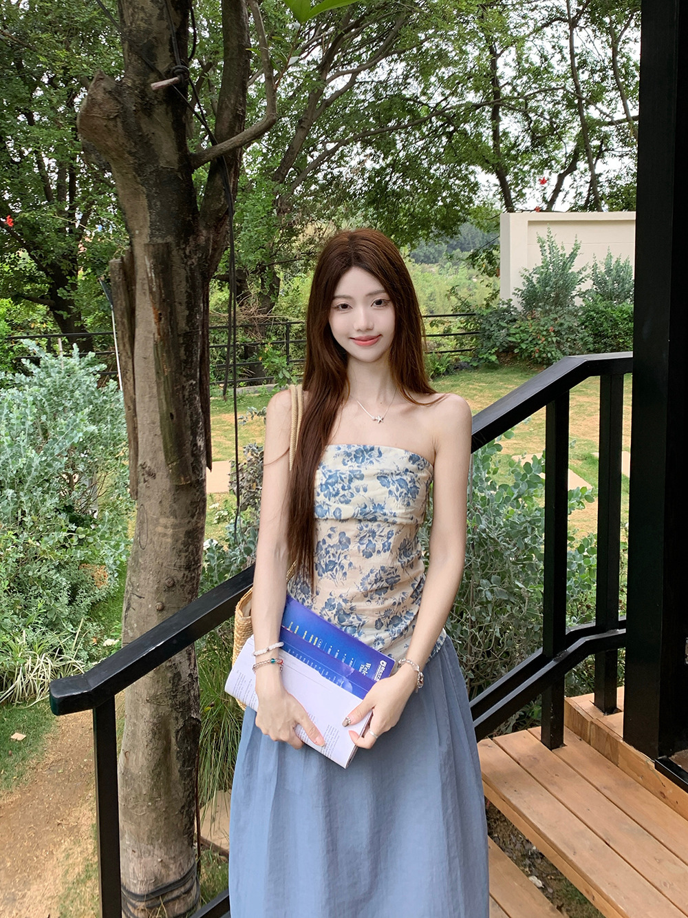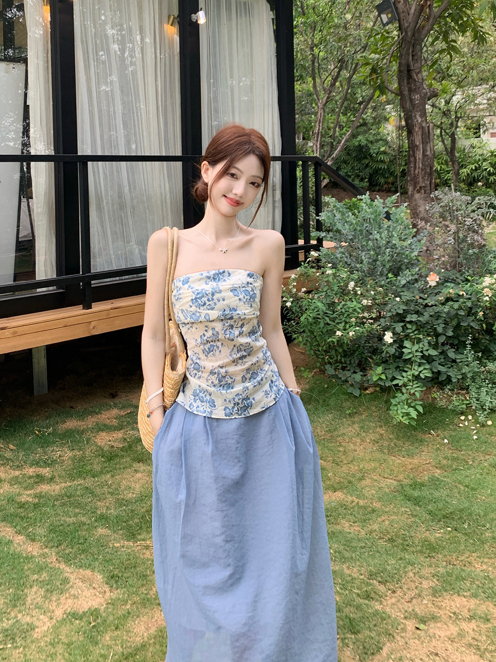 실제 사진 ~ 복고풍 패턴 리조트 스타일 탈착식 서스펜더 여성 비대칭 튜브 탑 + 여성용 중간 길이 스커트