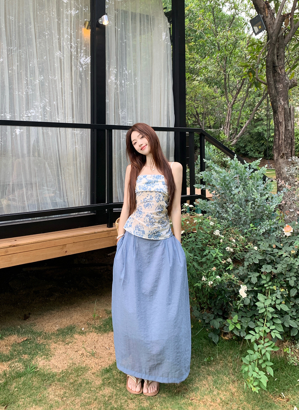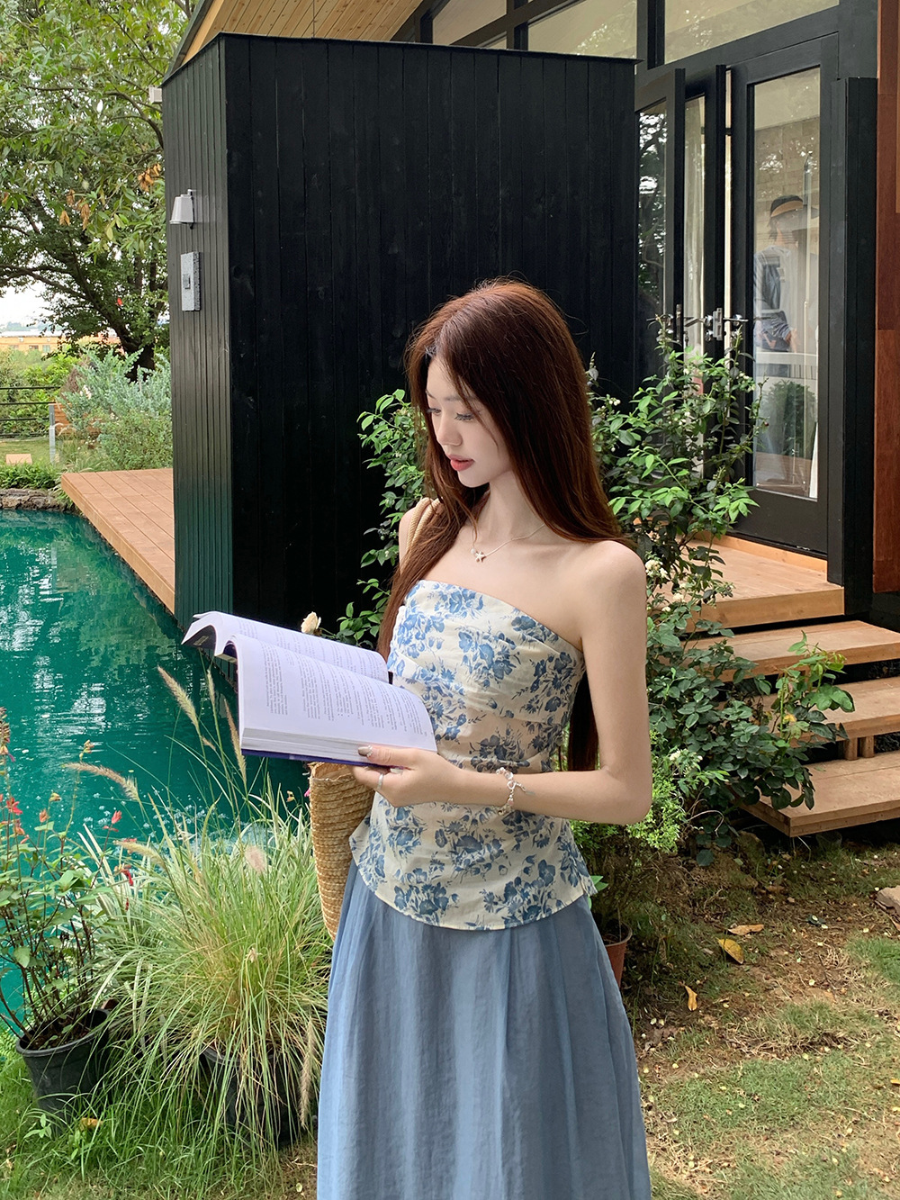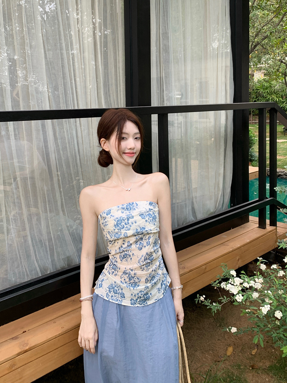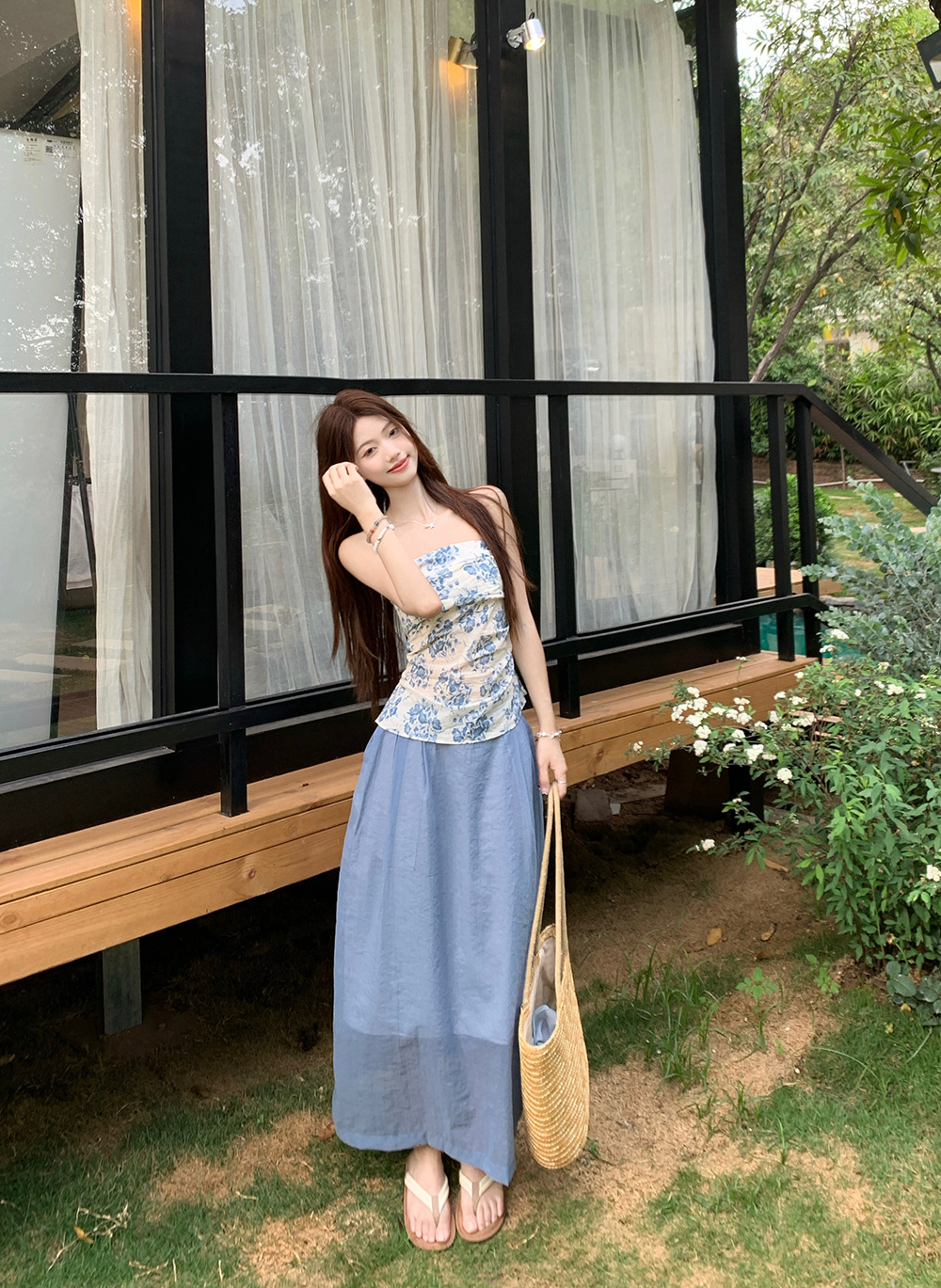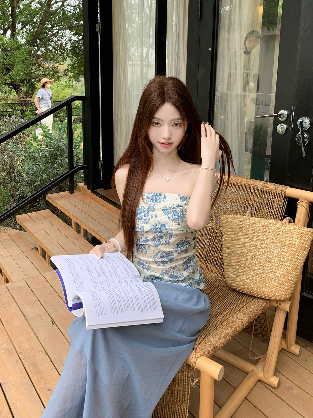 실제 사진 ~ 복고풍 패턴 리조트 스타일 탈착식 서스펜더 여성 비대칭 튜브 탑 + 여성용 중간 길이 스커트