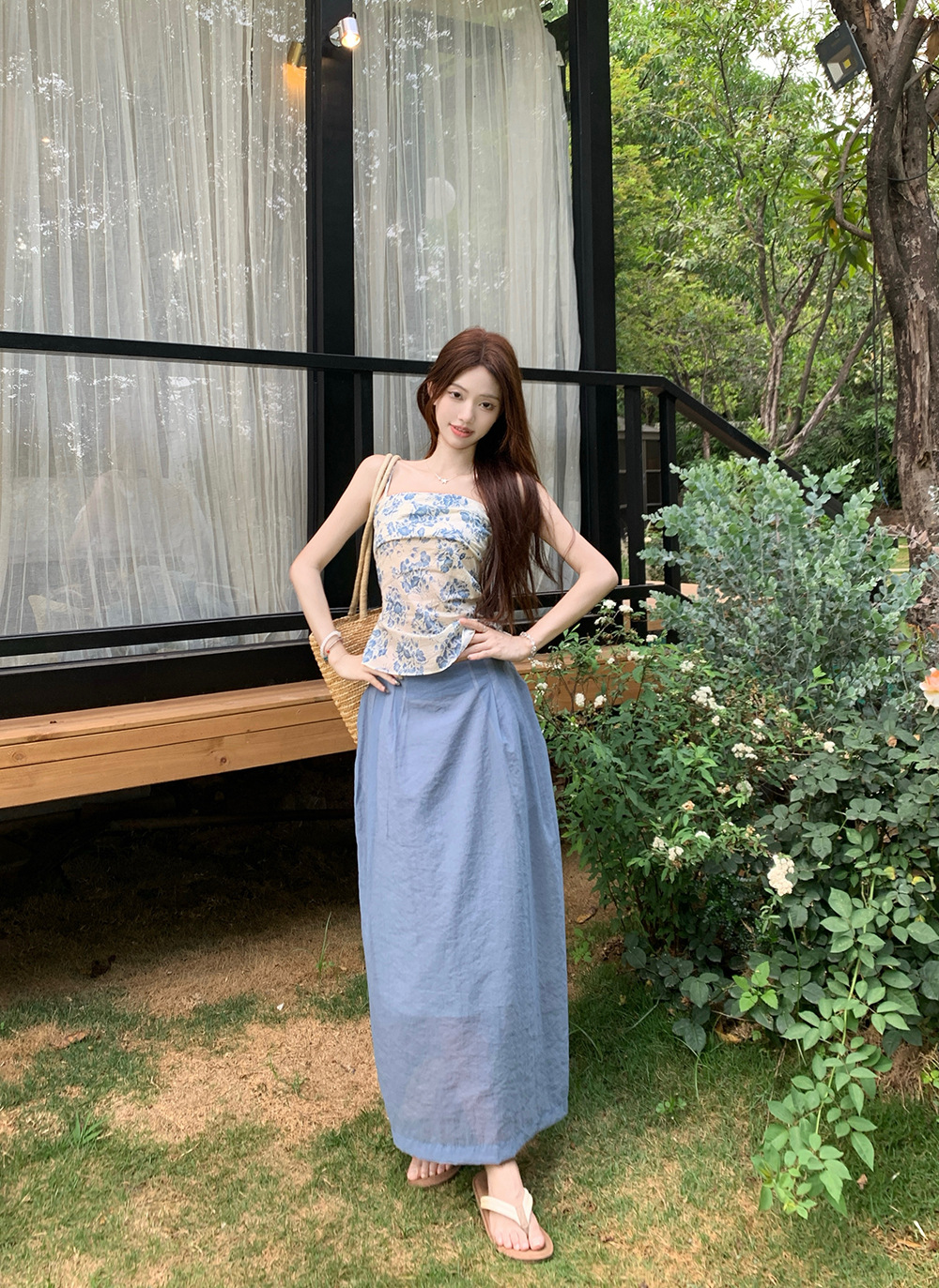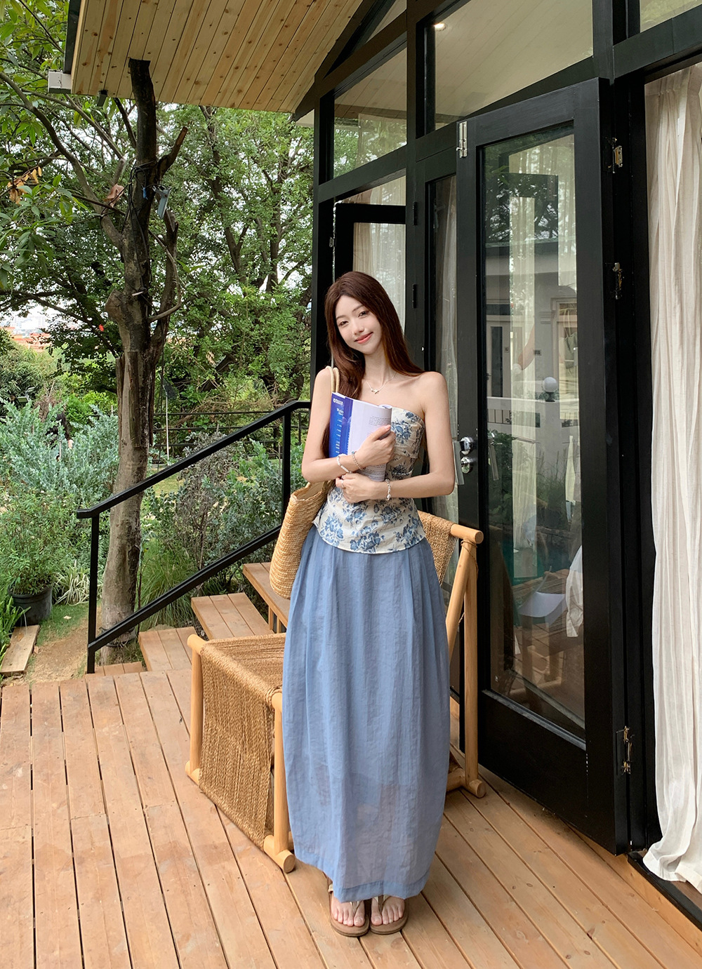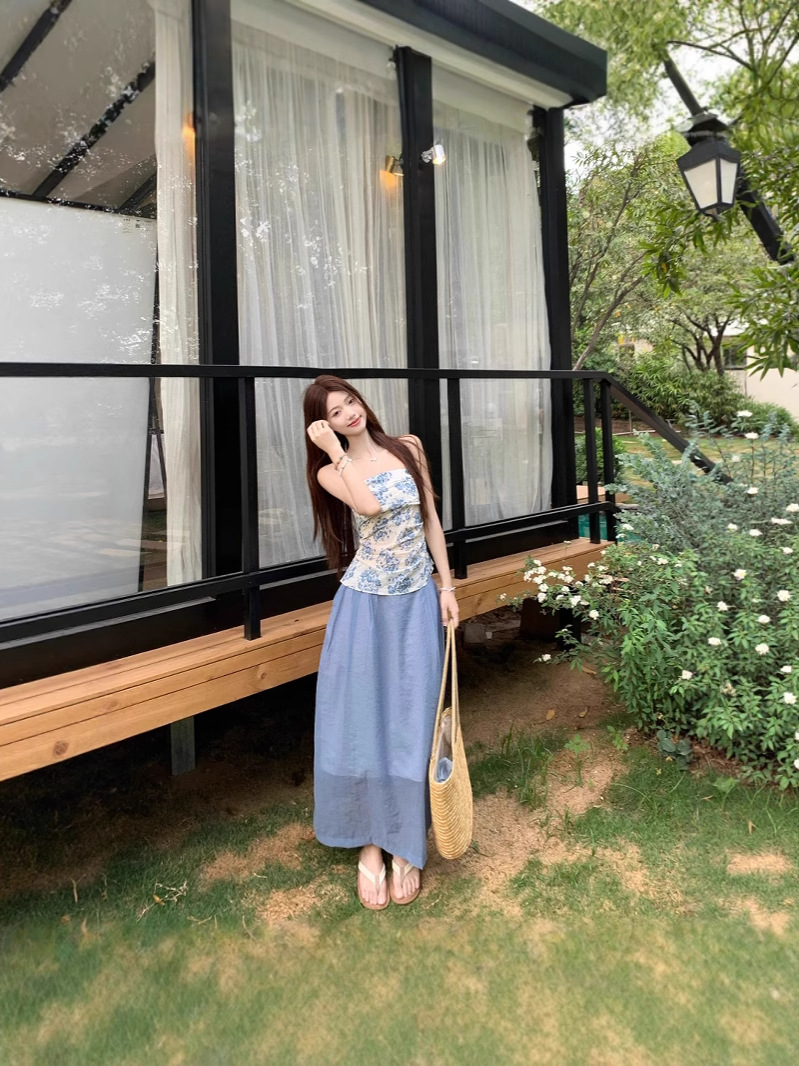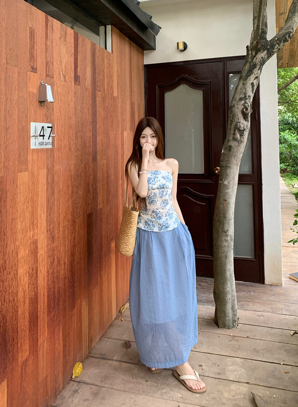 실제 사진 ~ 복고풍 패턴 리조트 스타일 탈착식 서스펜더 여성 비대칭 튜브 탑 + 여성용 중간 길이 스커트스토어 가기