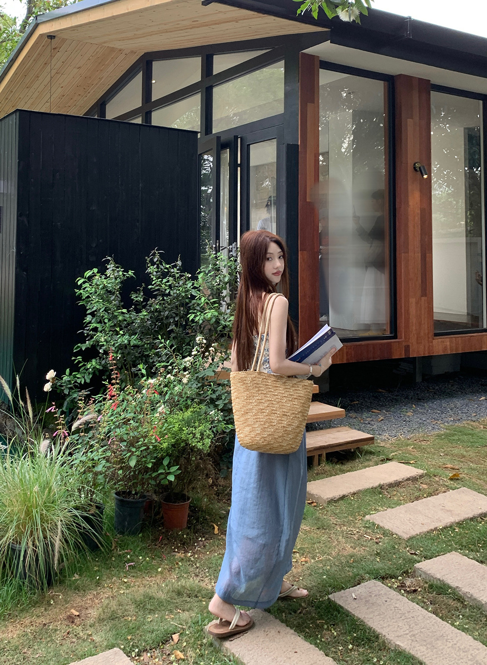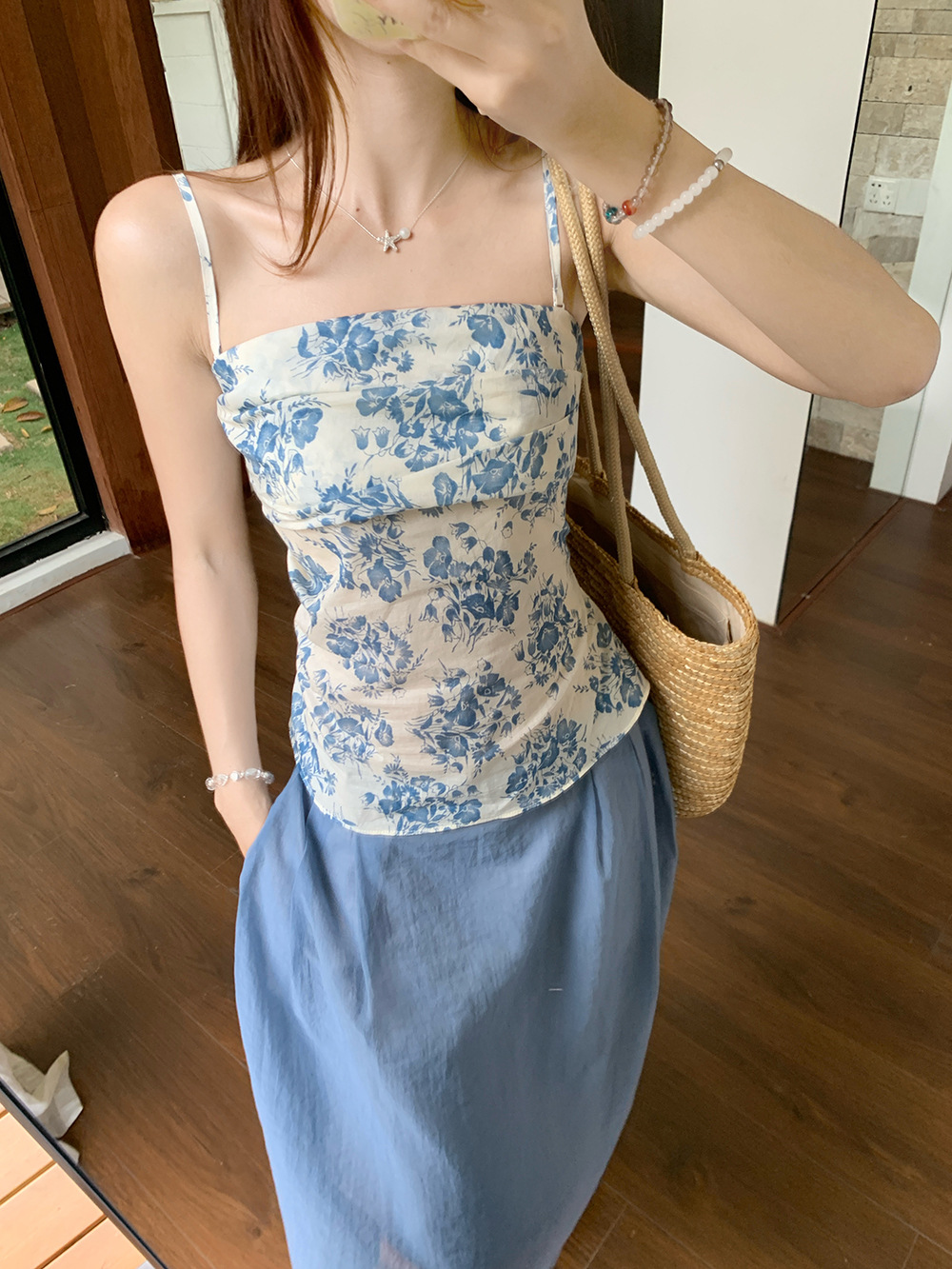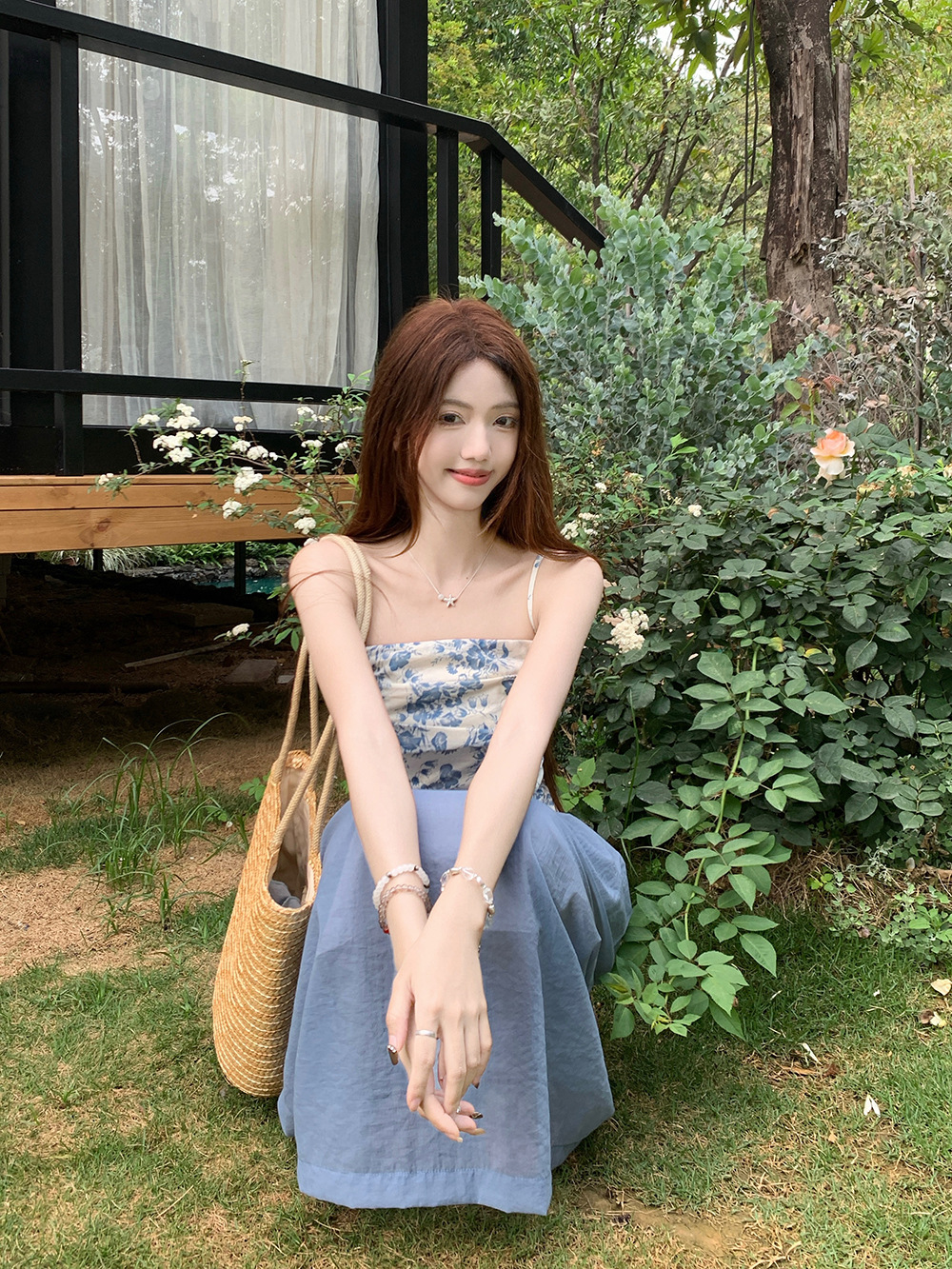 실제 사진 ~ 복고풍 패턴 리조트 스타일 탈착식 서스펜더 여성 비대칭 튜브 탑 + 여성용 중간 길이 스커트스토어 가기