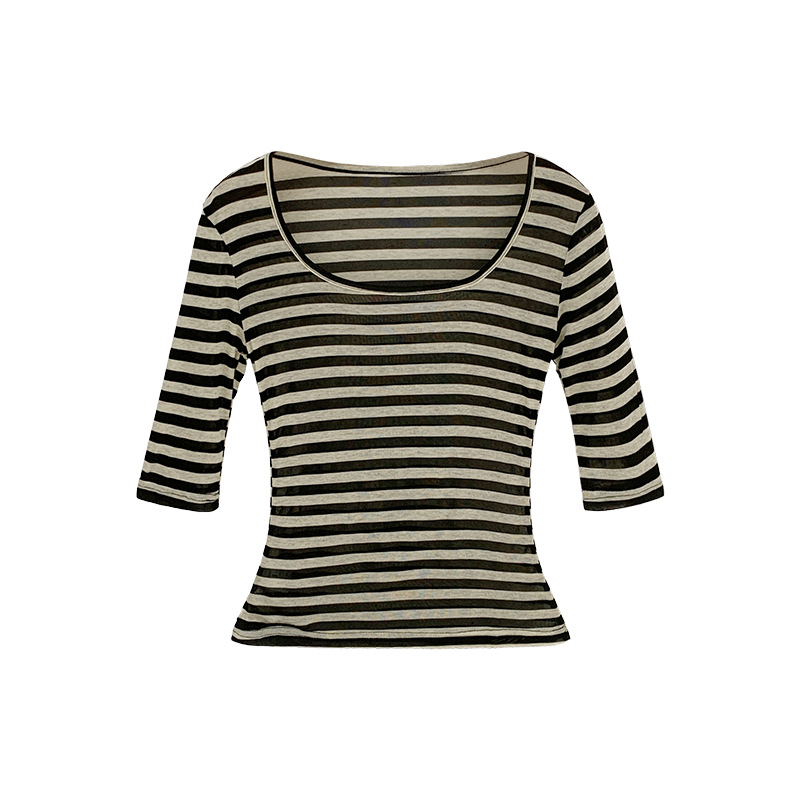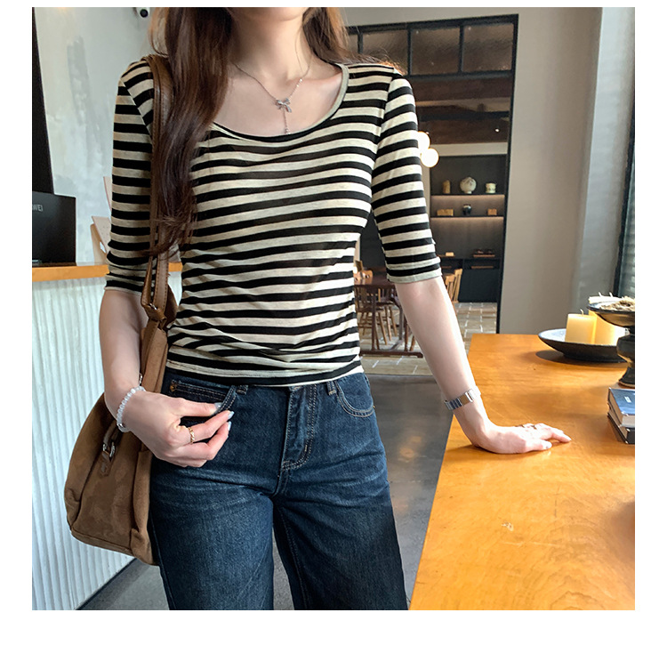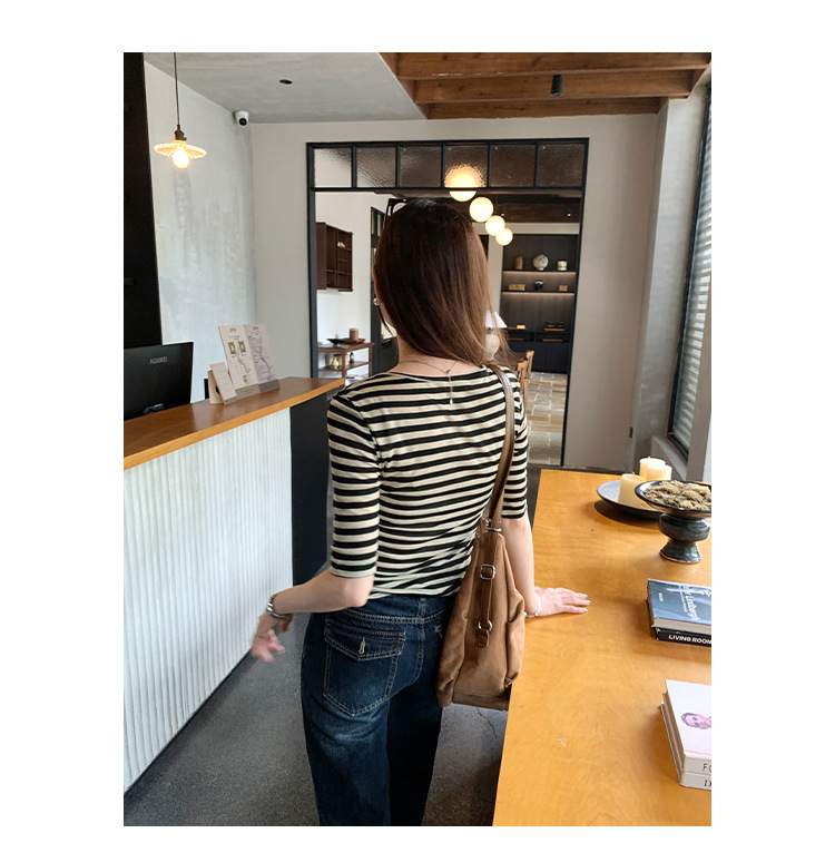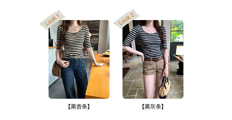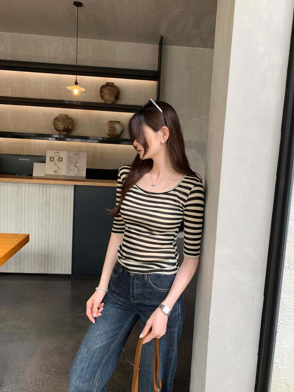 재고 있음 Lyocell Tencel 디자인 스트라이프 대비 색상 여성용 반팔 티셔츠 2025 여름 여성을위한 새로운 아름다운 탑스토어 가기