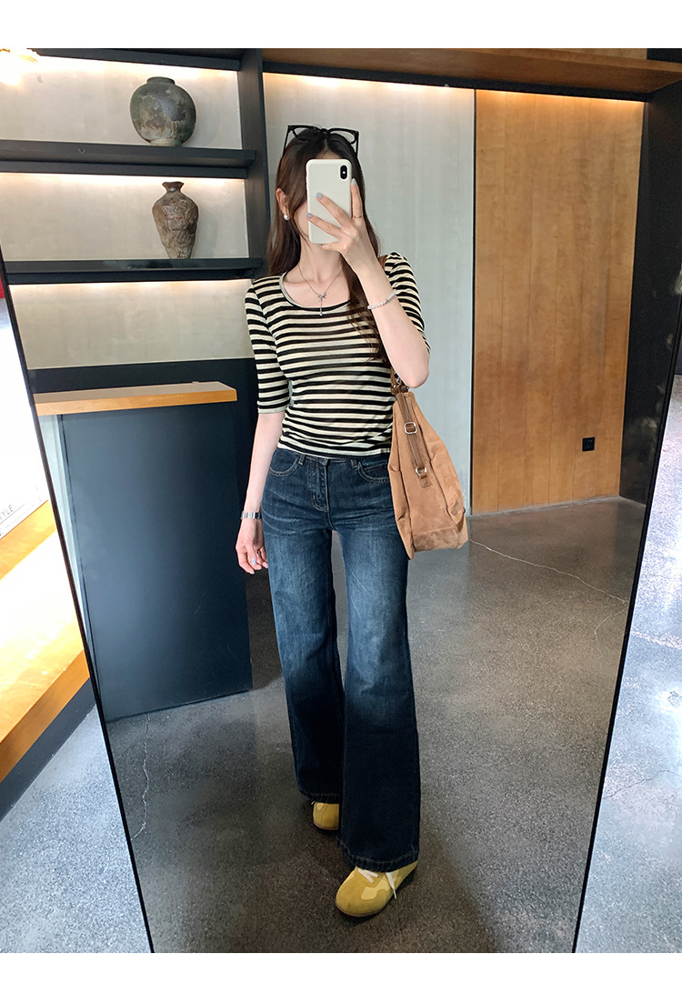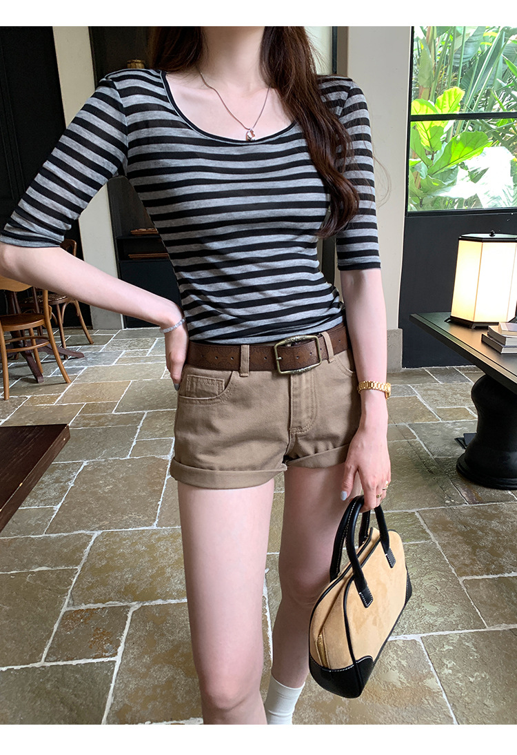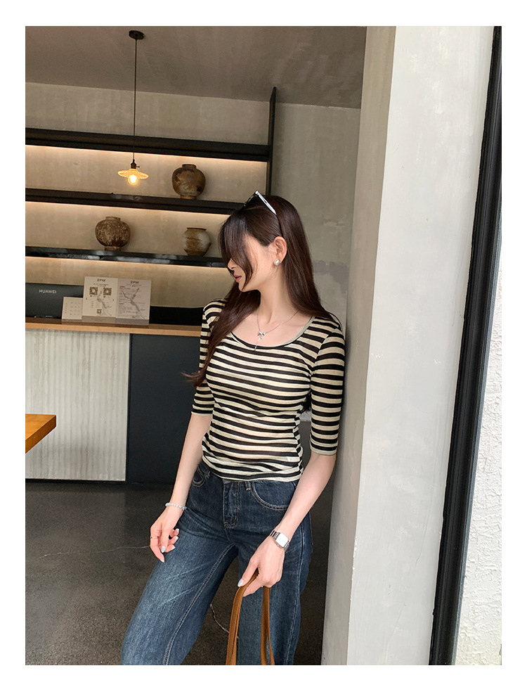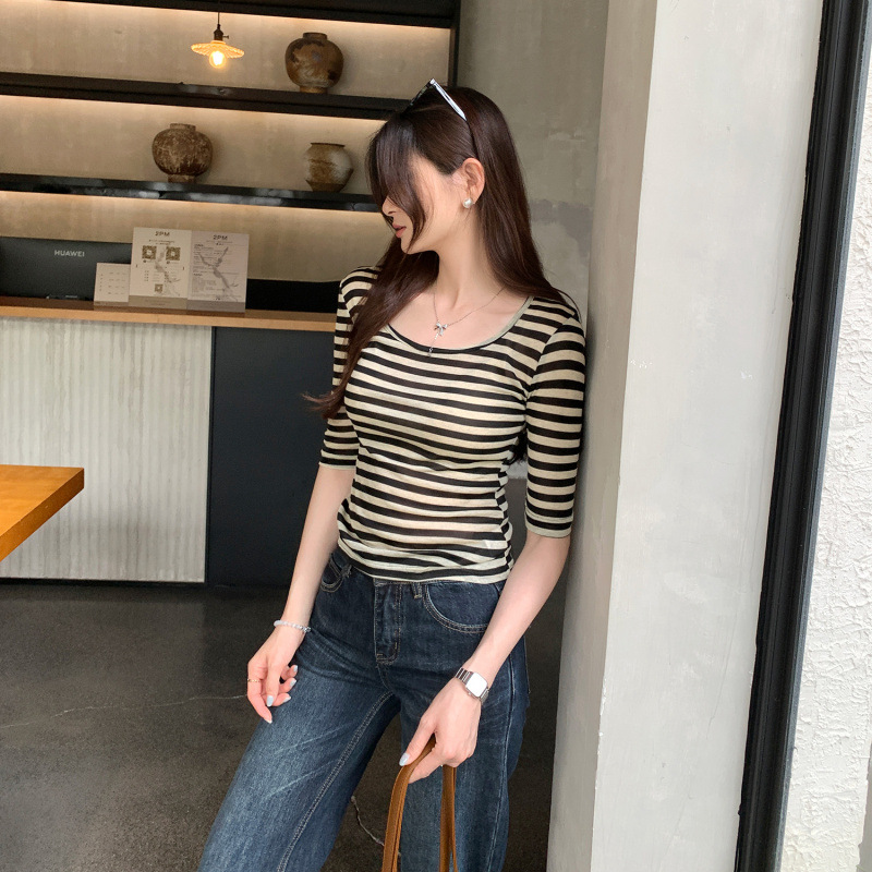재고 있음 Lyocell Tencel 디자인 스트라이프 대비 색상 여성용 반팔 티셔츠 2025 여름 여성을위한 새로운 아름다운 탑스토어 가기