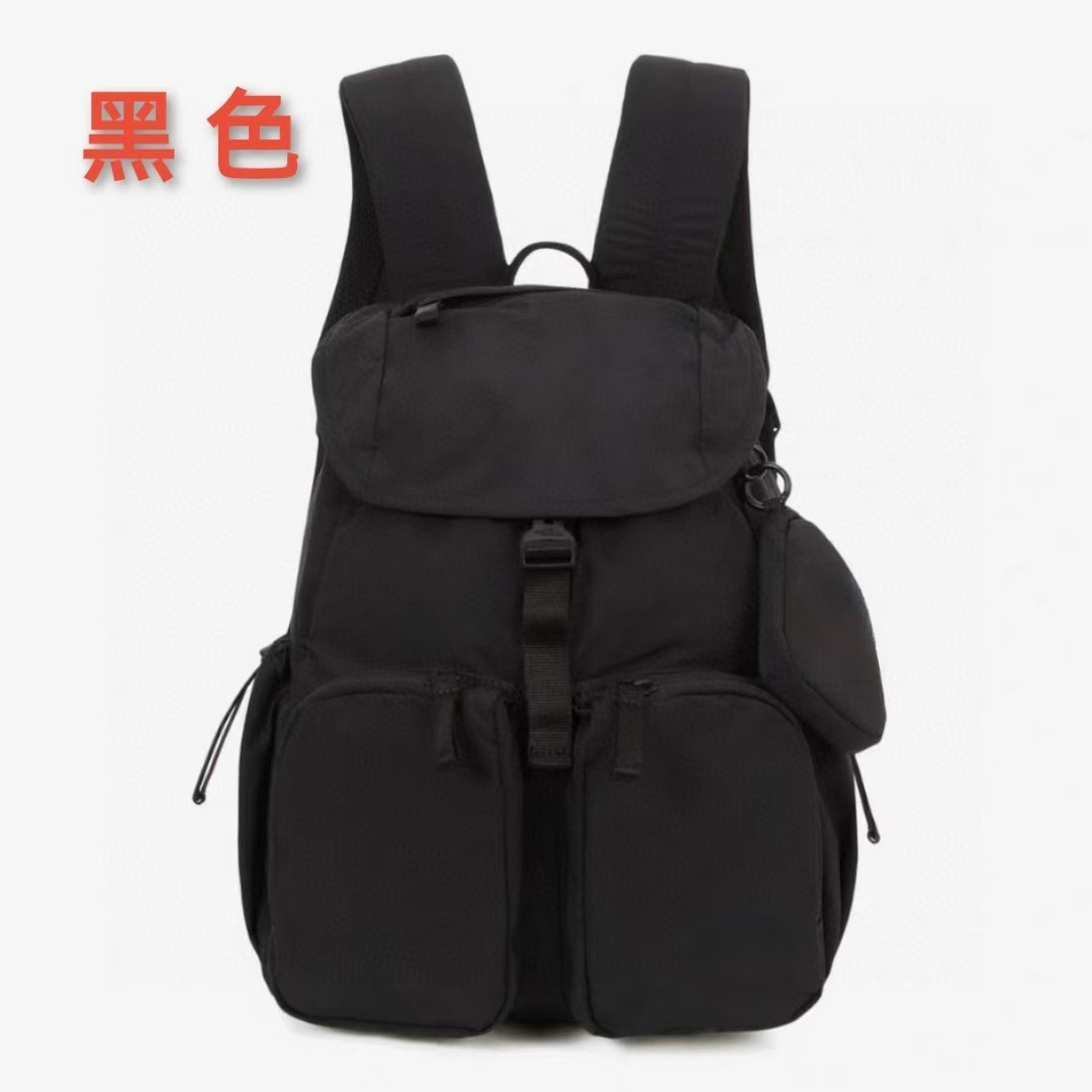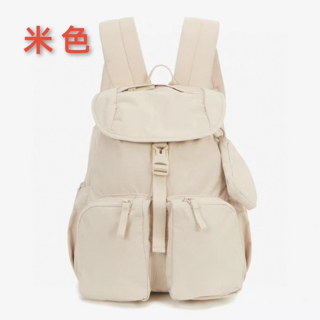 这是一款使用轻便耐用的尼龙材料的翻盖式日常背包。带扣便于打开翻盖,内绳再次收紧,以确保您的物品安全。背面的拉链便于取用包中的物品。它是一个背包,翻盖上有一个拉链口袋,前面有两个口袋,背面还有一个可以收紧的口袋。内部设有一个拉链口袋和一个可拆卸口袋。能收藏卡、耳机的半圆形的门是定构成。