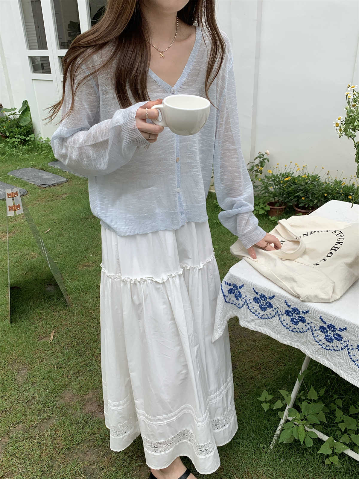 우아한 V 넥 분위기 여름 얇은 Ins 슬럽 선 스크린 코트 긴팔 니트 탑 여성용 외부 카디건