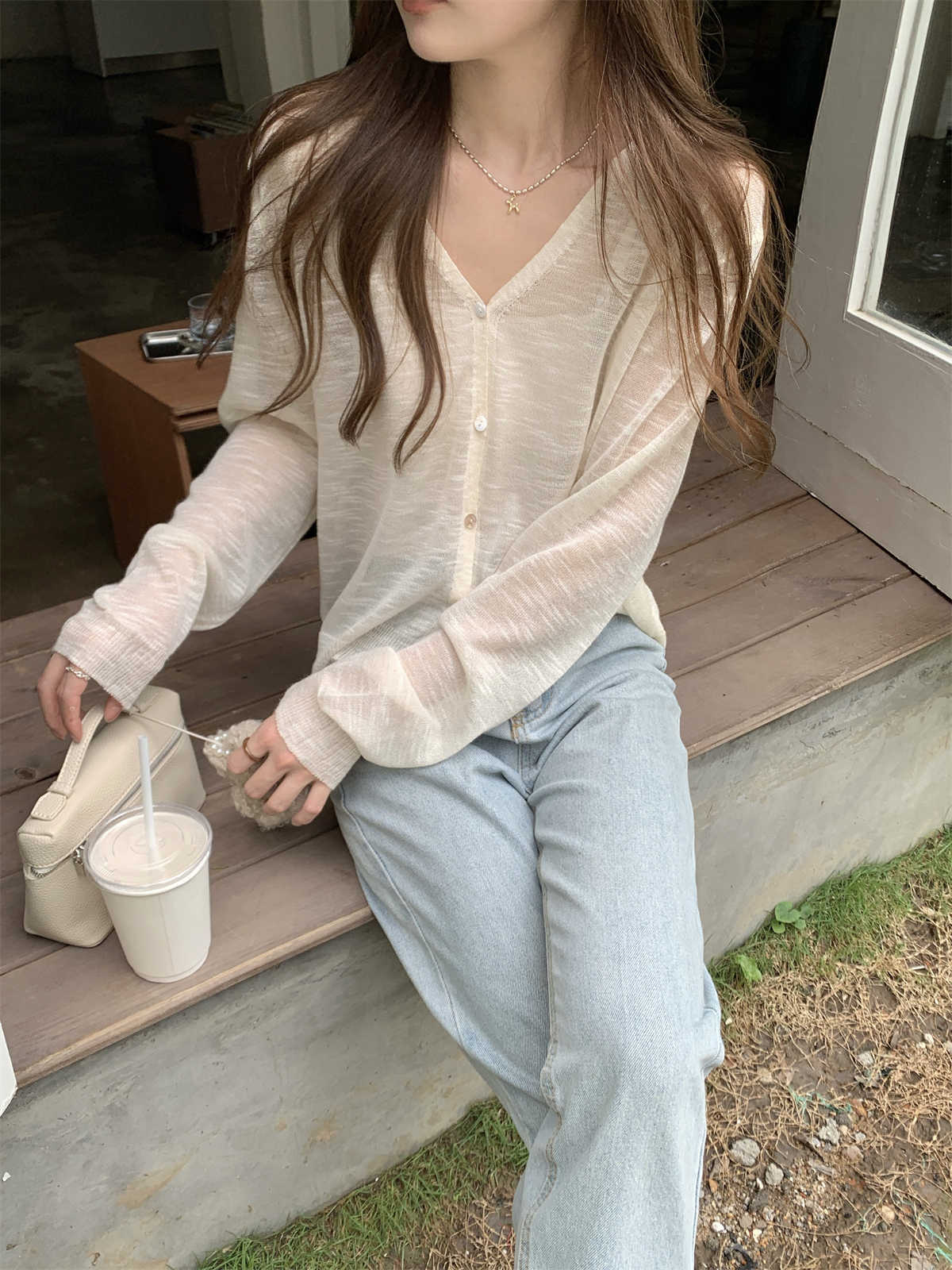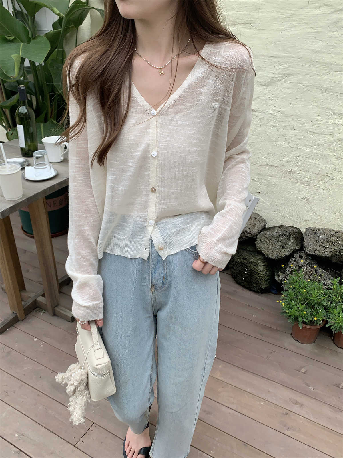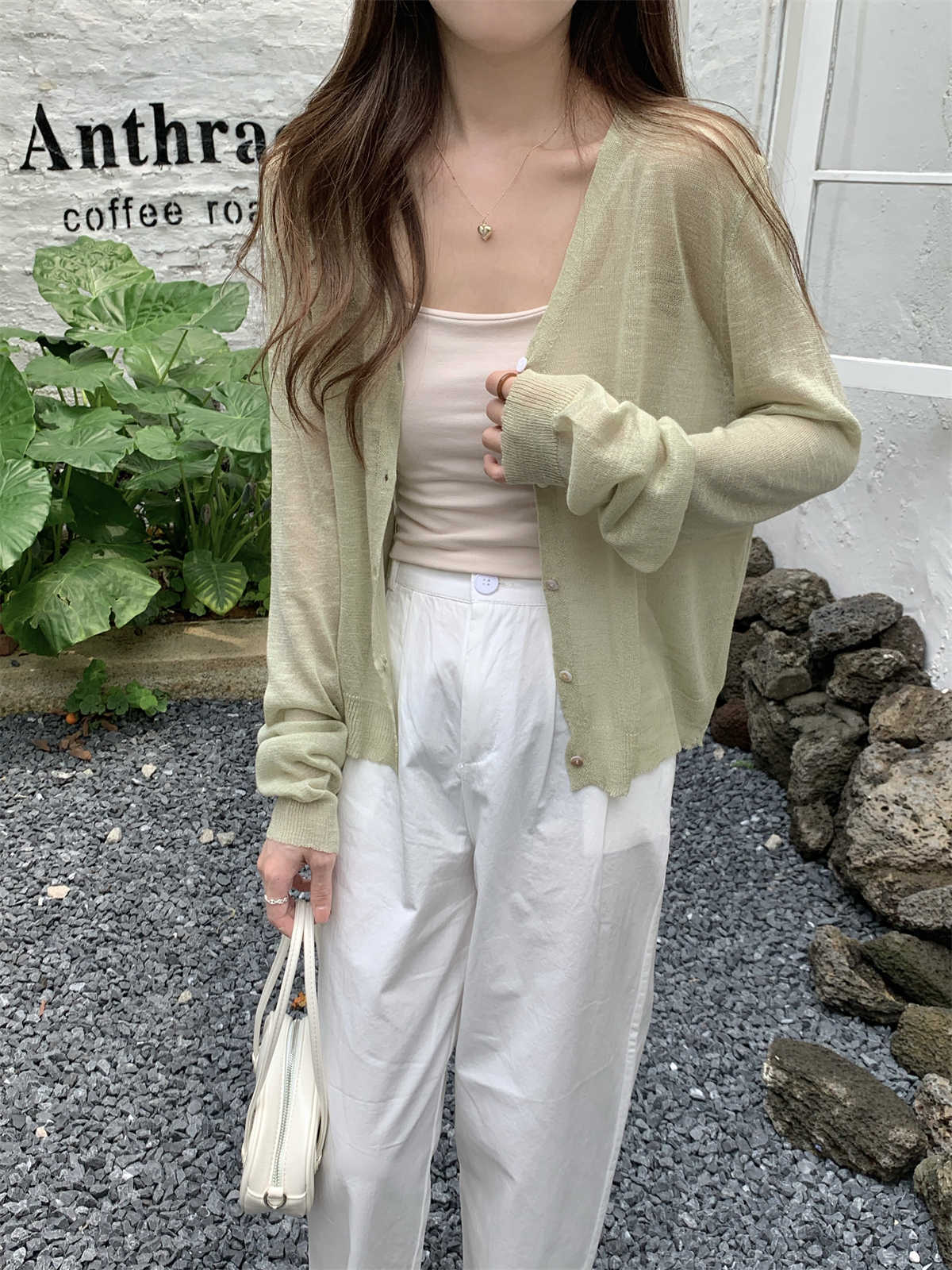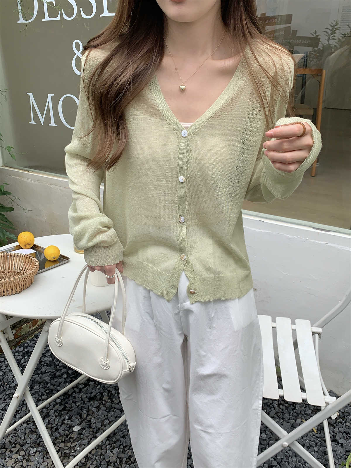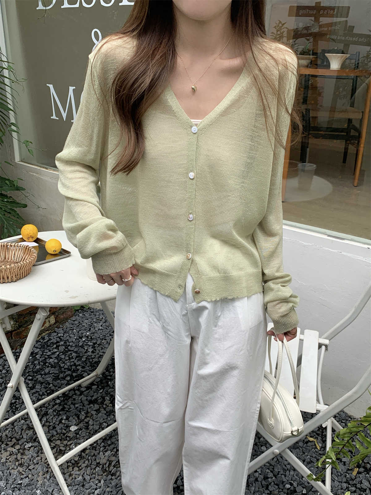 우아한 V 넥 분위기 여름 얇은 Ins 슬럽 선 스크린 코트 긴팔 니트 탑 여성용 외부 카디건스토어 가기
