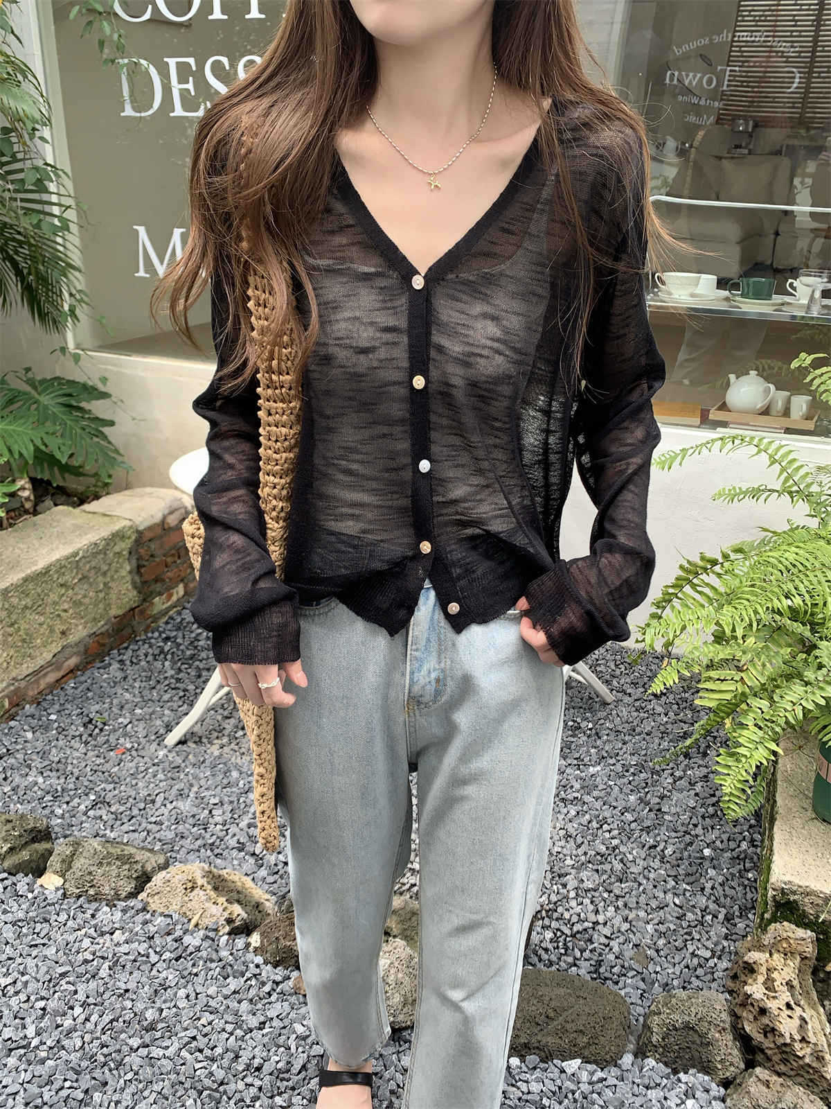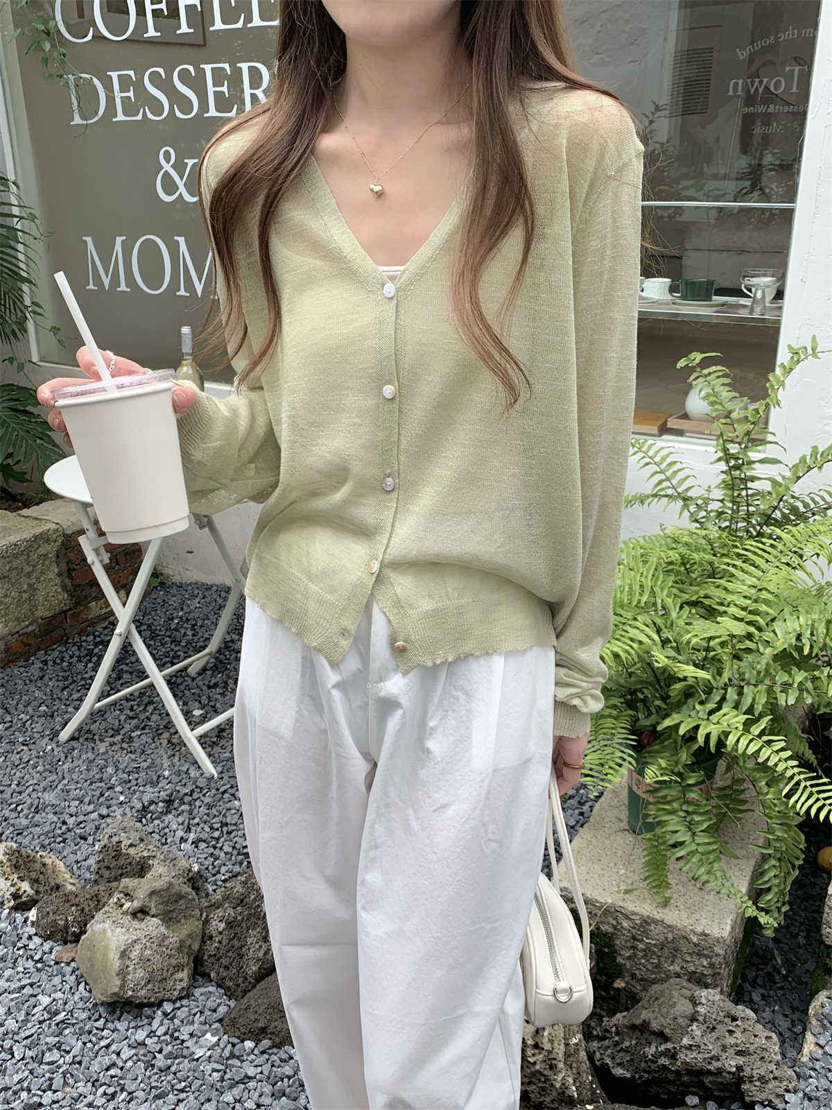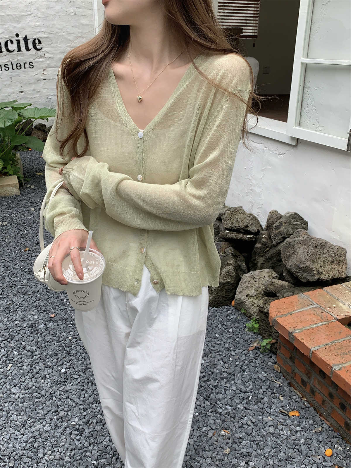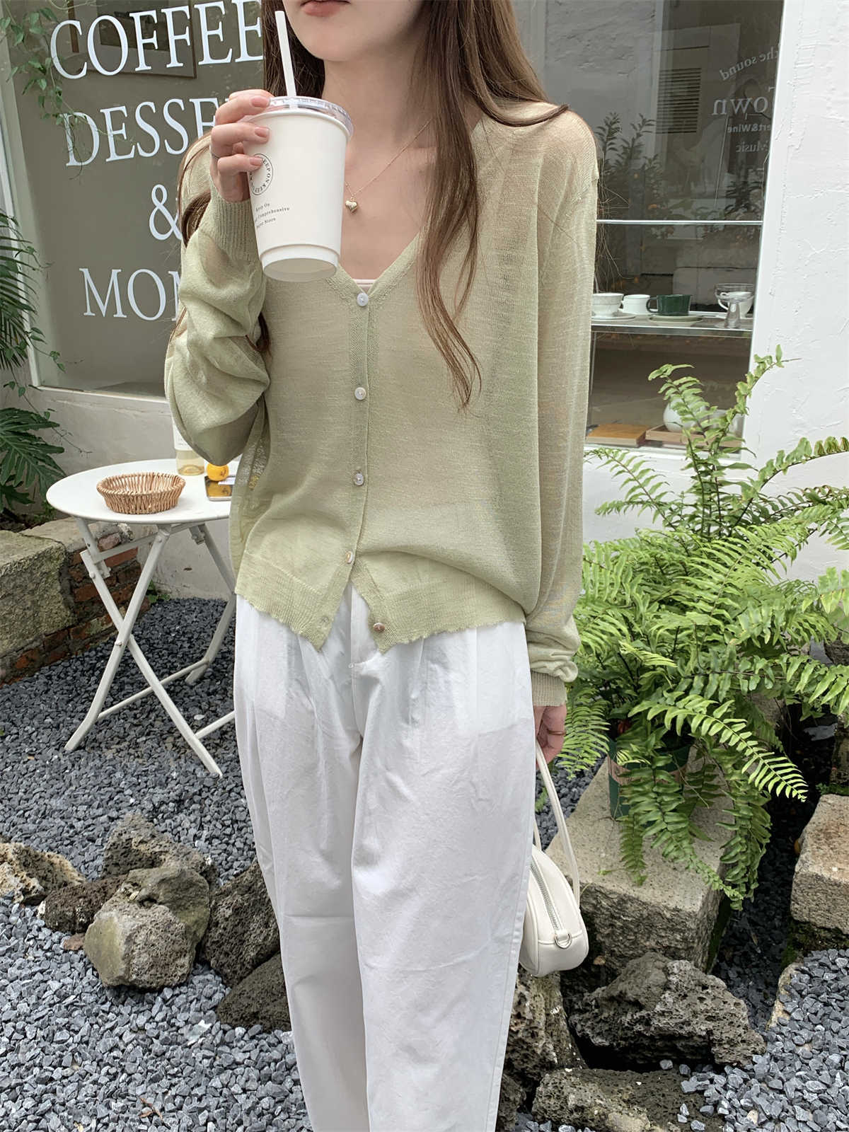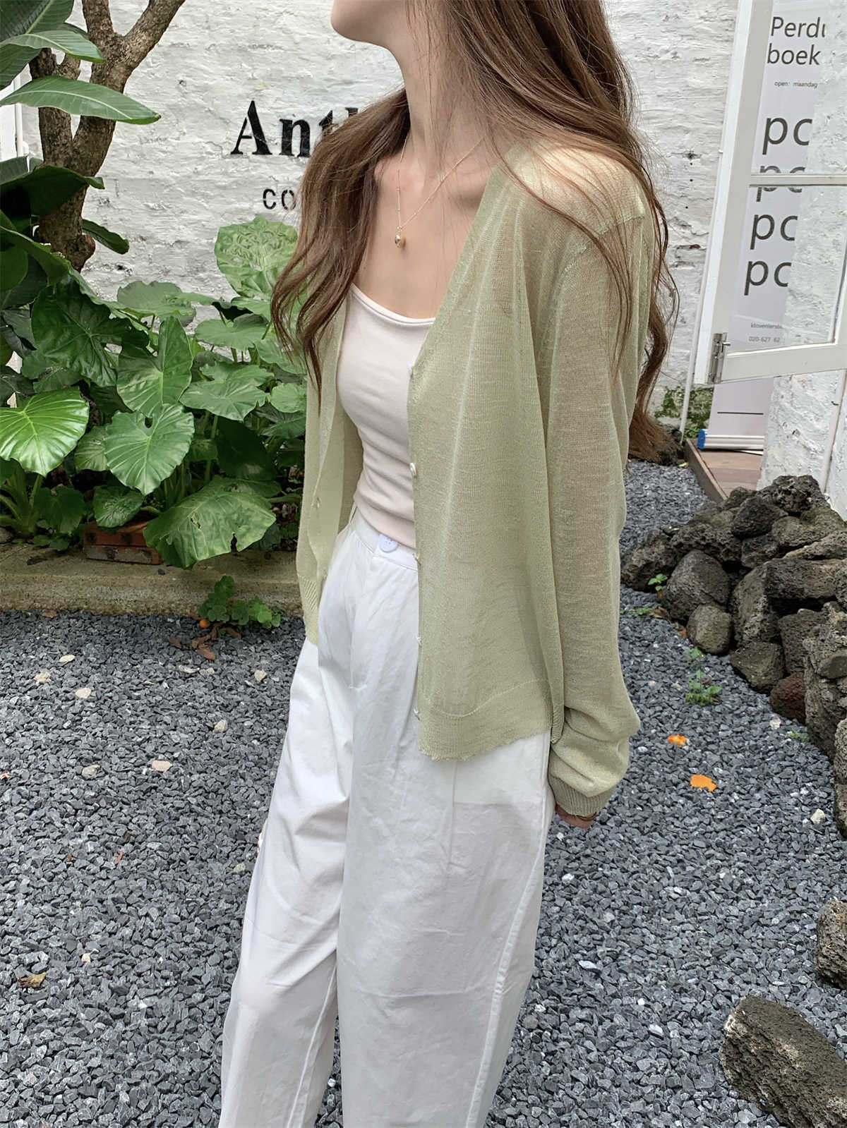 우아한 V 넥 분위기 여름 얇은 Ins 슬럽 선 스크린 코트 긴팔 니트 탑 여성용 외부 카디건스토어 가기
