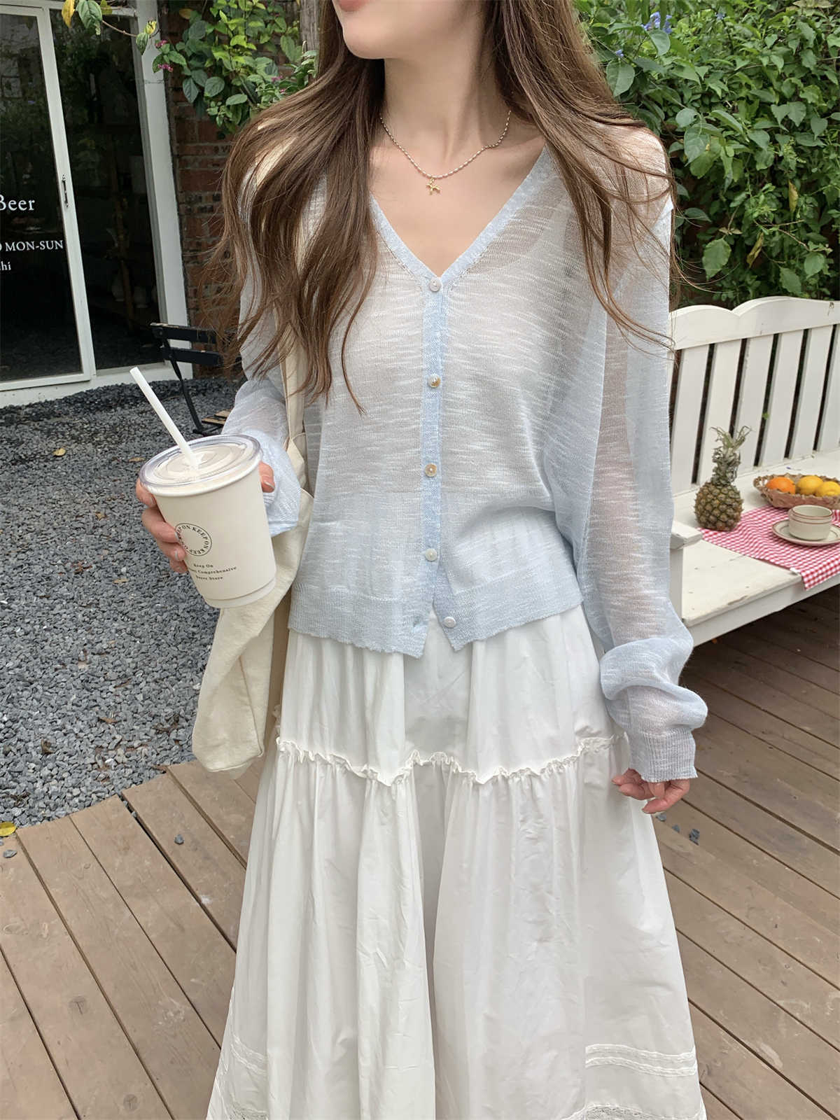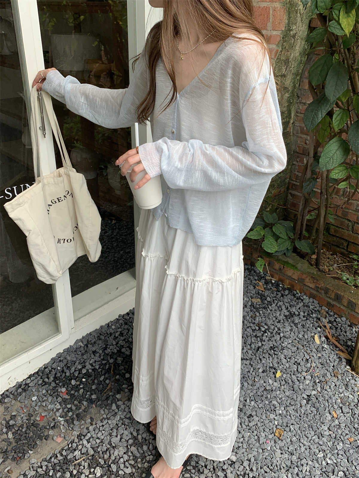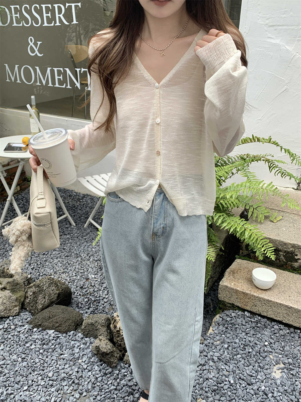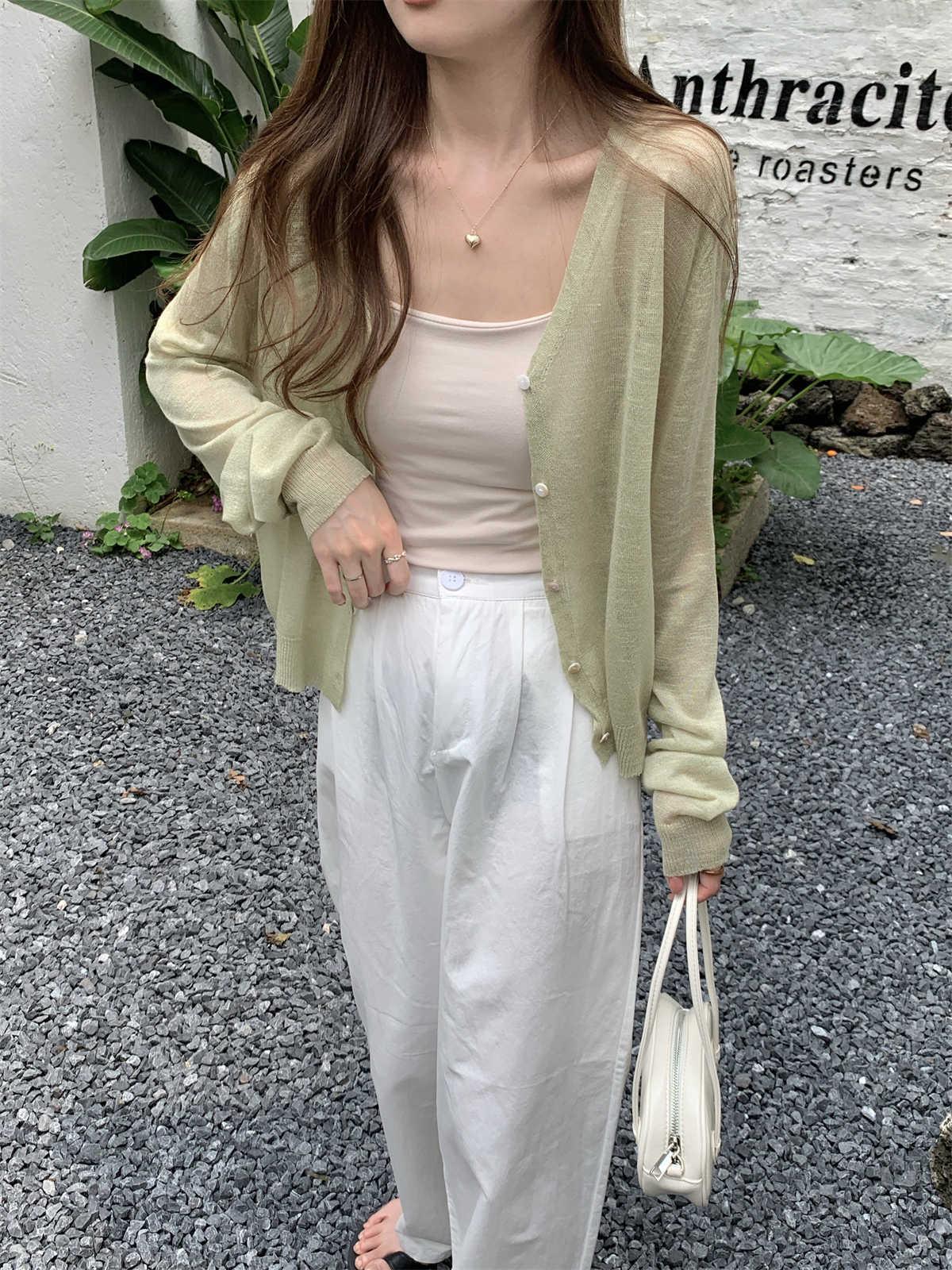 우아한 V 넥 분위기 여름 얇은 Ins 슬럽 선 스크린 코트 긴팔 니트 탑 여성용 외부 카디건스토어 가기