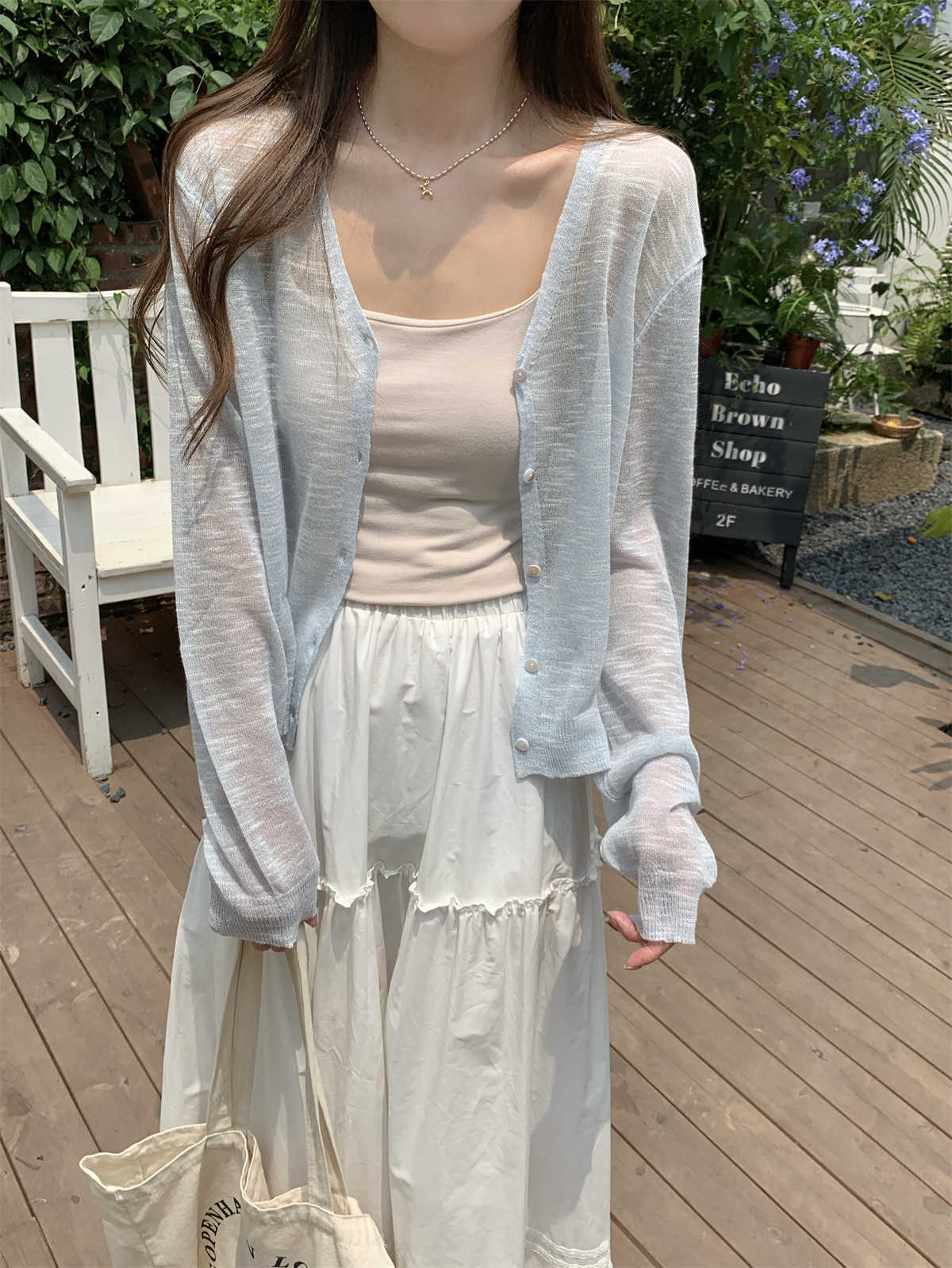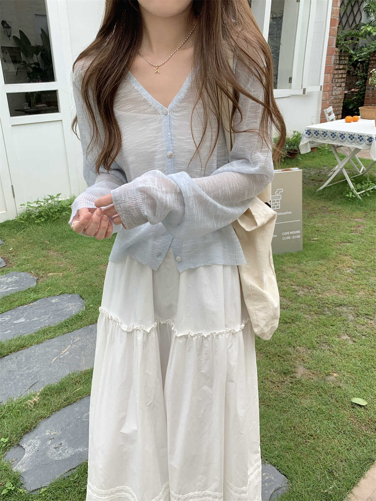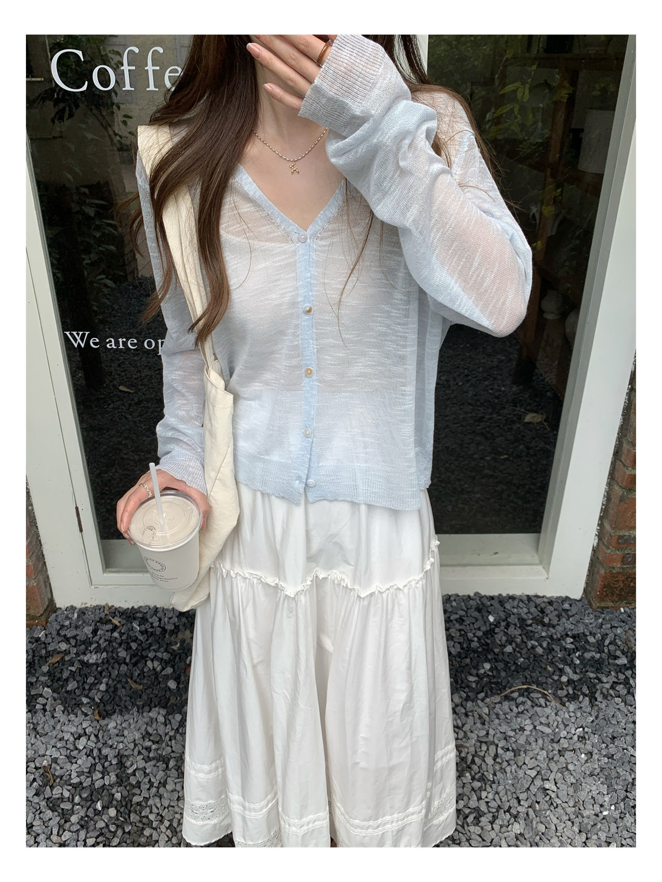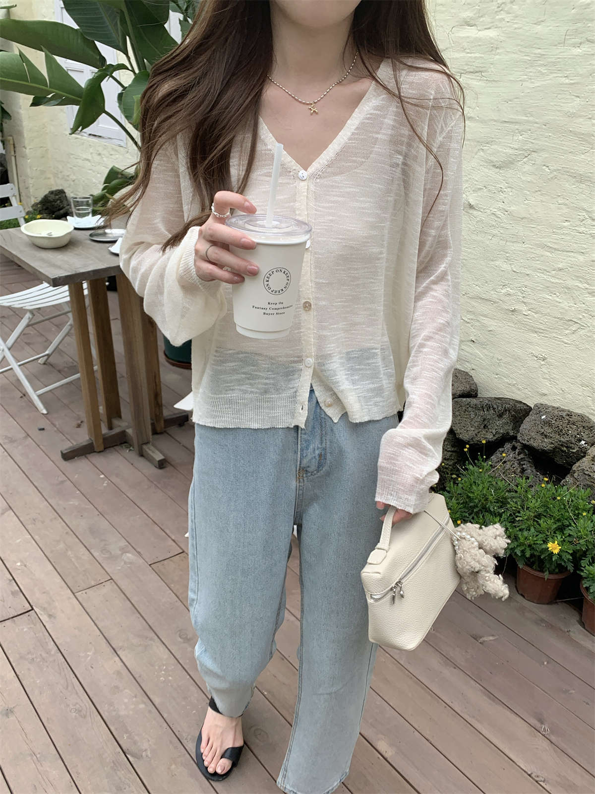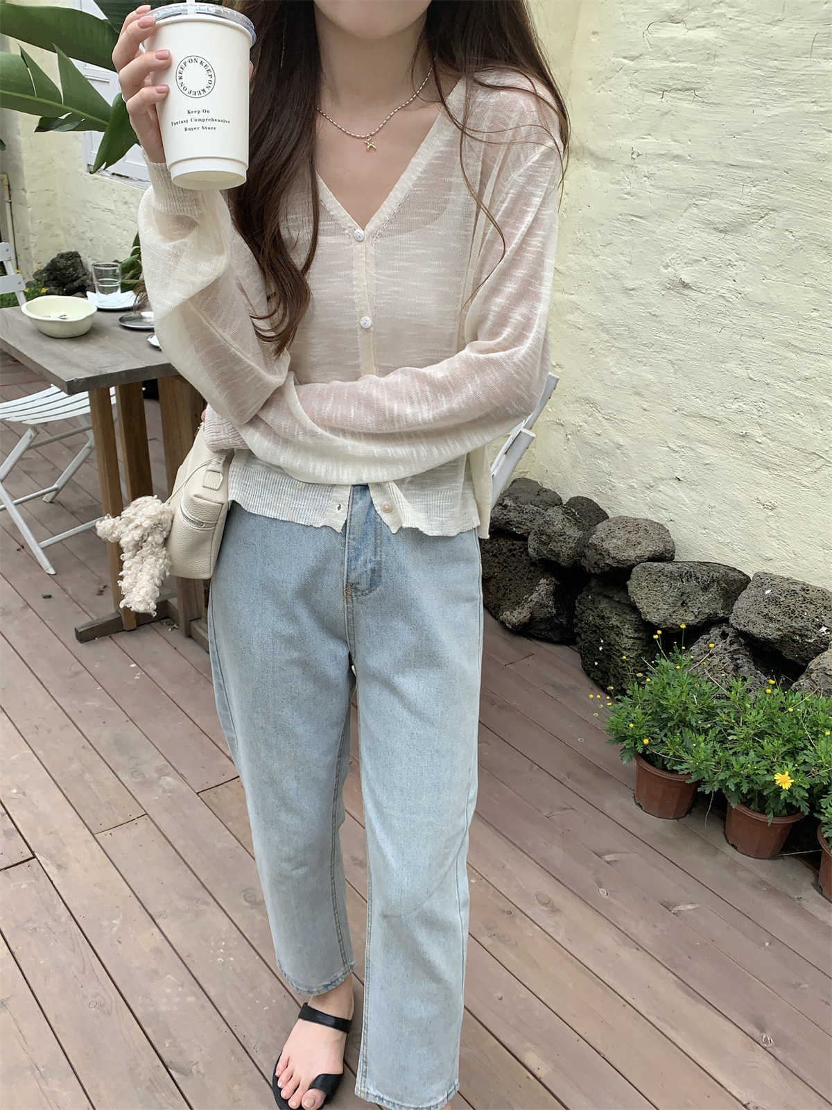 우아한 V 넥 분위기 여름 얇은 Ins 슬럽 선 스크린 코트 긴팔 니트 탑 여성용 외부 카디건스토어 가기