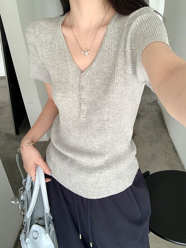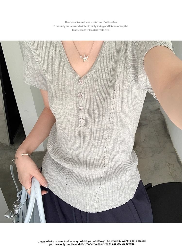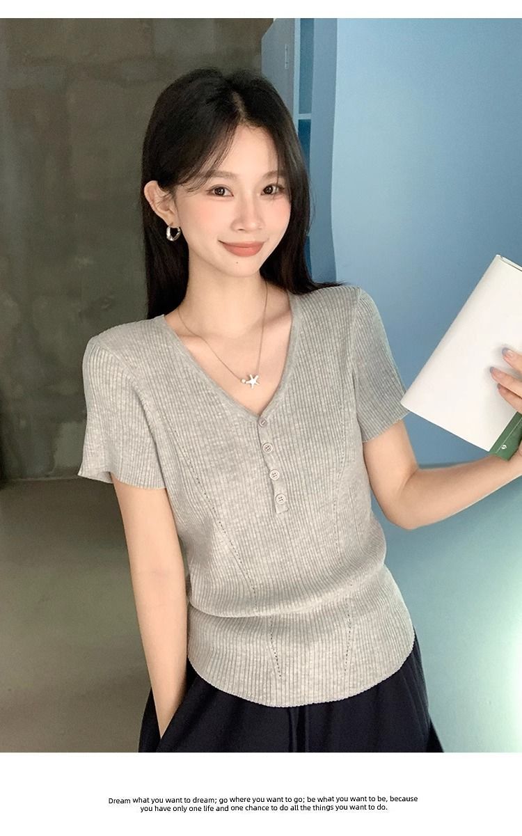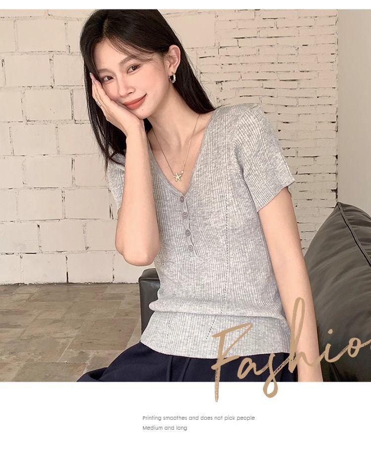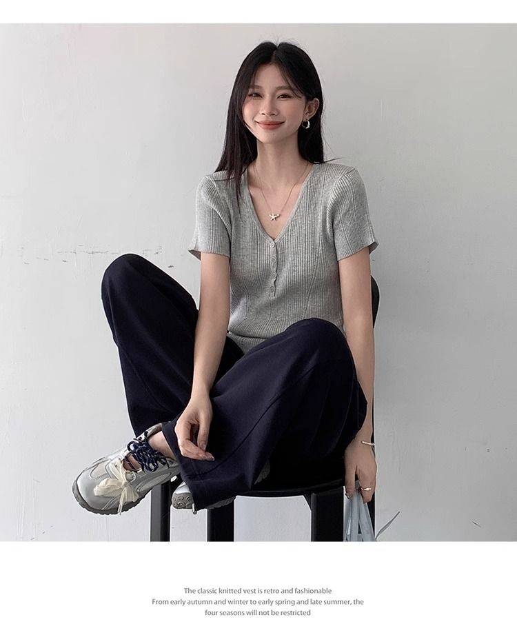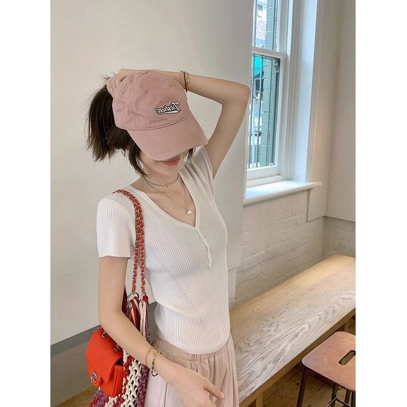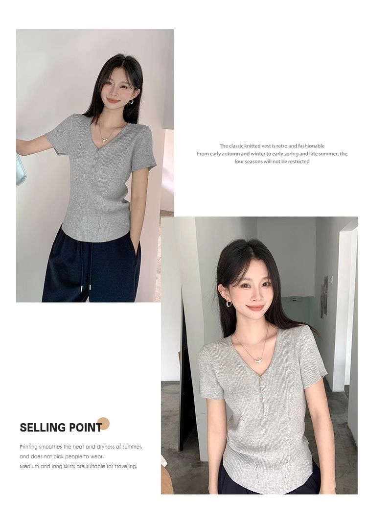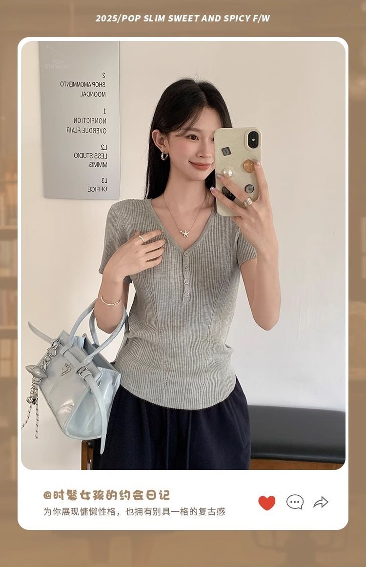 퓨어 데시르트 스타일의 V넥 넓은 네크라인 니트 반팔 티셔츠 여성용 2026 여름 신상 슬림핏 숏탑스토어 가기