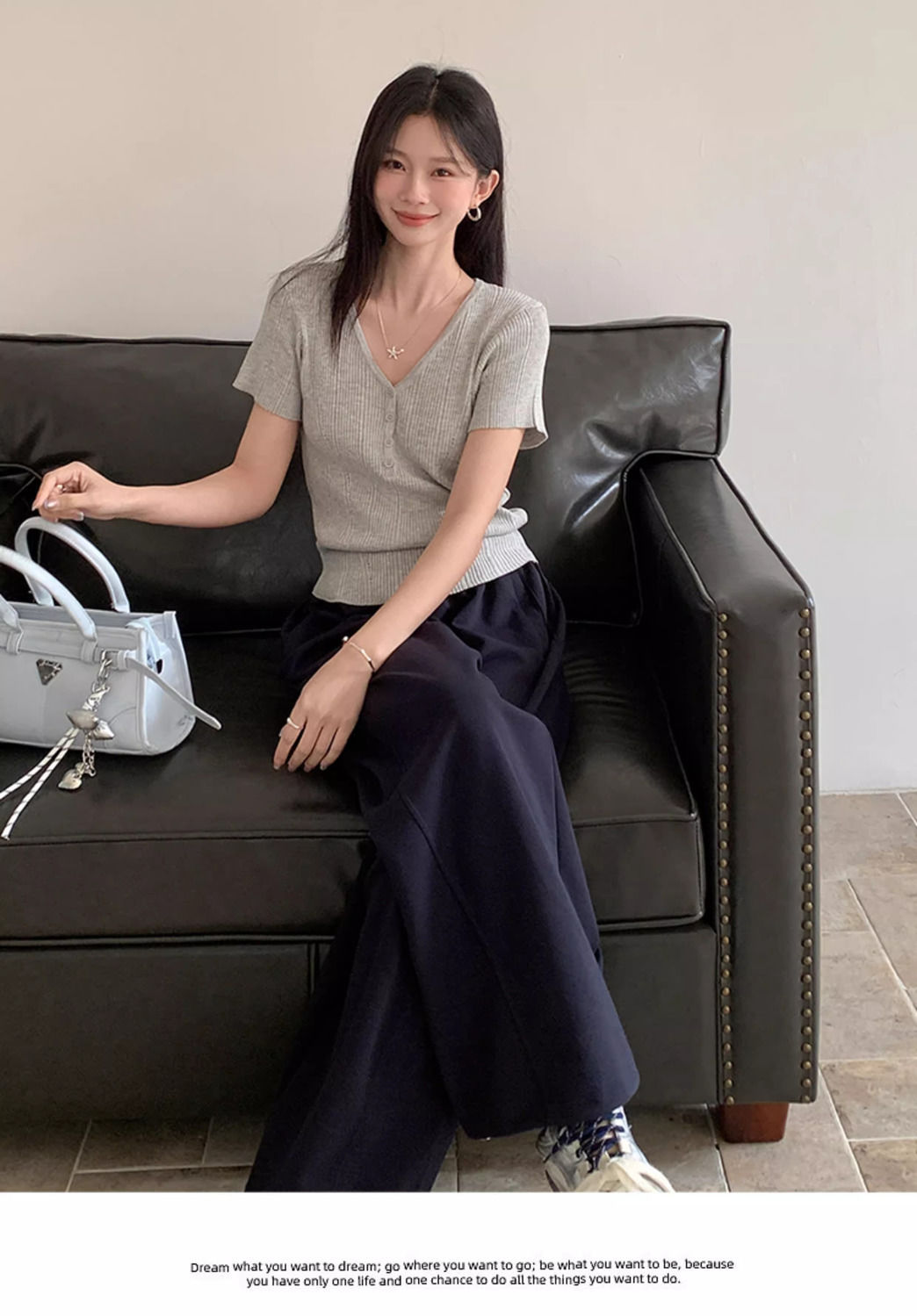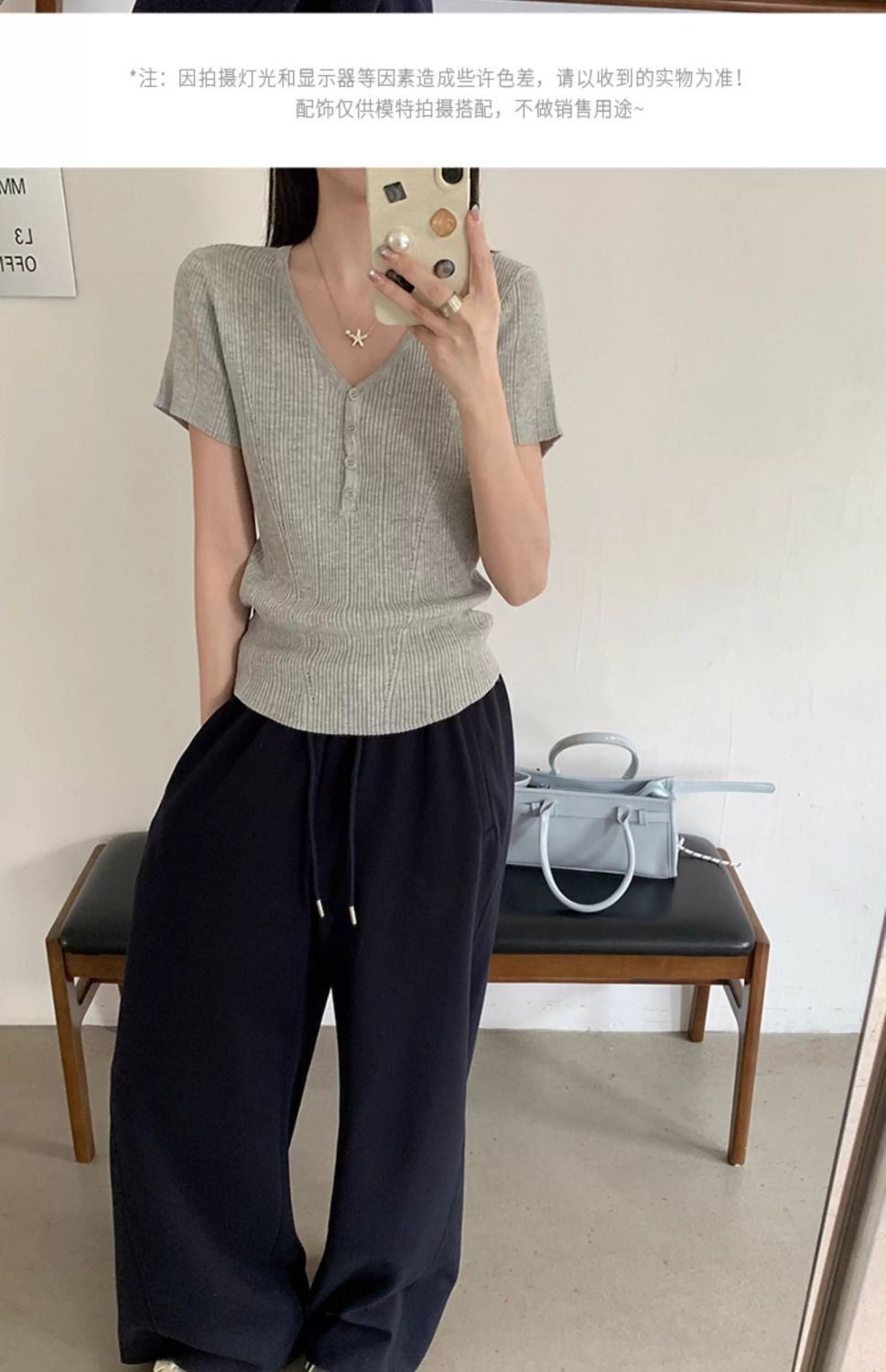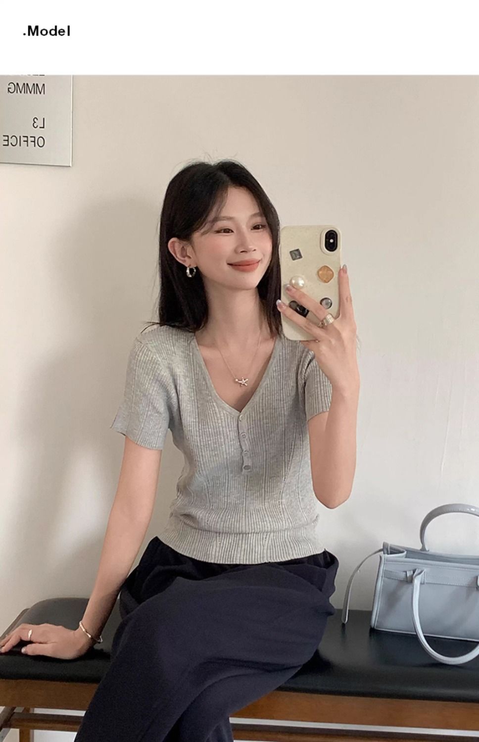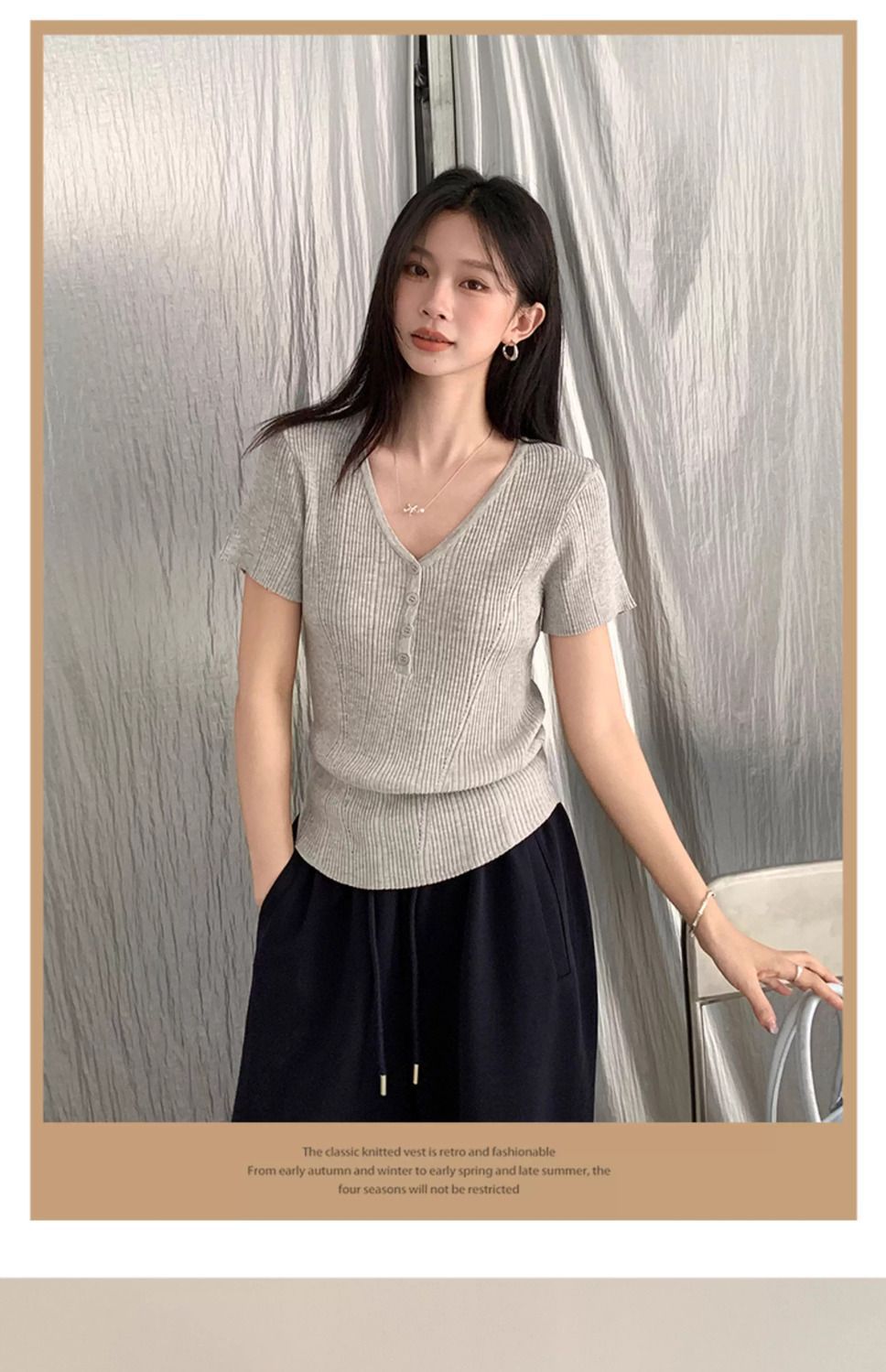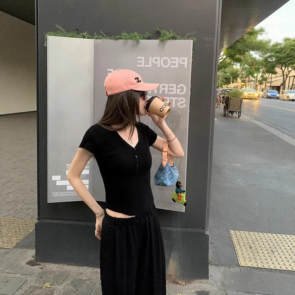 퓨어 데시르트 스타일의 V넥 넓은 네크라인 니트 반팔 티셔츠 여성용 2026 여름 신상 슬림핏 숏탑스토어 가기