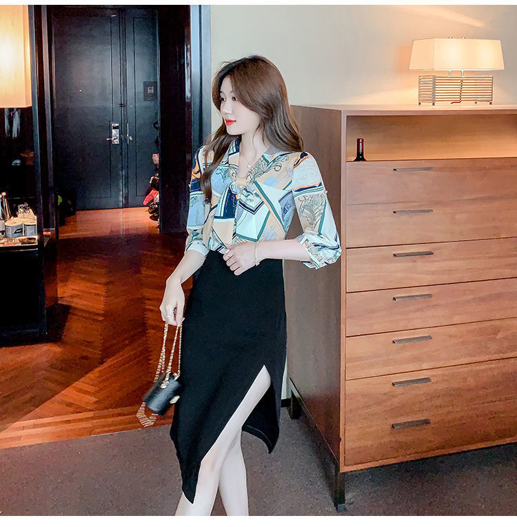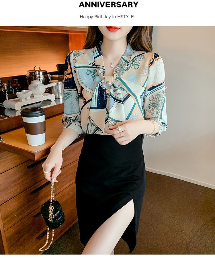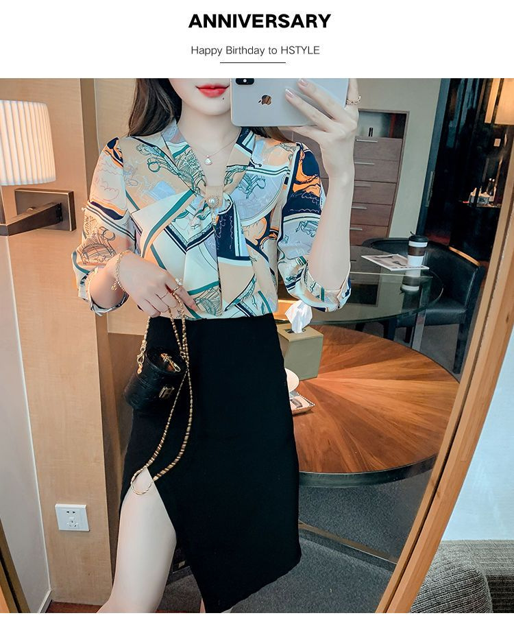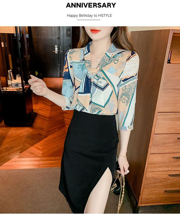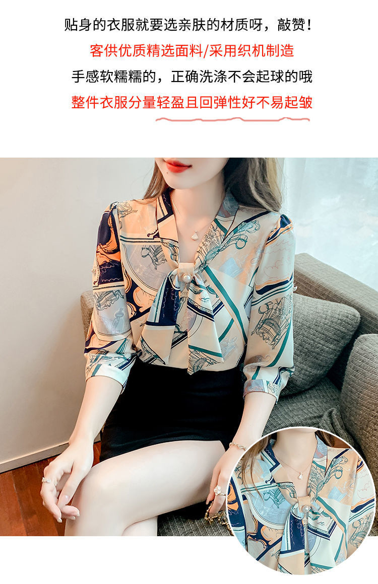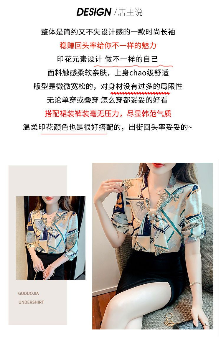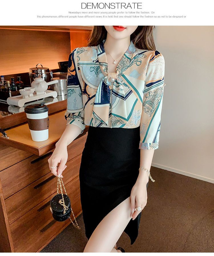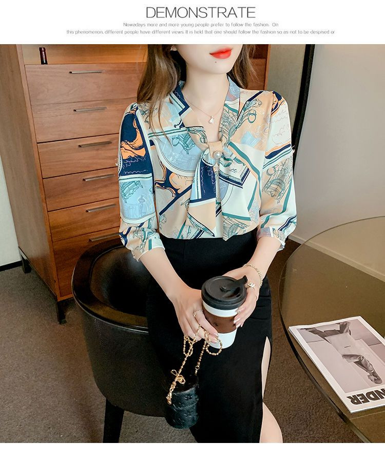 봄 여름 새로운 디자인 기질 셔츠 긴팔 탑 7부 소매 프린트 쉬폰 셔츠 여성 의류스토어 가기