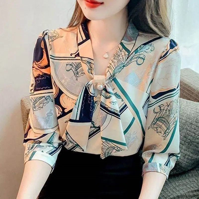 봄 여름 새로운 디자인 기질 셔츠 긴팔 탑 7부 소매 프린트 쉬폰 셔츠 여성 의류