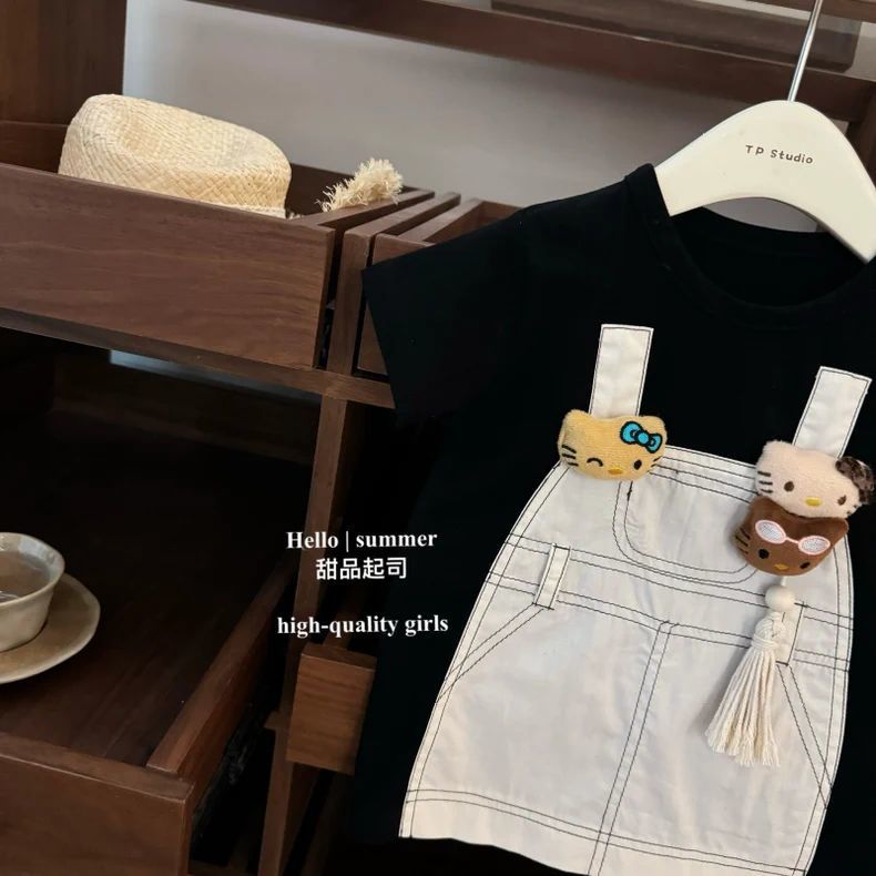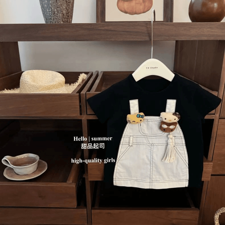 귀여운 크리티컬!한국판 여아 가짜 투피스 서스펜더 베이비 반팔 스타일 스커트 티셔츠 아동 여름 신작