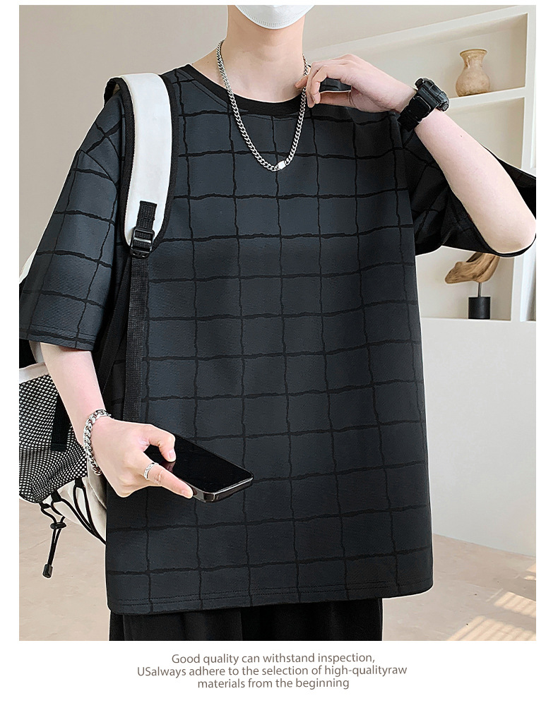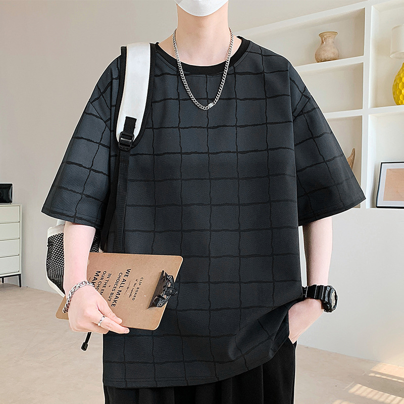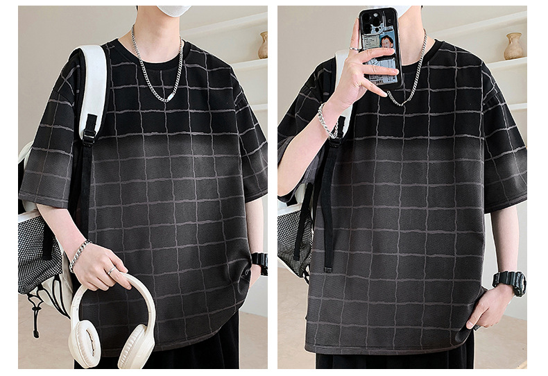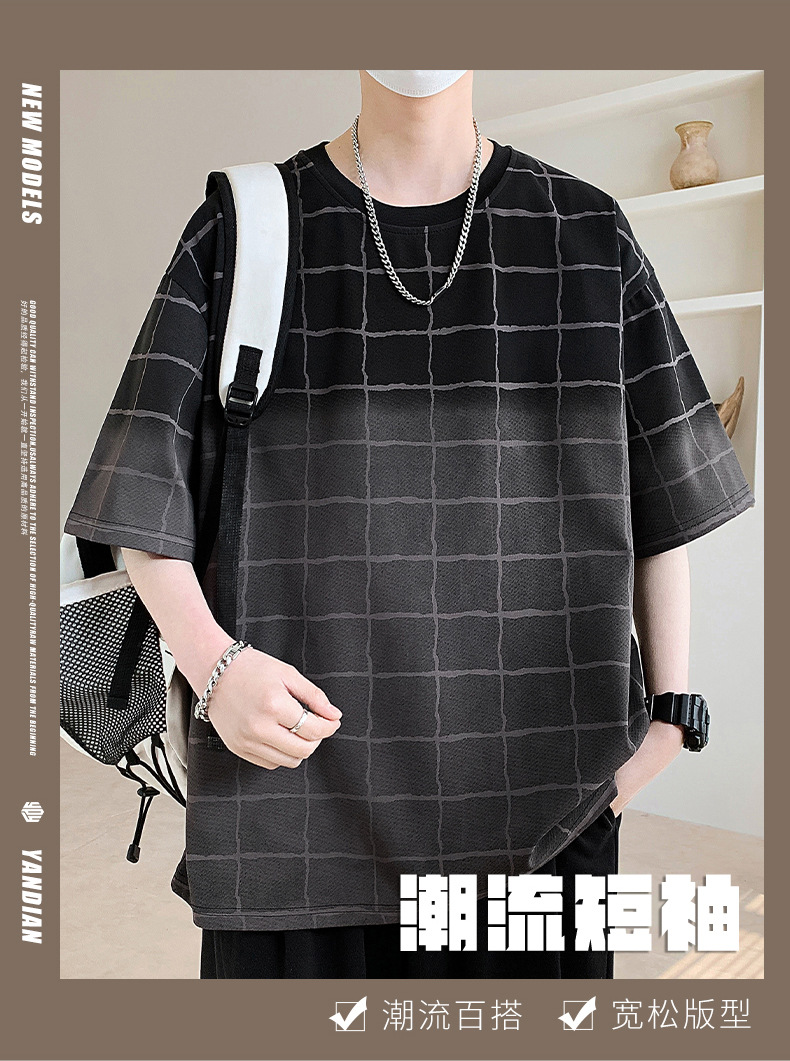 여름 새로운 점진적 색상 반팔 남성 격자 무늬 십대 패션 브랜드 캐주얼 느슨한 반소매 티셔츠 홍콩 스타일 남성복