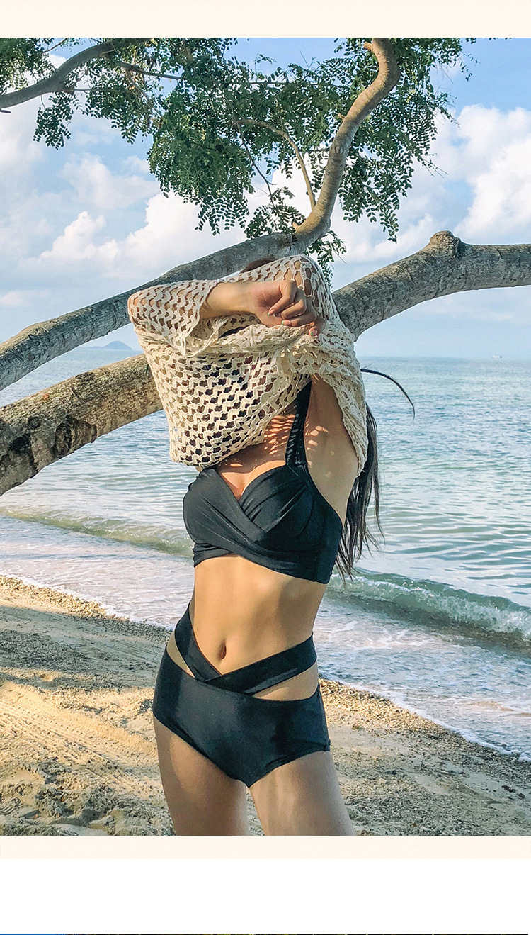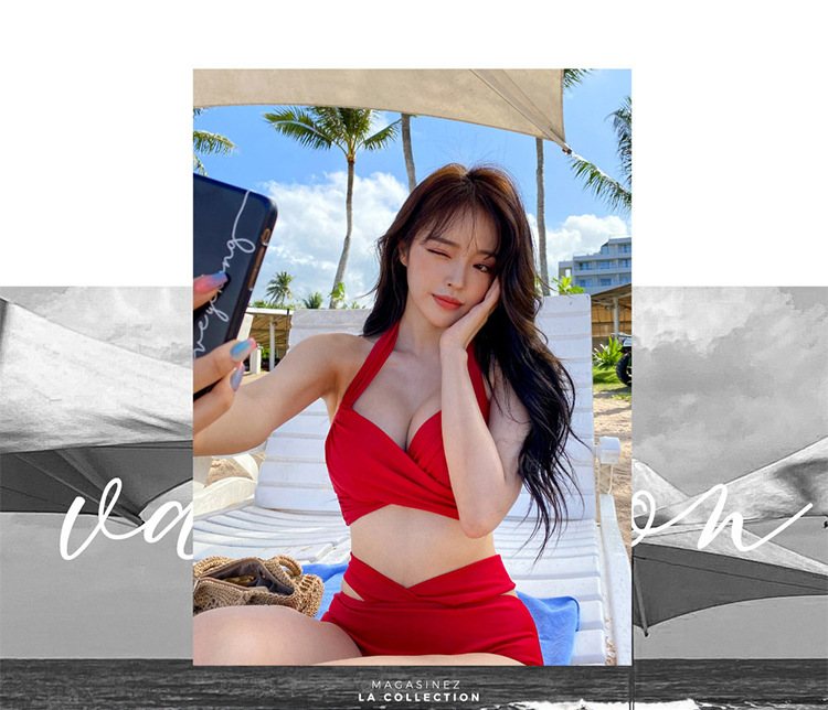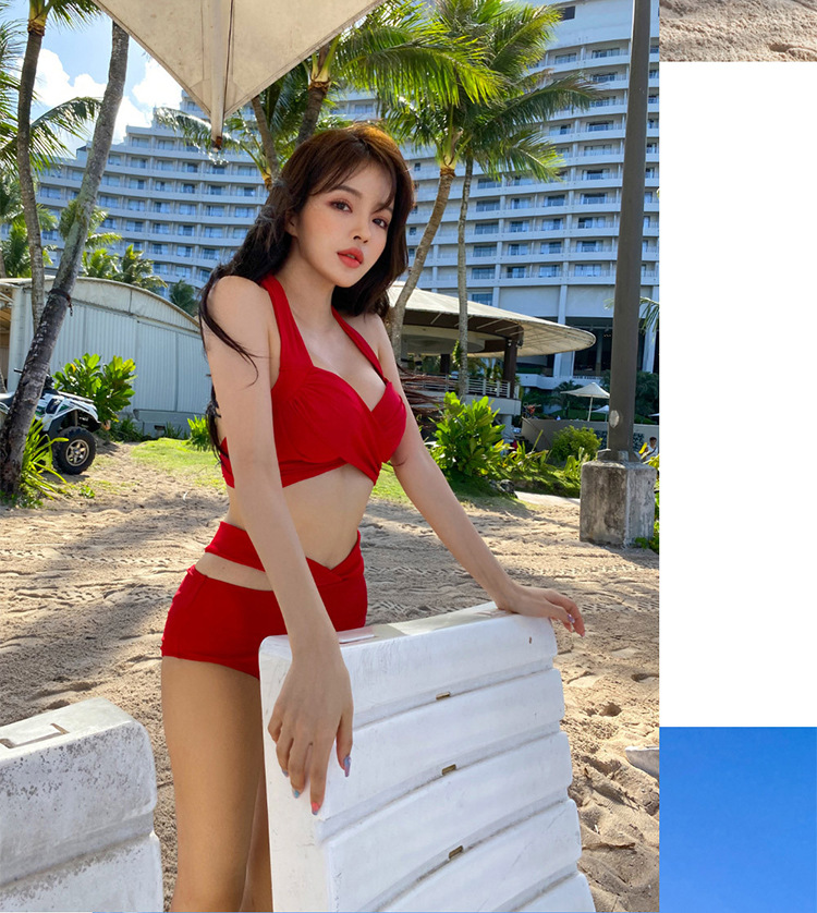 여성용 수영복 빅 레드 비키니 인 언더와이어 작은 가슴 푸시업 섹시 스플릿 3점 홀터넥 온천 휴가