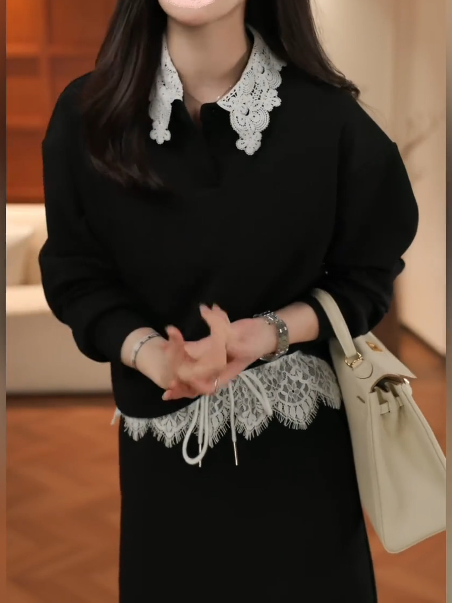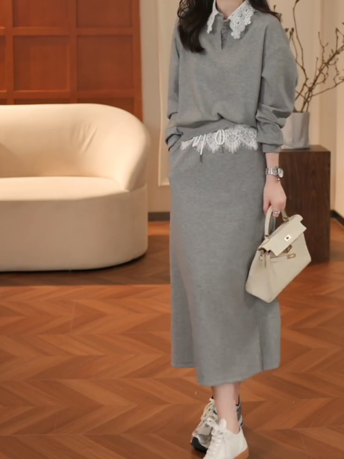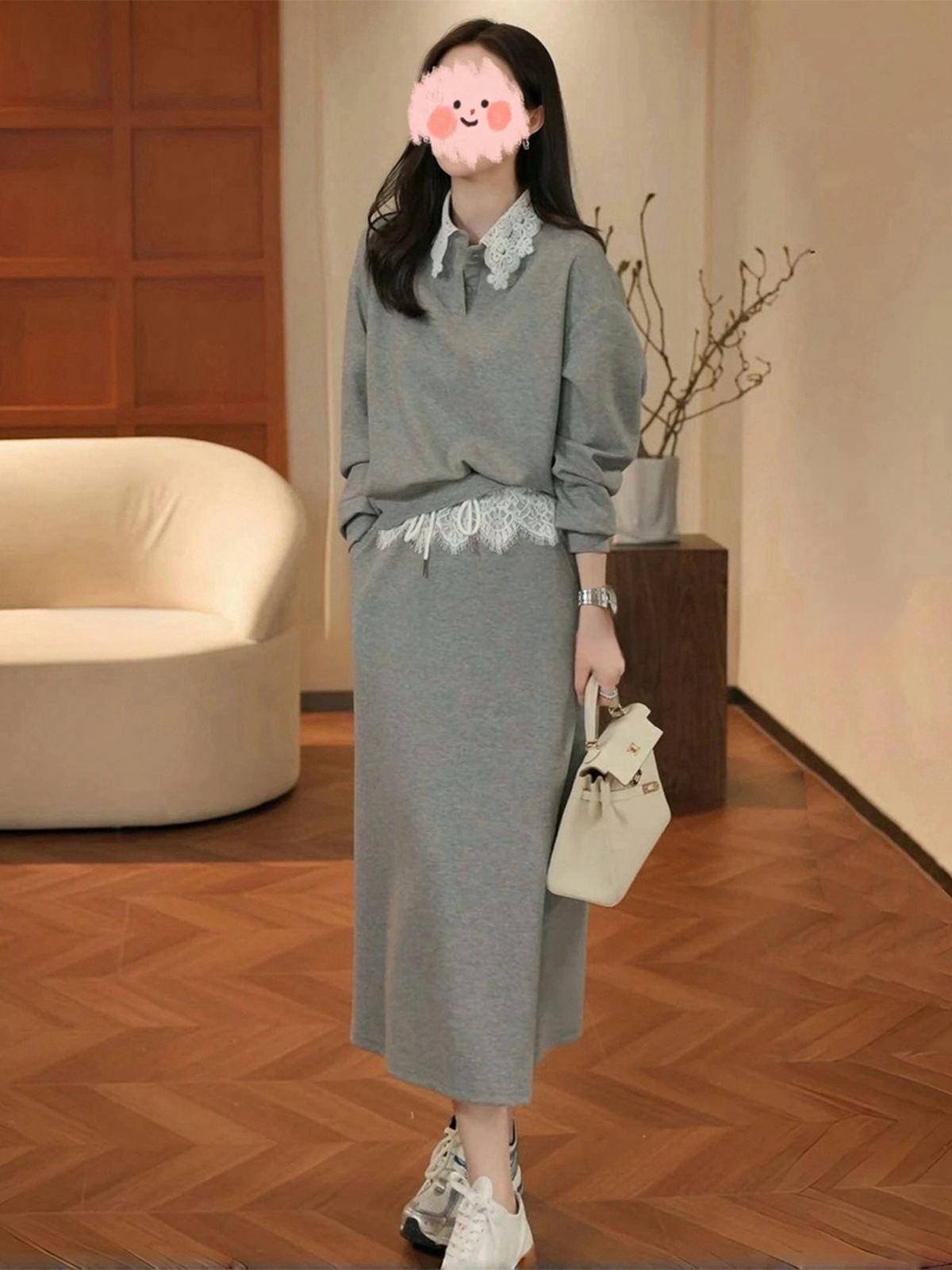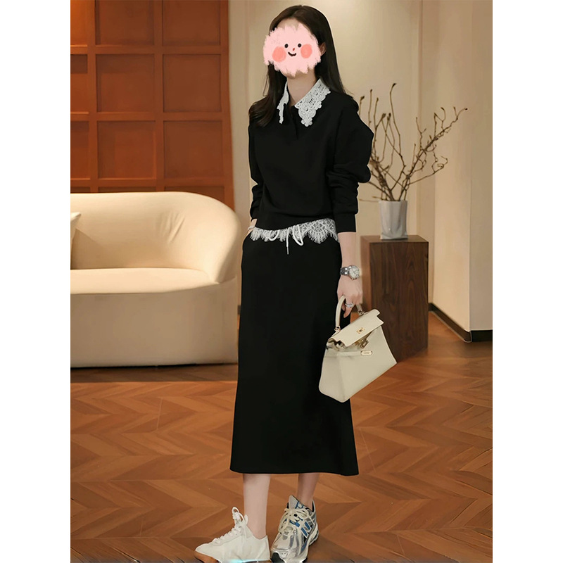 레이스 스플라이싱 그레이 스웨트 캐주얼 연령 감소 정장 스커트 여성 2025 봄 아름다운 독특한 디자인 투피스 트렌디 세트스토어 가기