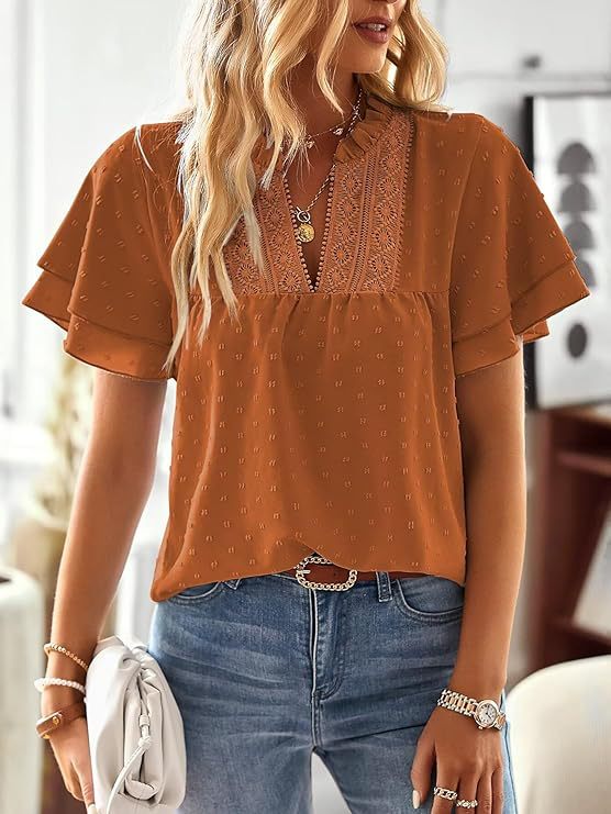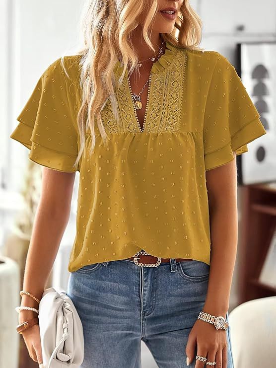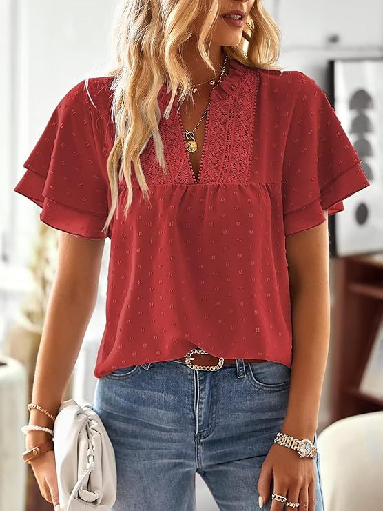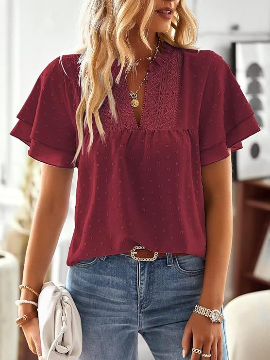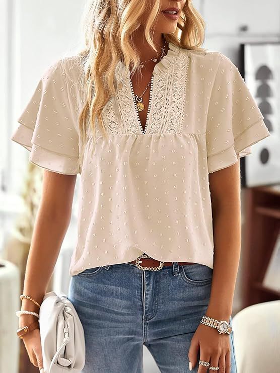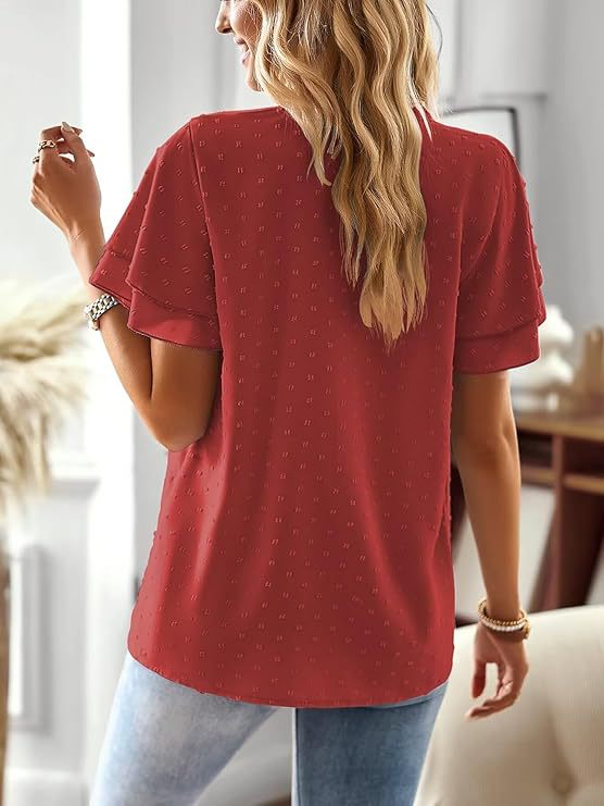 여성용 탑 나비 슬리브 V 넥 셔츠 캐주얼 플로팅 스위스 도트 프릴 반소매