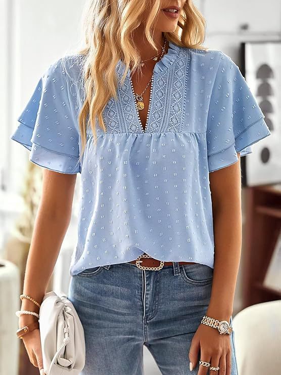 여성용 탑 나비 슬리브 V 넥 셔츠 캐주얼 플로팅 스위스 도트 프릴 반소매스토어 가기