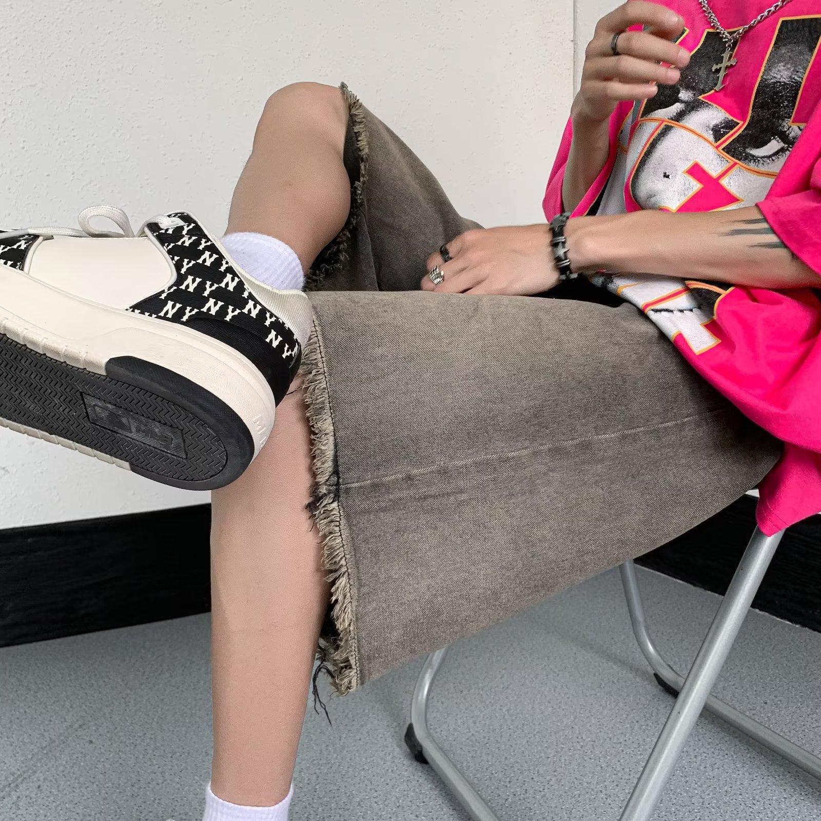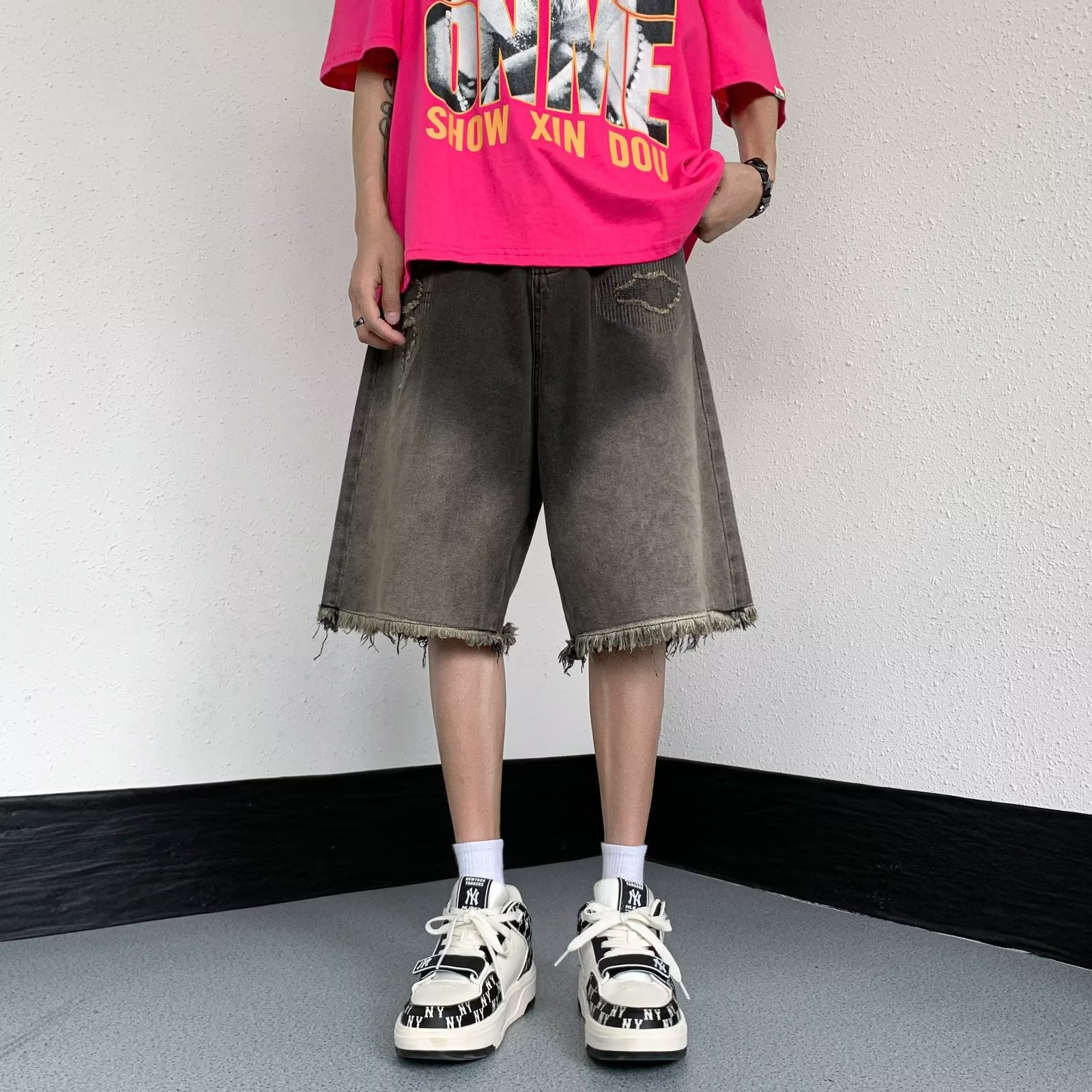 남성용 찢어진 로우 엣지 데님 반바지, 아메리칸 스타일 그라데이션 워싱 팬츠, 여름 트렌디 브랜드 루즈 와이드 레그 5부 팬츠
