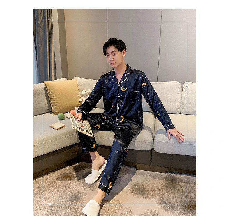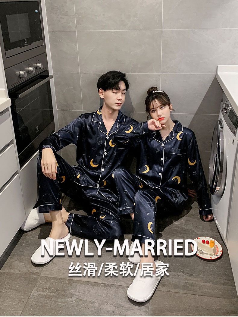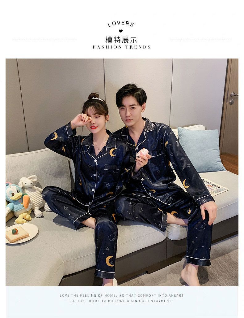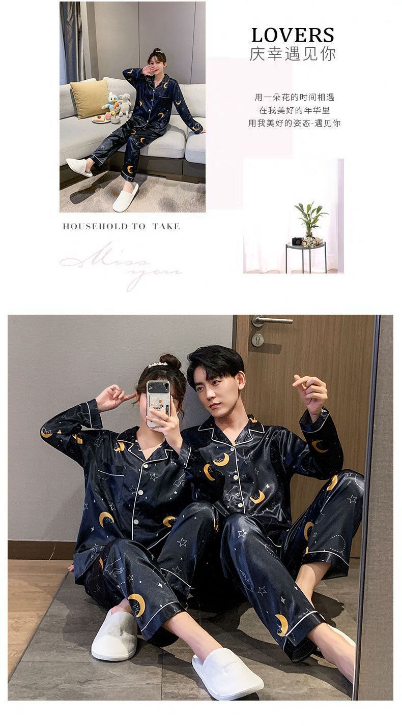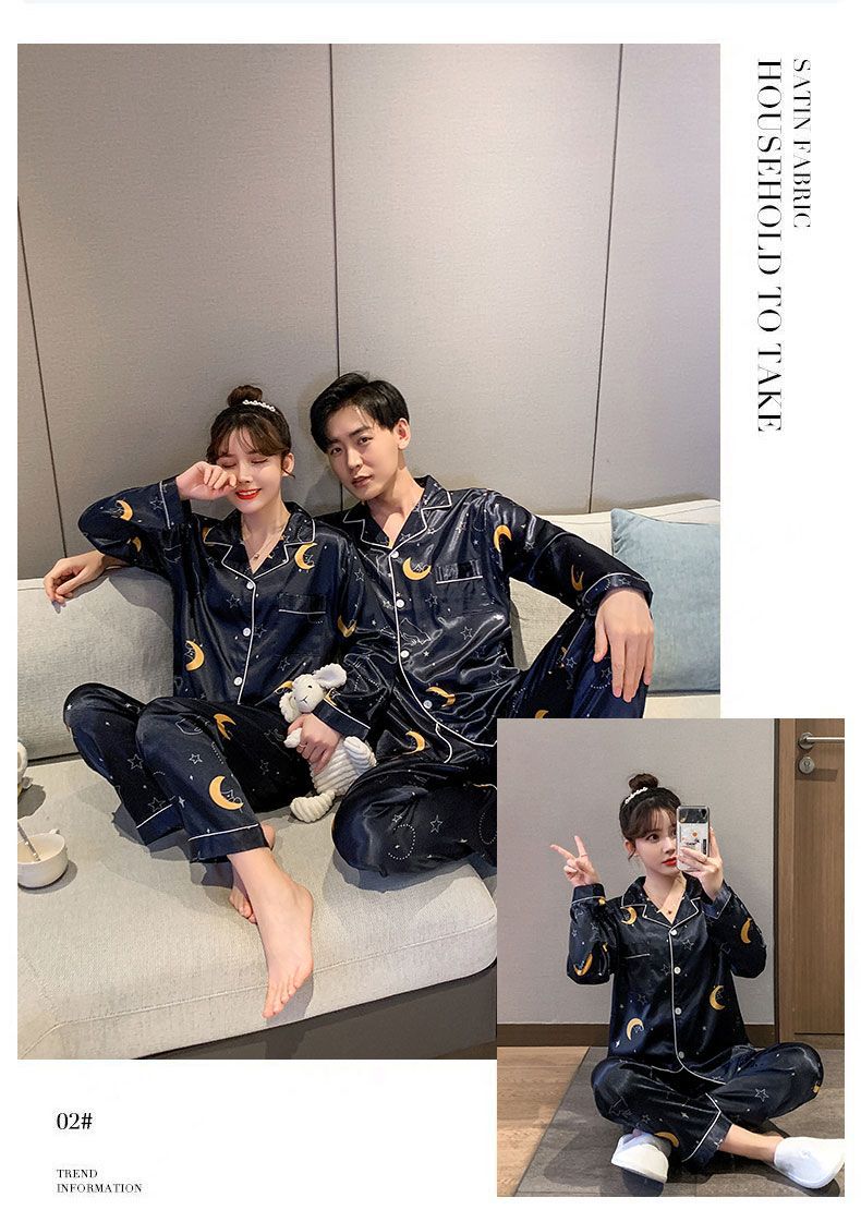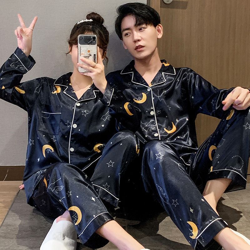 봄과 가을 여성용 한국 아이스 실크 커플 잠옷 긴팔 바지 남성과 여성을위한 모조 실크 실크 정장 홈웨어스토어 가기