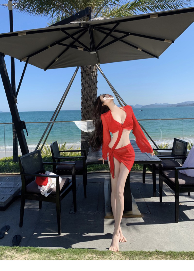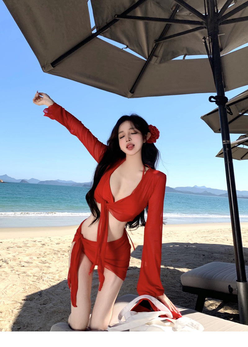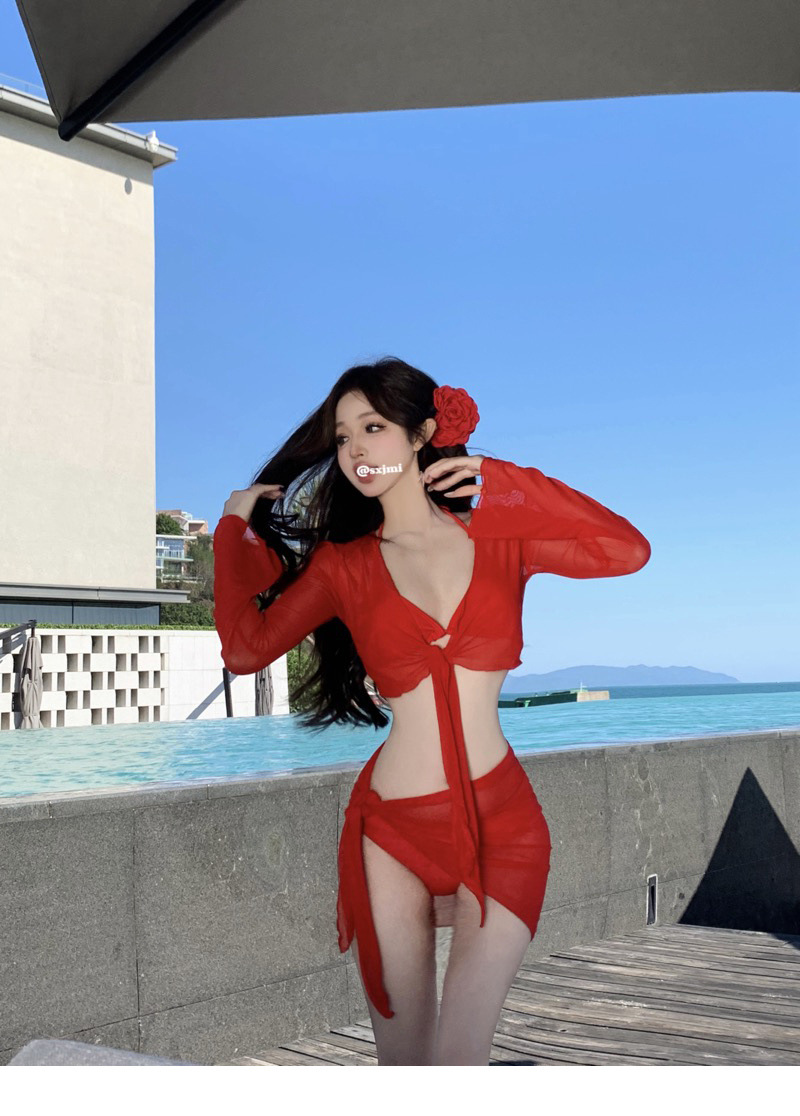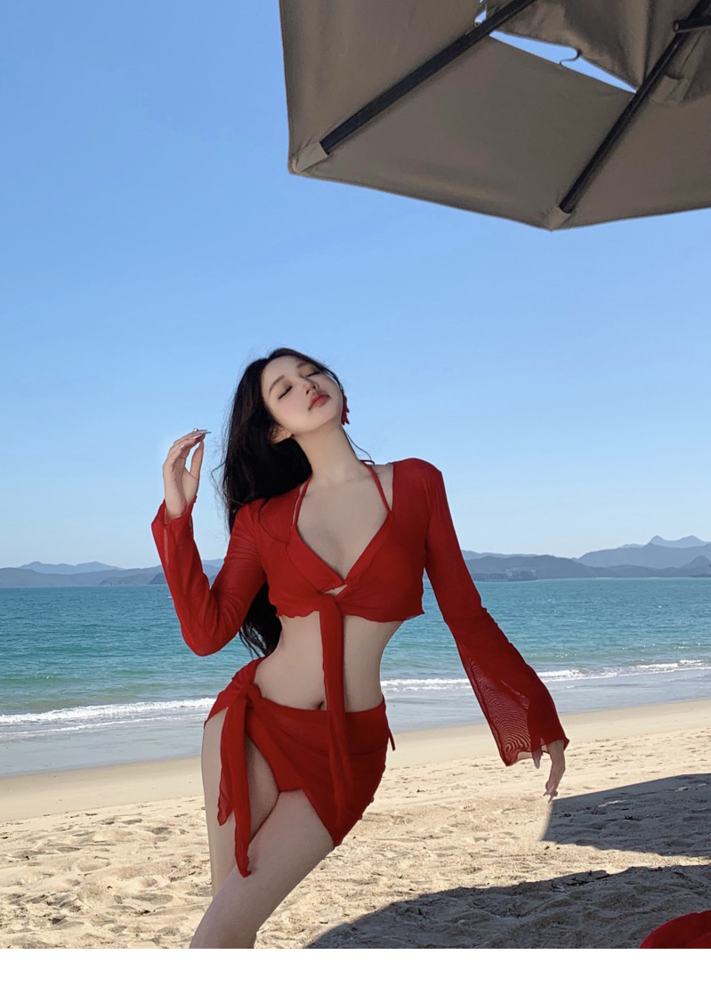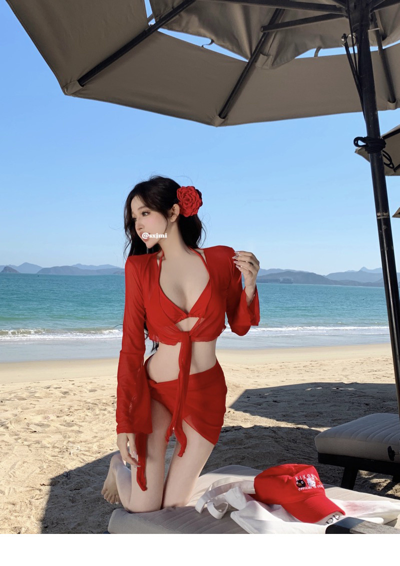 레드 비키니 수영복, 여성스럽고 순수한 섹시 스타일, 레이스업, 등이 없는, 속이 빈, 해변 휴가, 온천, 슈퍼 요정 긴 소매