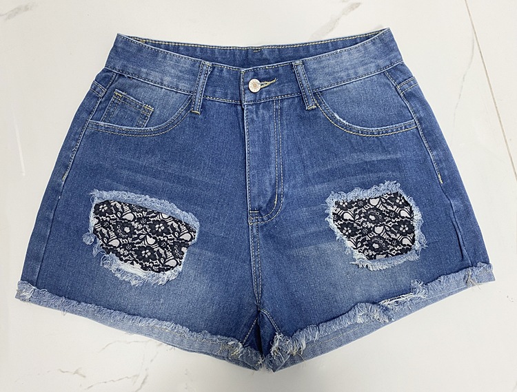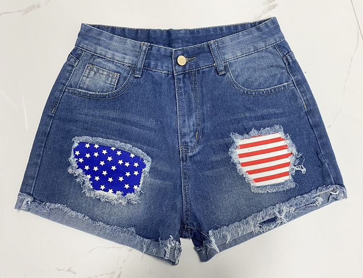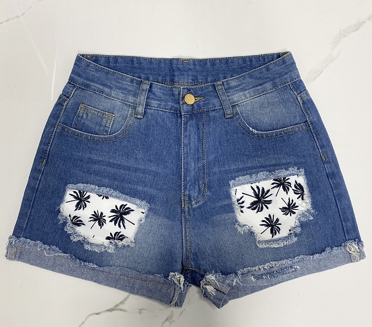 2025 유럽 및 미국 인기 핫템 중간 허리 찢어진 청바지 여성 스트리트 패션 패치 프린트 데님 반바지 도매스토어 가기