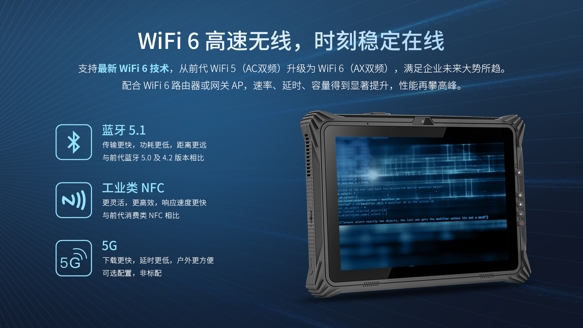 WiFi | Wi-fi 6 802.11a,b,d,e,g,h,i,k,n,r,u,v,w,ac,ax,频率2.4G/5.8G | |