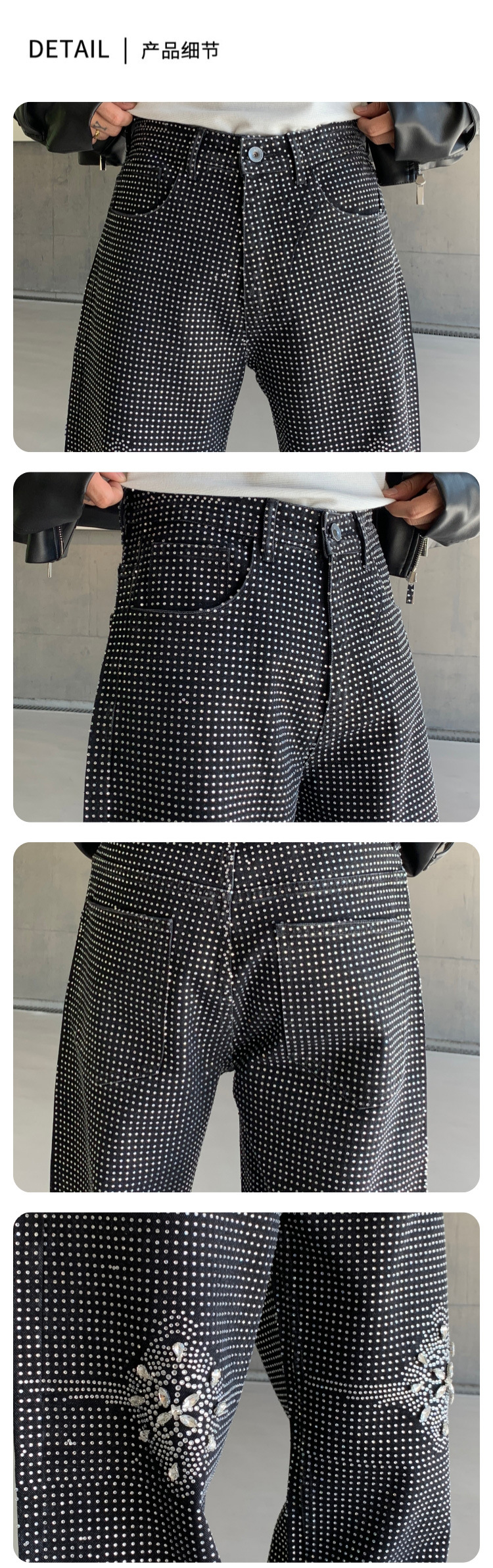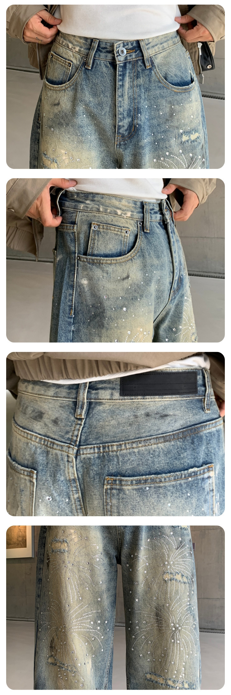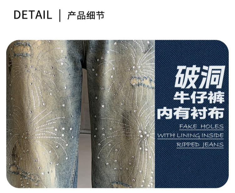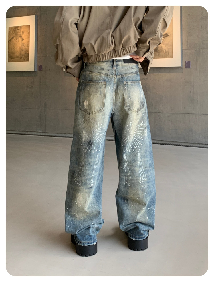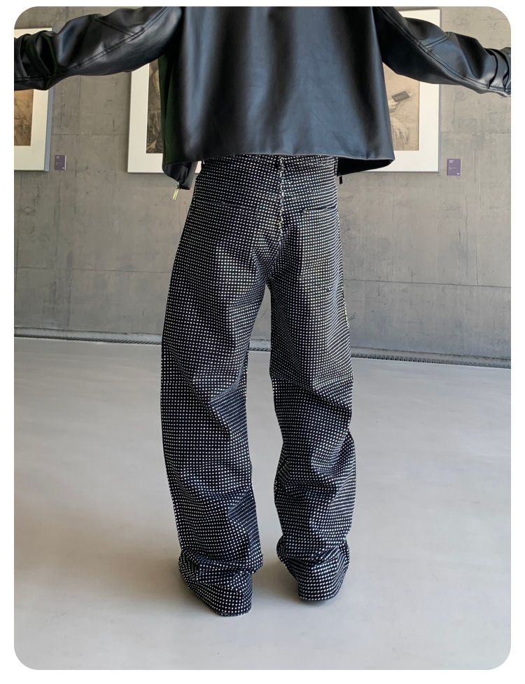 남성용 아메리칸 하이 스트리트 풀 다이아몬드 디자인 청바지, 새로운 트렌디 브랜드 루즈 스트레이트 워싱 비즈 남성 캐주얼 바지스토어 가기