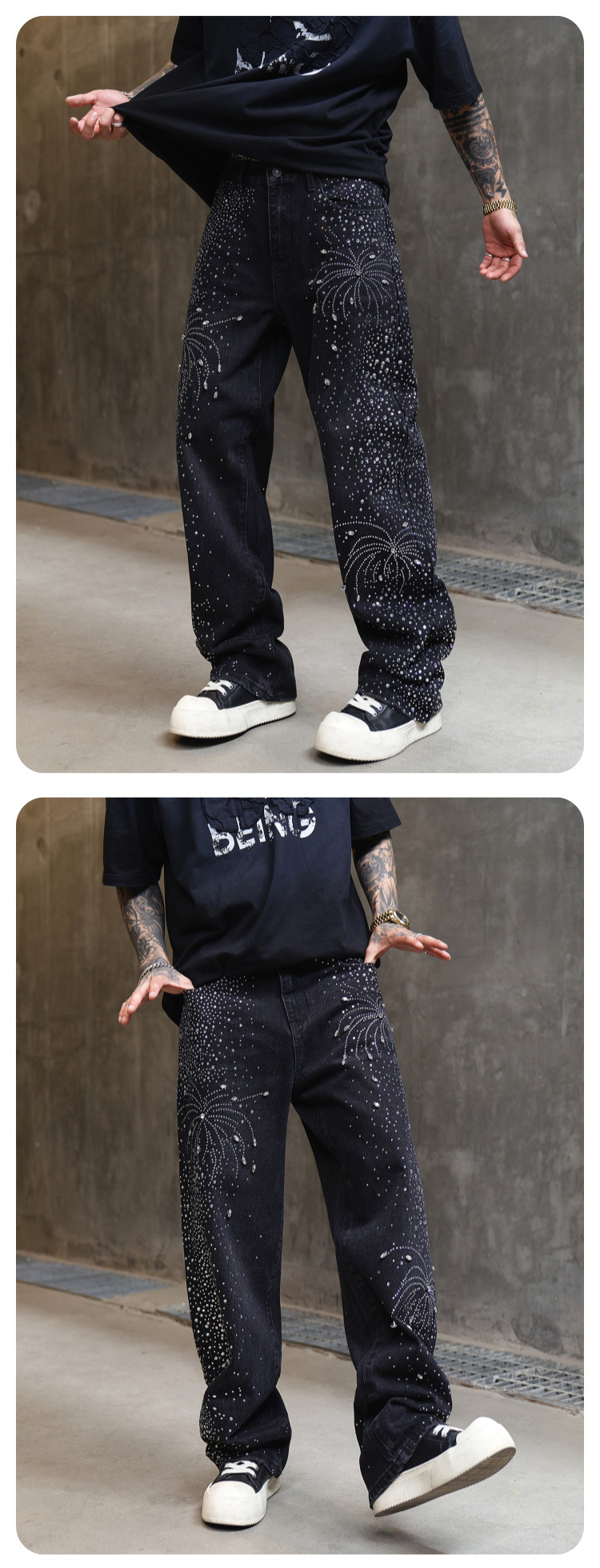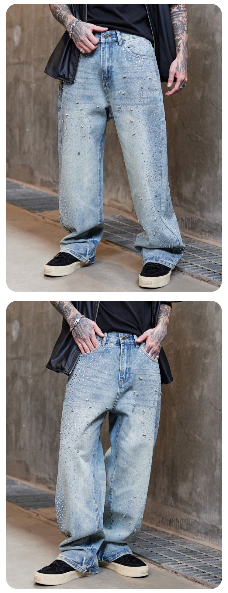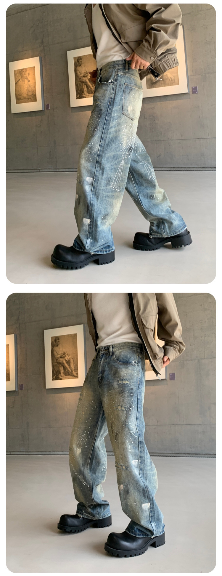 남성용 아메리칸 하이 스트리트 풀 다이아몬드 디자인 청바지, 새로운 트렌디 브랜드 루즈 스트레이트 워싱 비즈 남성 캐주얼 바지스토어 가기