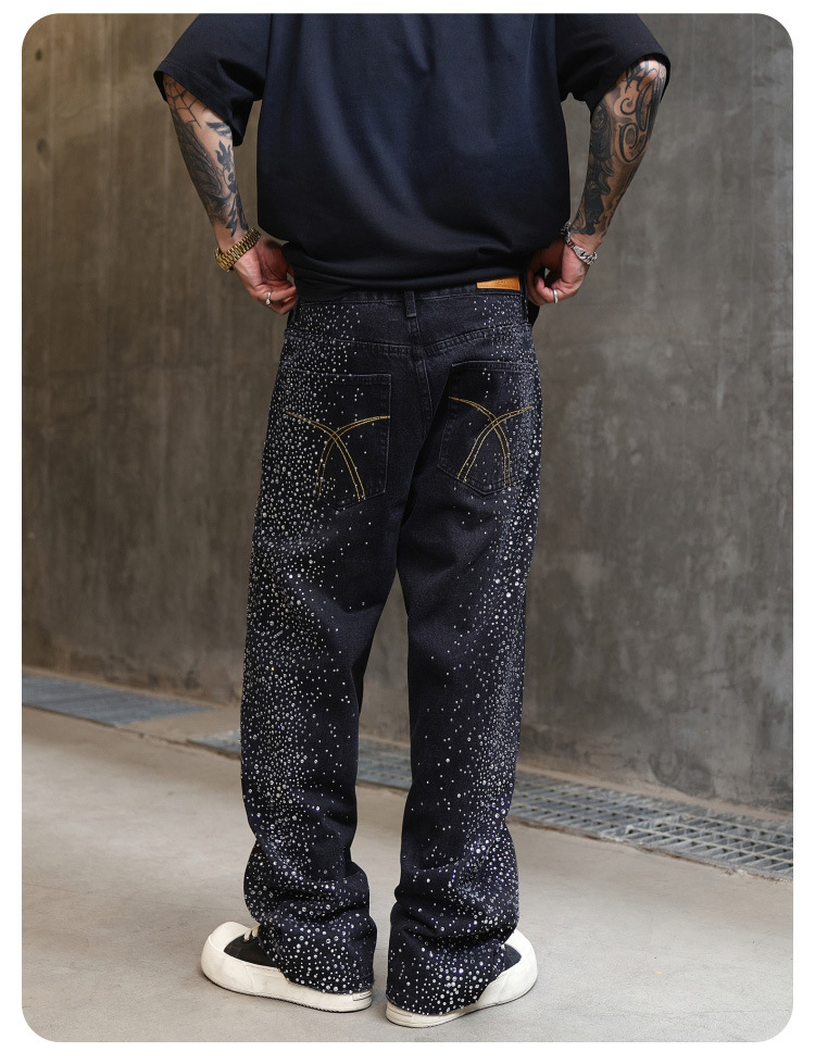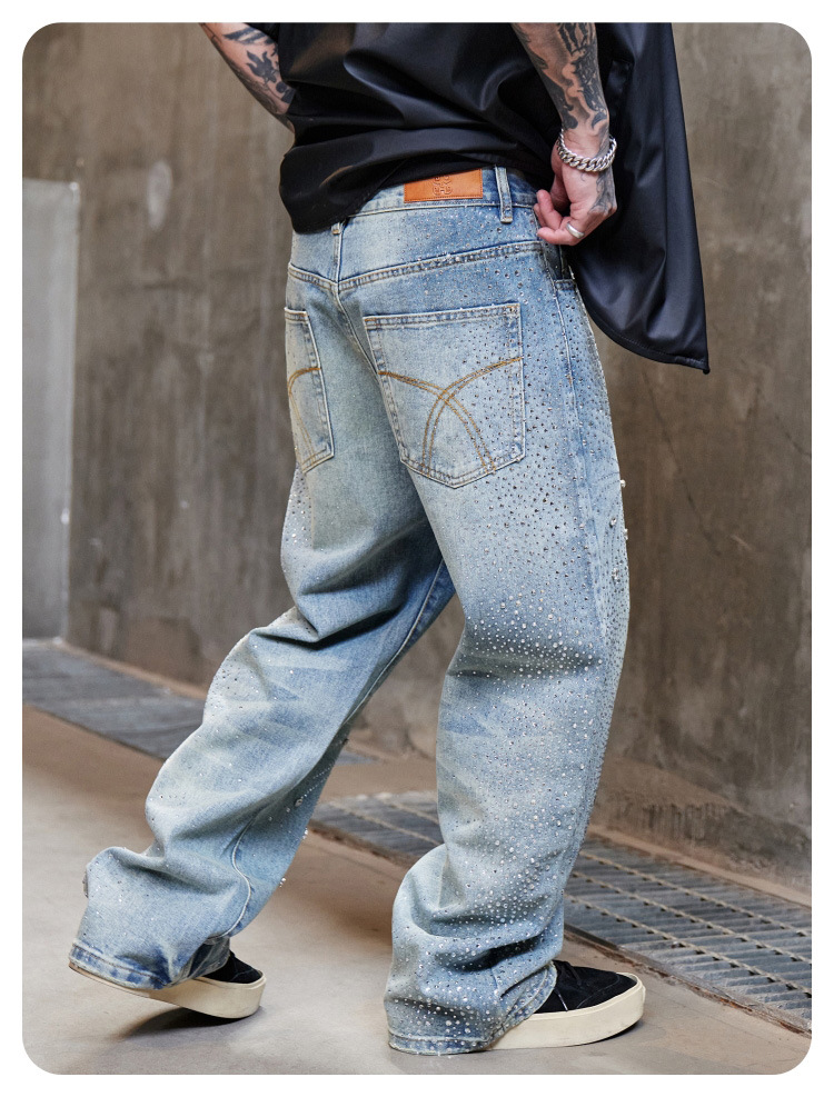 남성용 아메리칸 하이 스트리트 풀 다이아몬드 디자인 청바지, 새로운 트렌디 브랜드 루즈 스트레이트 워싱 비즈 남성 캐주얼 바지