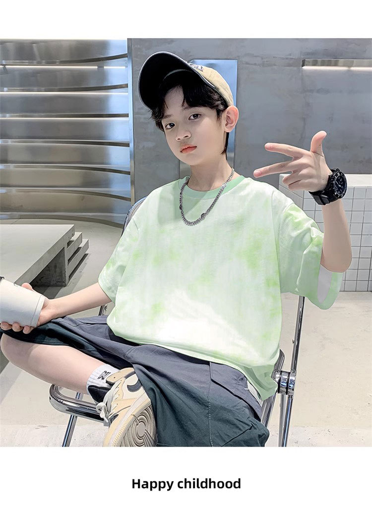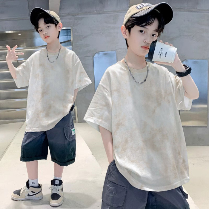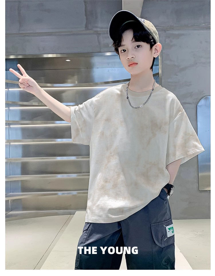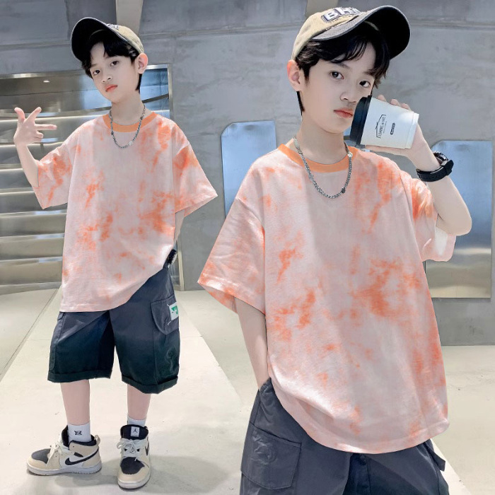 남아용 신형 순면 공예 타이 염색 컬러풀한 반팔 티셔츠, 중대형 아동복을 위한 다용도 회색 바지스토어 가기