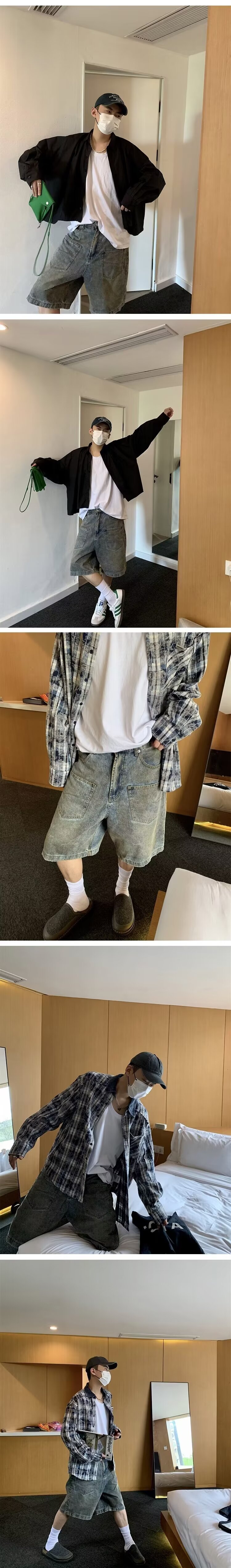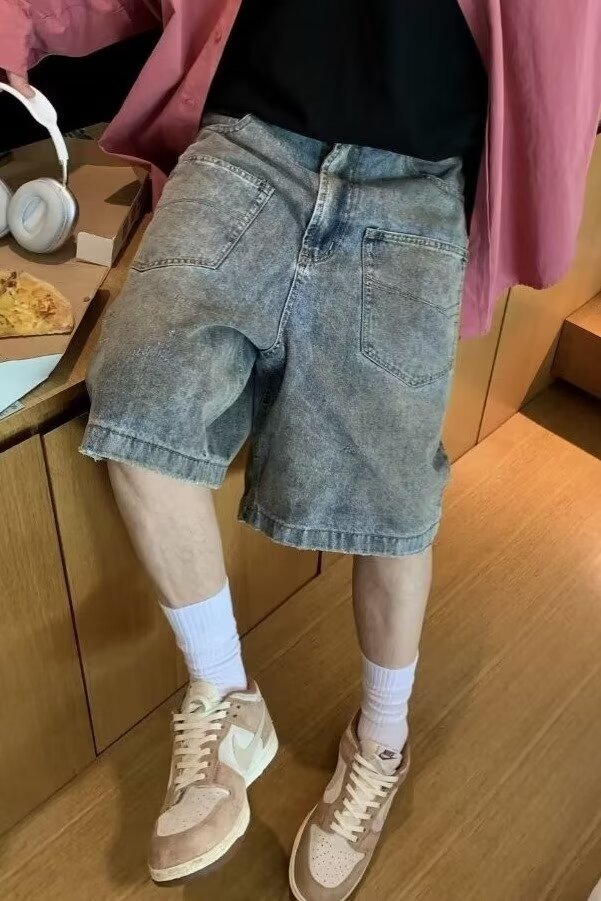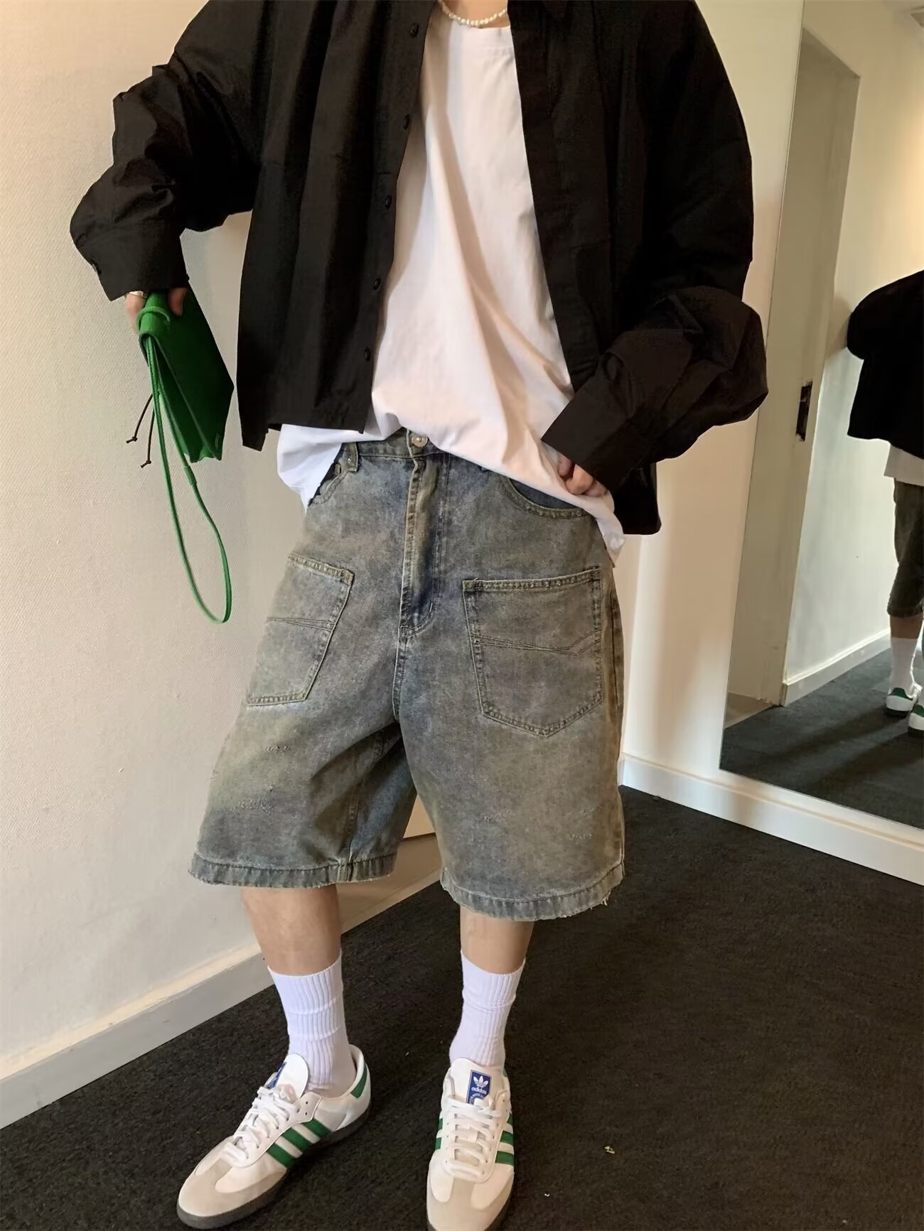 DGE 아메리칸 레트로 하이 스트리트 디스트레스드 워싱 워스트랜드 스타일 포켓 디자인 데님 반바지 남성 여름 휴가용 5부 바지