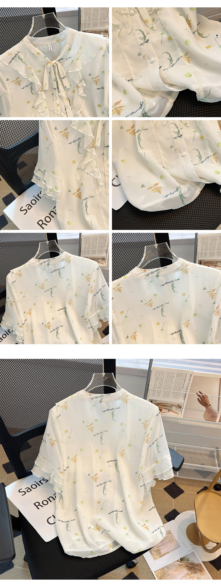 여름 프랑스 스타일의 새로운 달콤하고 신선한 v 넥 스타일 꽃 무늬 반팔 셔츠 여성용 루즈 슬리밍 쉬폰 탑