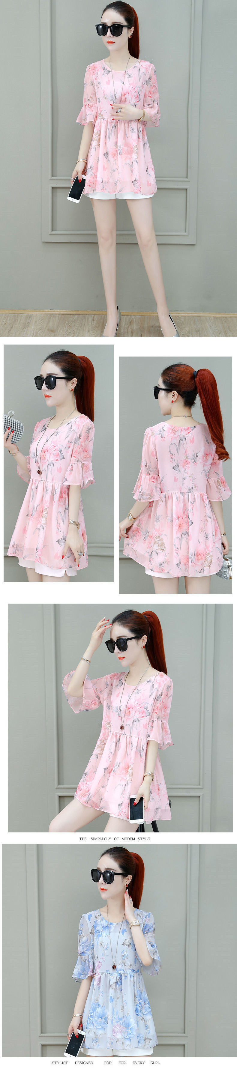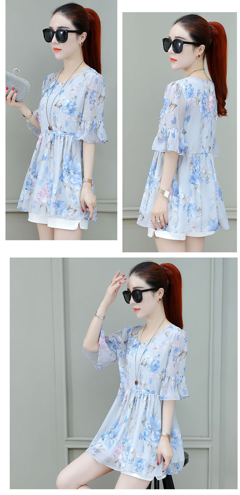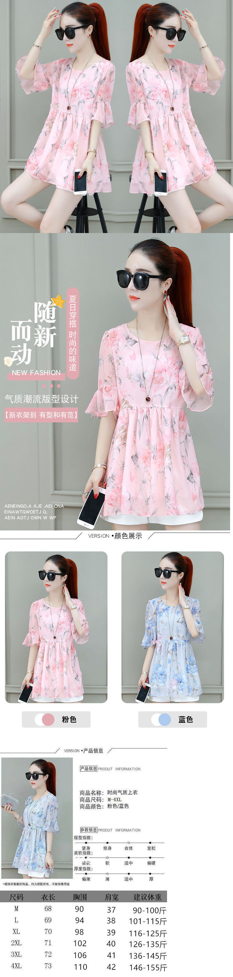 여성을위한 달콤한 프린트 쉬폰 셔츠 2025 여름 새로운 한국 스타일 느슨한 배 커버 스타일 반팔 탑 중간 길이