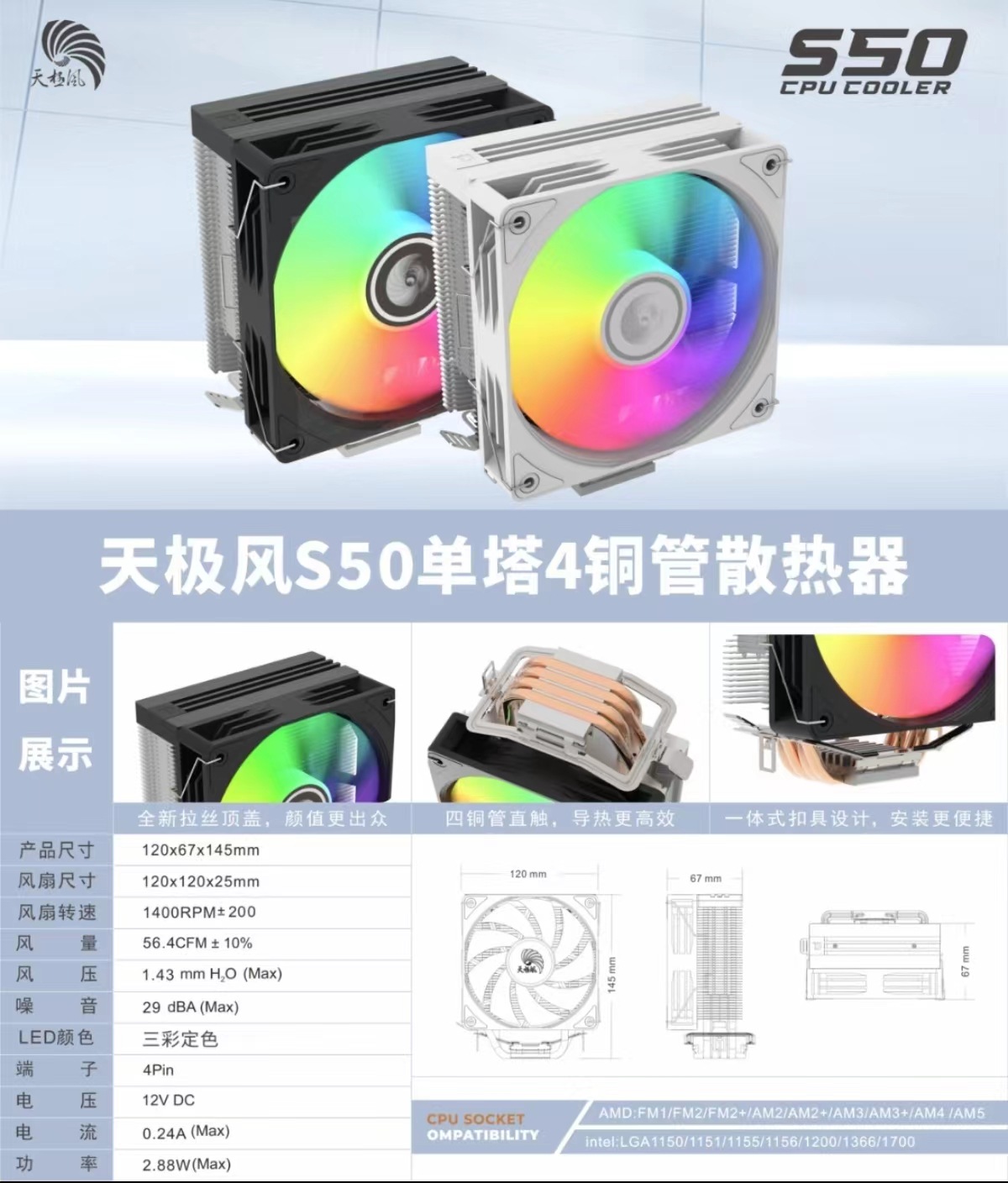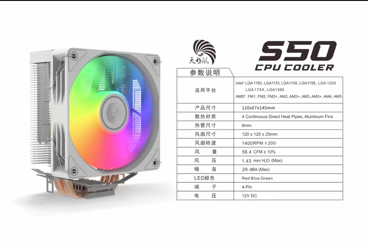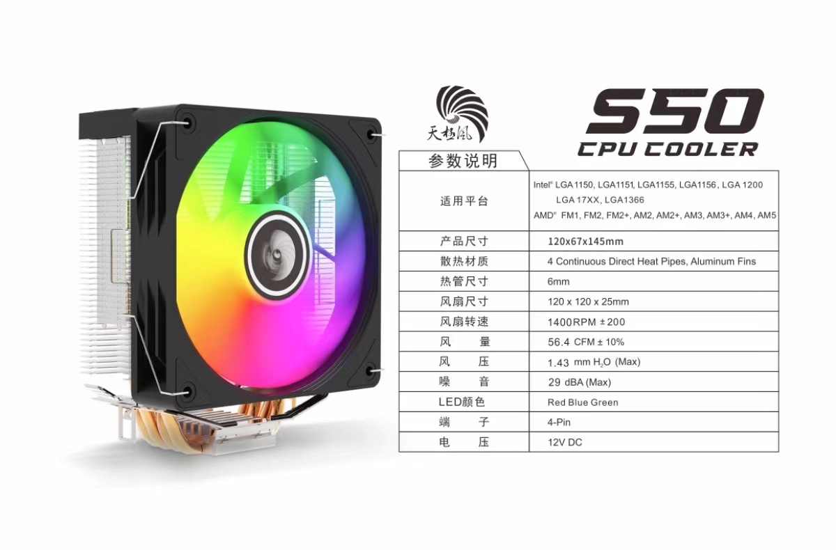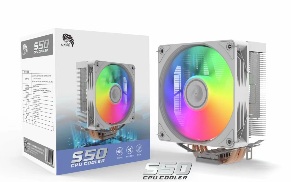 Tianjifeng S50 라디에이터 4개의 구리 튜브 버클로 편리한 설치 12cm 다채로운 조명 컴퓨터 CPU 음소거