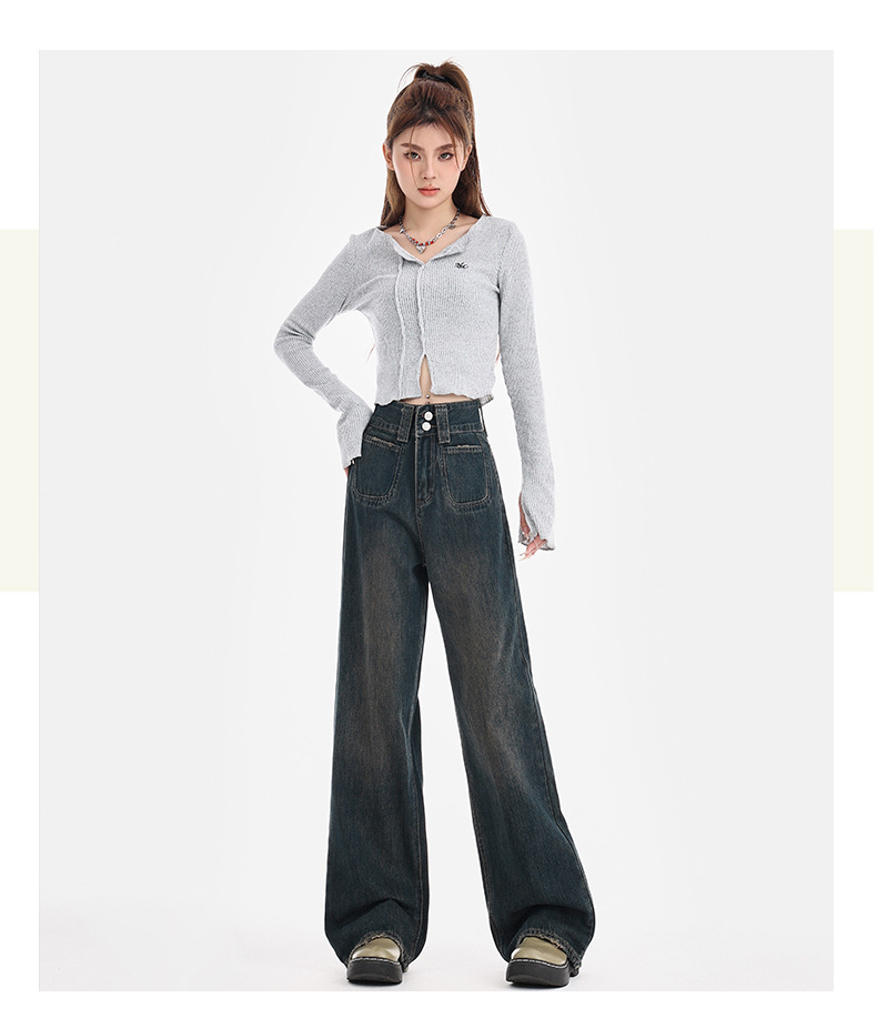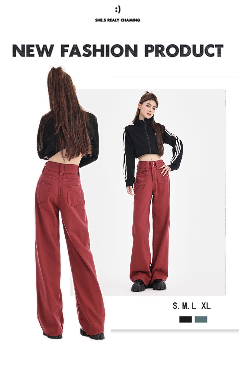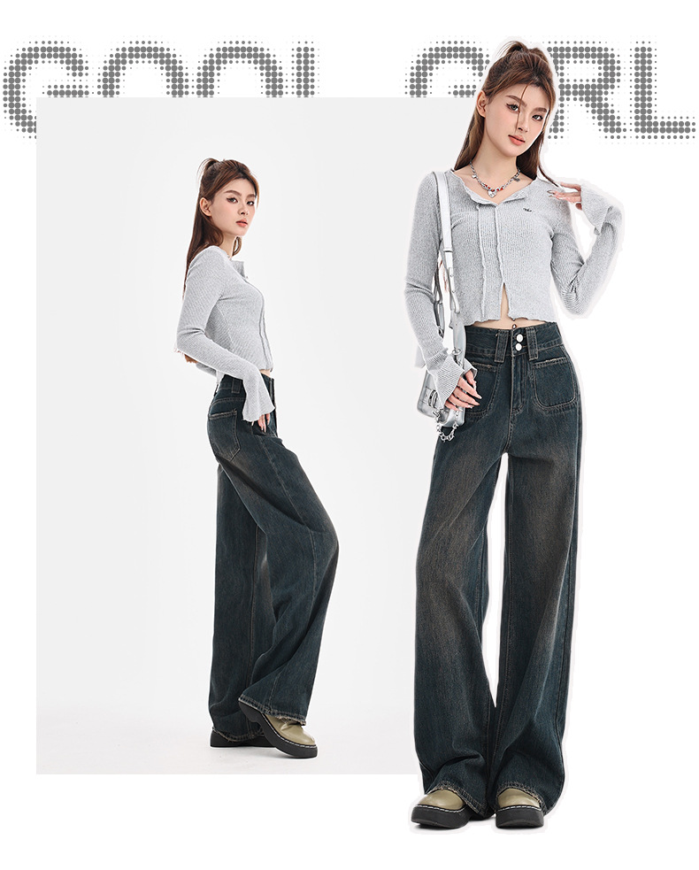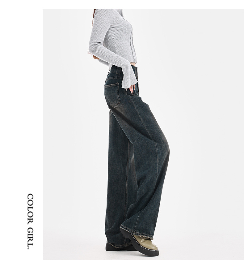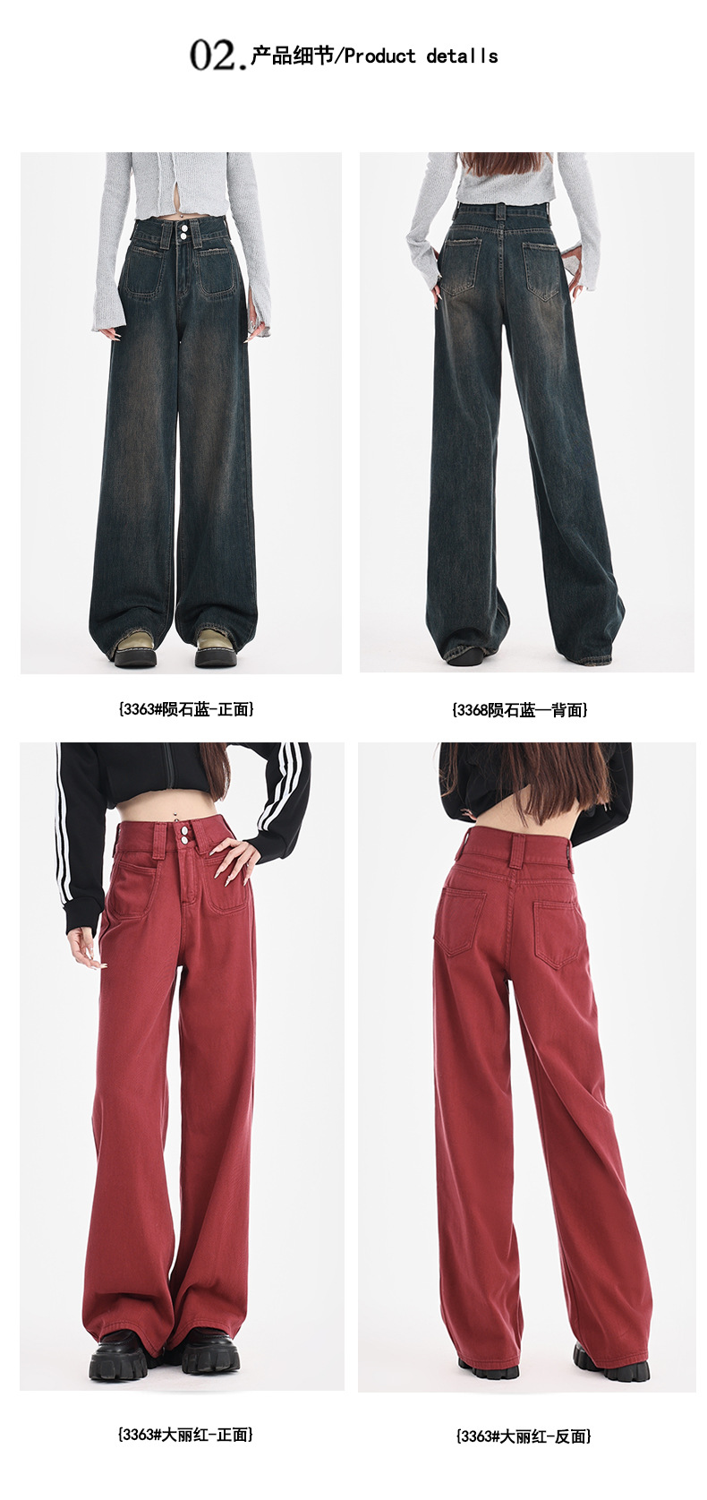 [리얼샷] 가을 2023 년 새 스트레이트 하이웨이스트 청바지 여성 루즈패션 올매치 드레이깅 바지스토어 가기