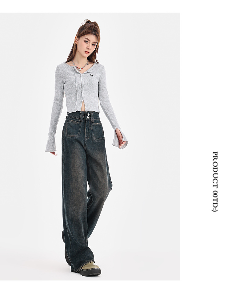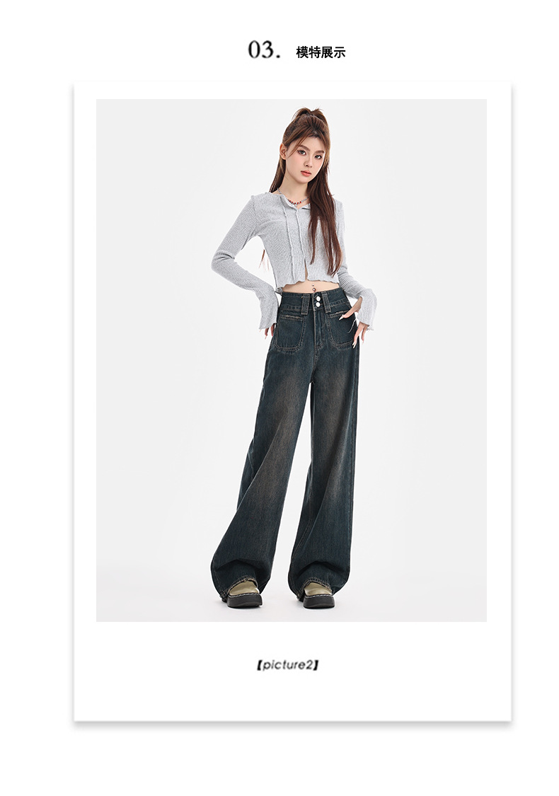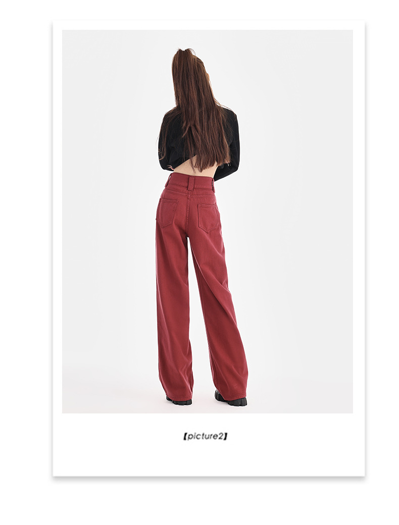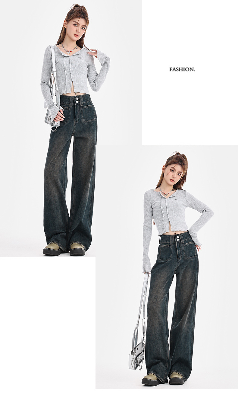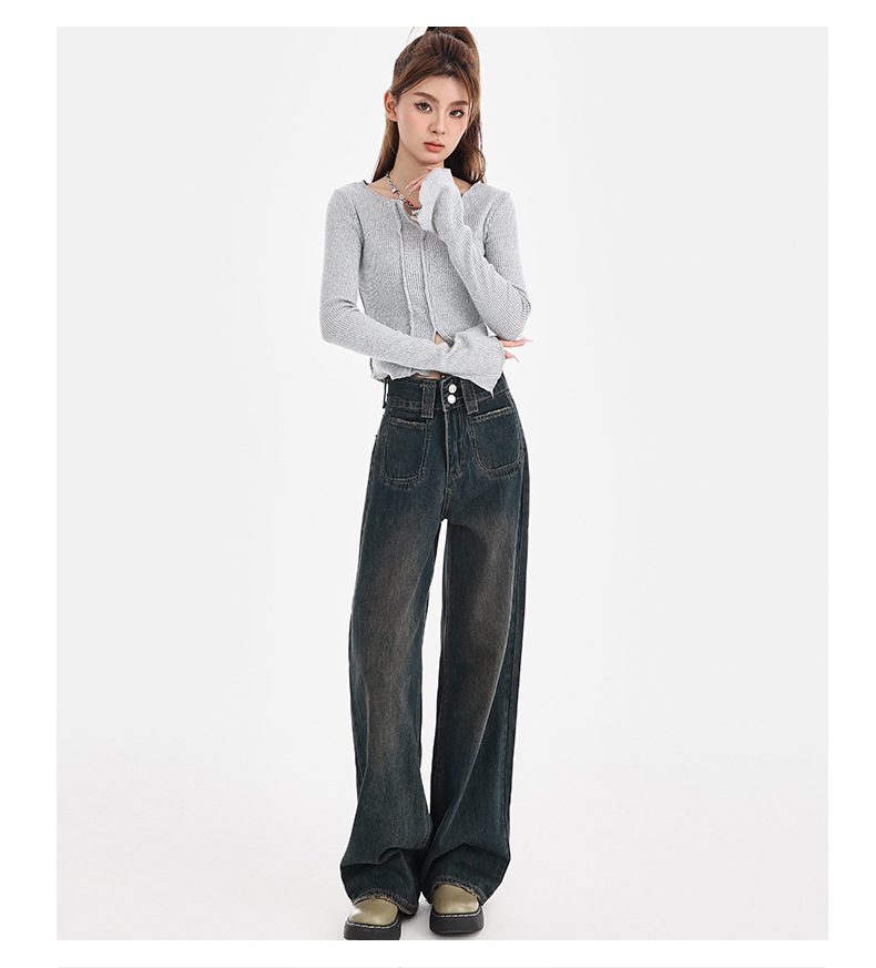 [리얼샷] 가을 2023 년 새 스트레이트 하이웨이스트 청바지 여성 루즈패션 올매치 드레이깅 바지스토어 가기