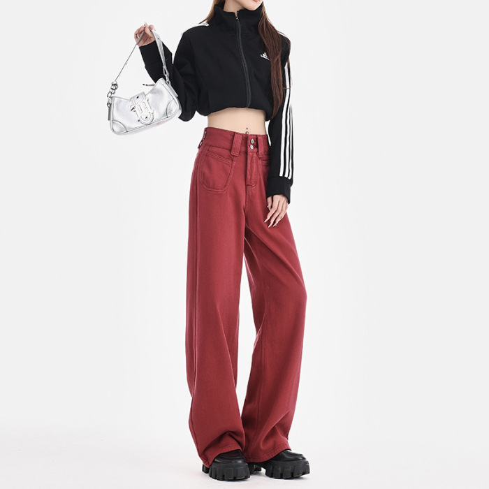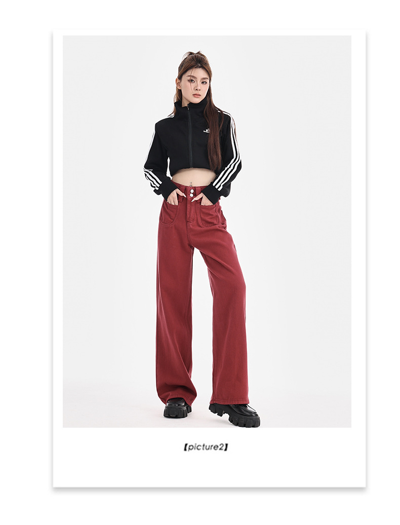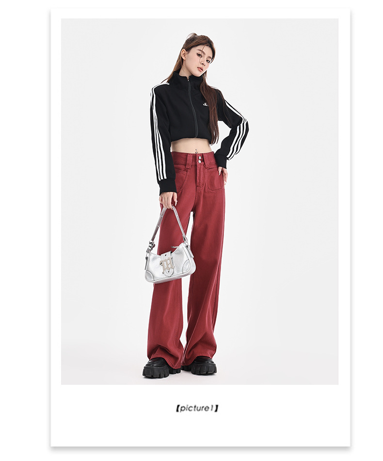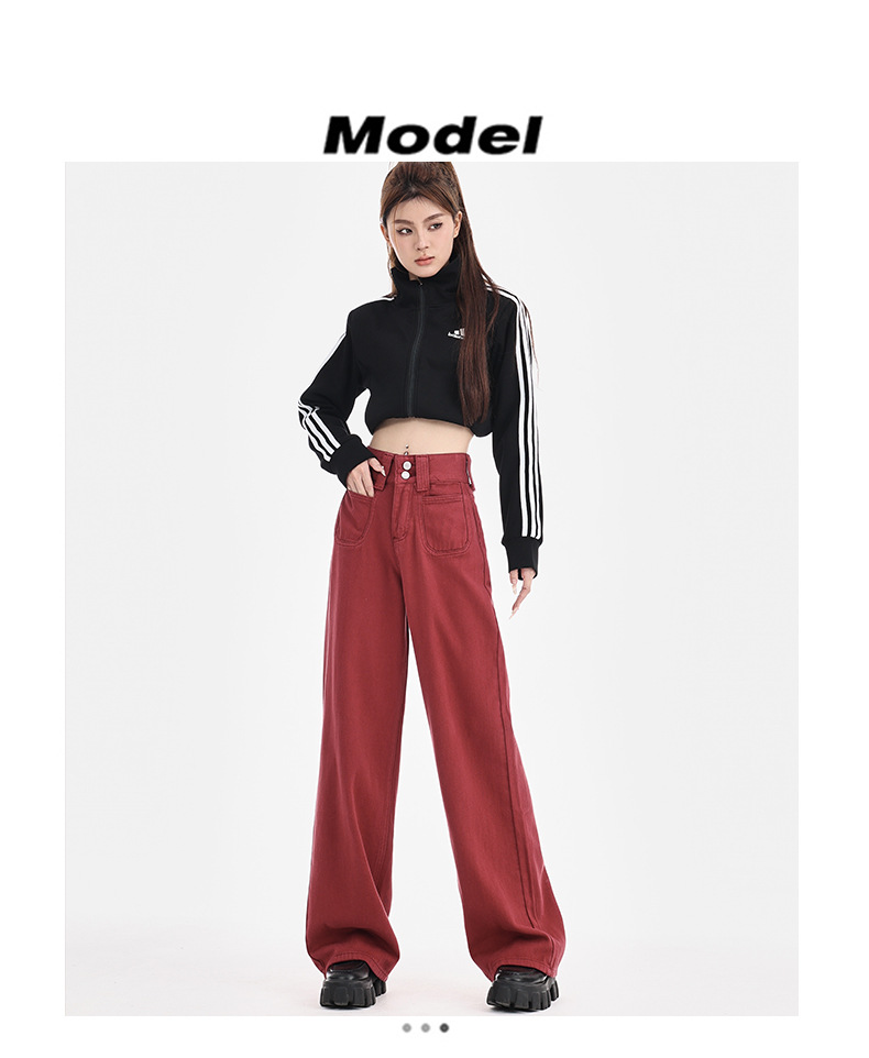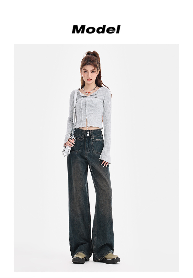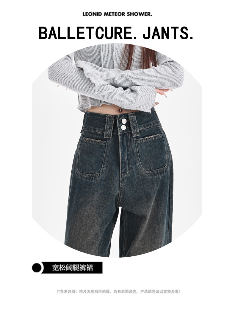 [리얼샷] 가을 2023 년 새 스트레이트 하이웨이스트 청바지 여성 루즈패션 올매치 드레이깅 바지스토어 가기