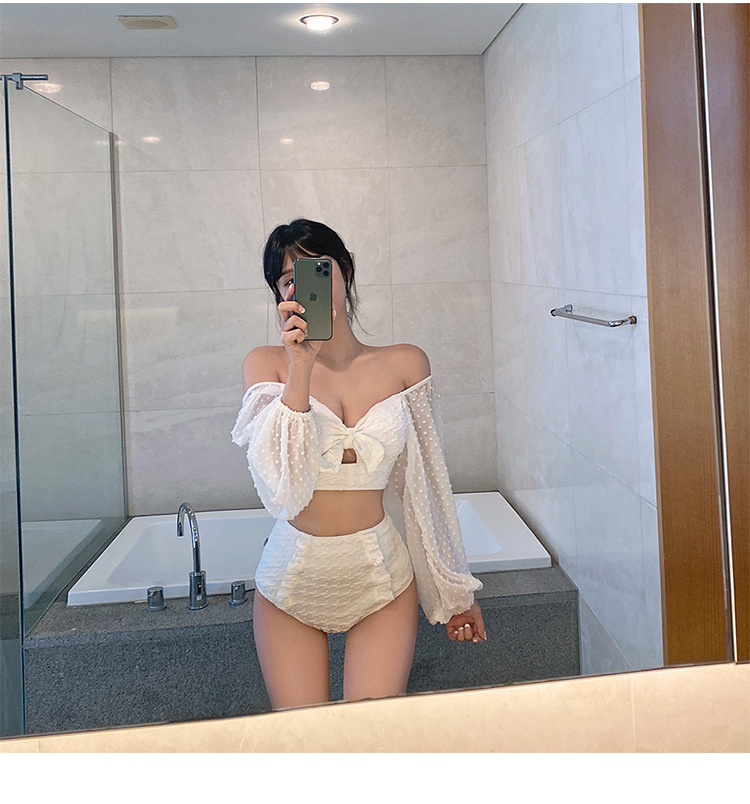 국경 도매 섹시 인 요정 팬 긴 소매 흰색 레이스 분할 수영복 여성 거품 소매 높은 허리 투피스 세트