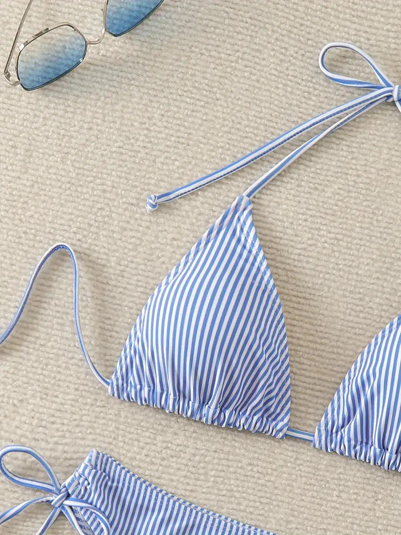 2024新款泳衣女欧美性感条纹聚拢三点式露背比基尼泳装bikini现货