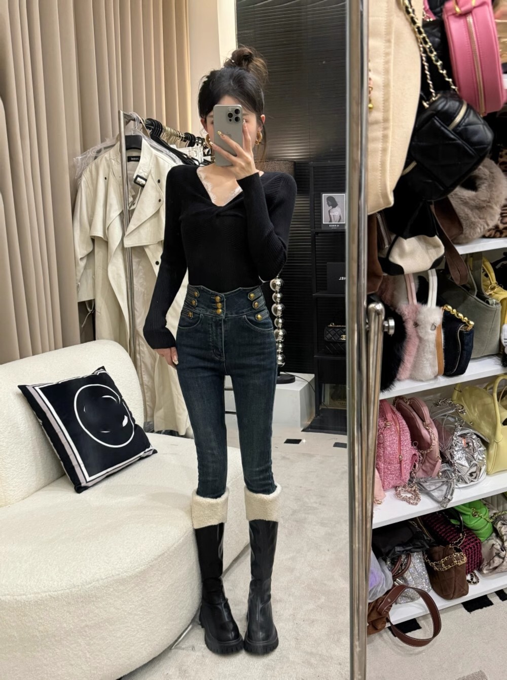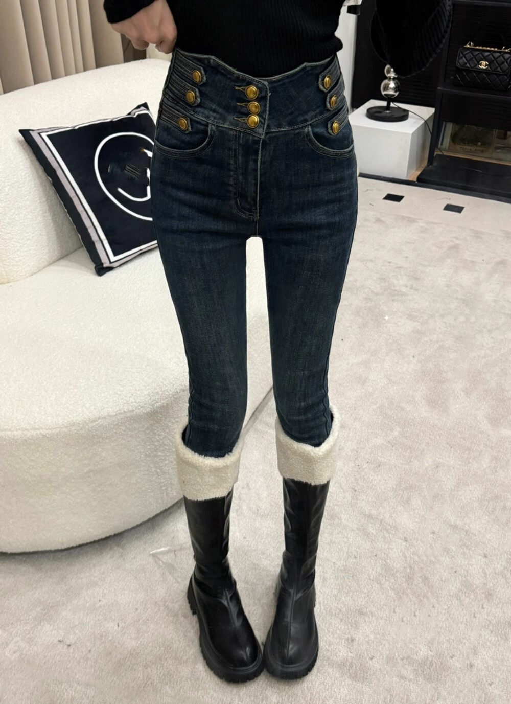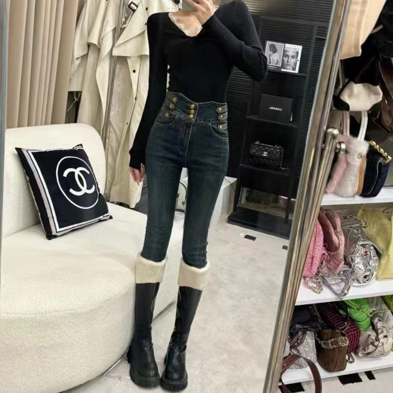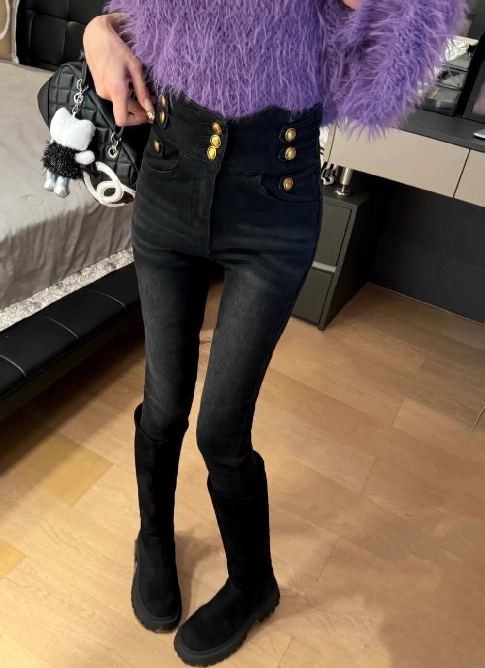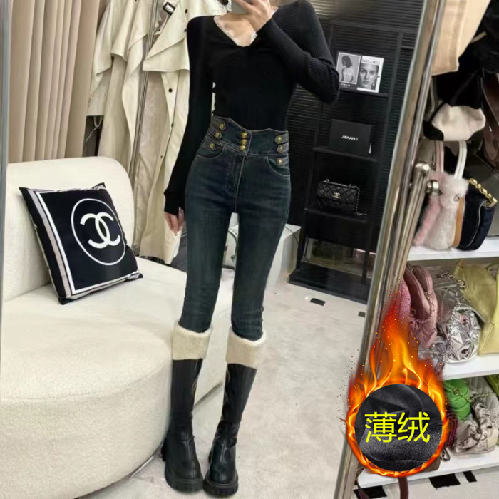 높은 허리 기모 따뜻한 청바지 여성의 가을과 겨울 2024 새로운 복고풍 슬림 단단한 연필 발 부츠 바지스토어 가기