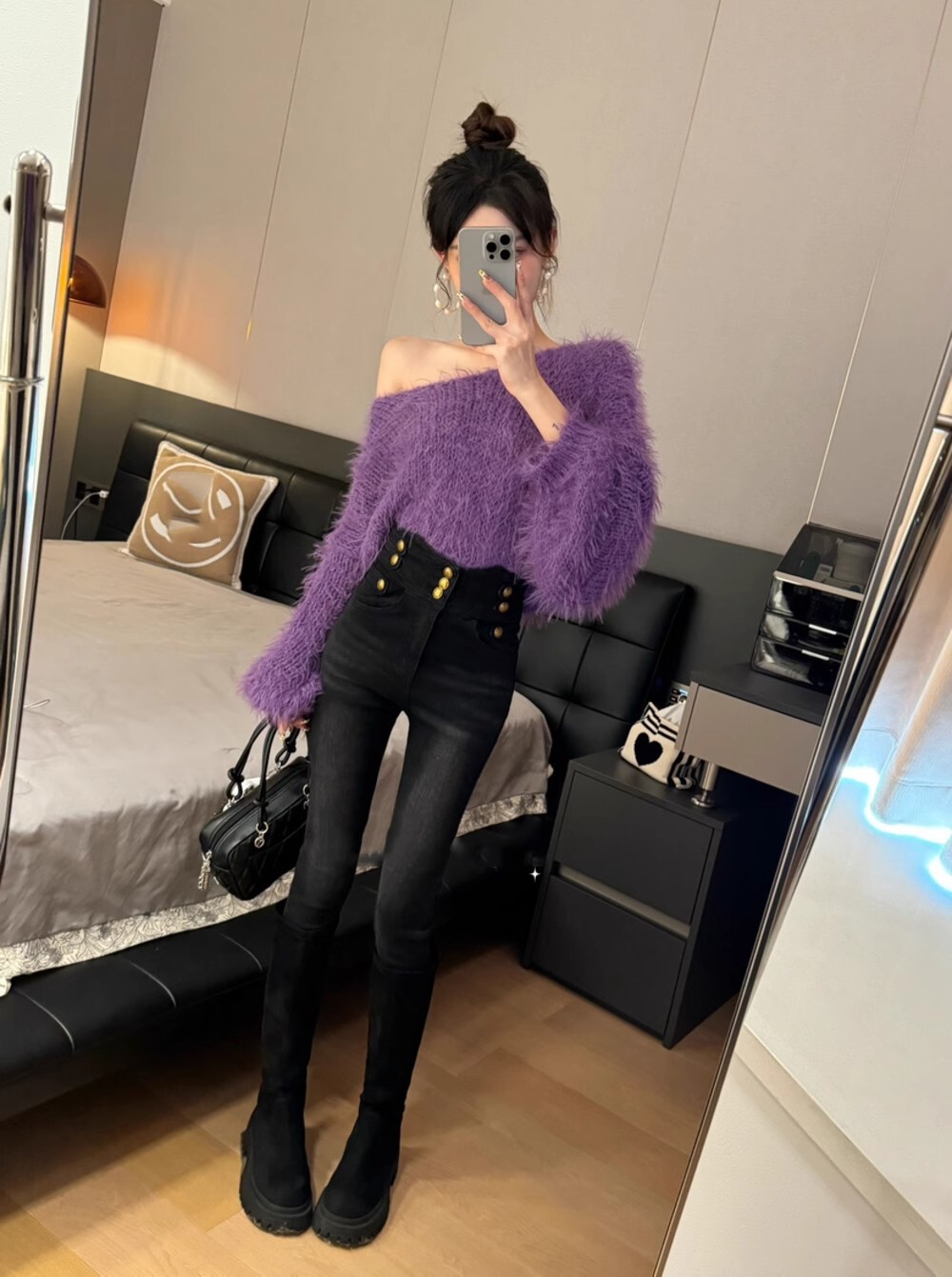 높은 허리 기모 따뜻한 청바지 여성의 가을과 겨울 2024 새로운 복고풍 슬림 단단한 연필 발 부츠 바지