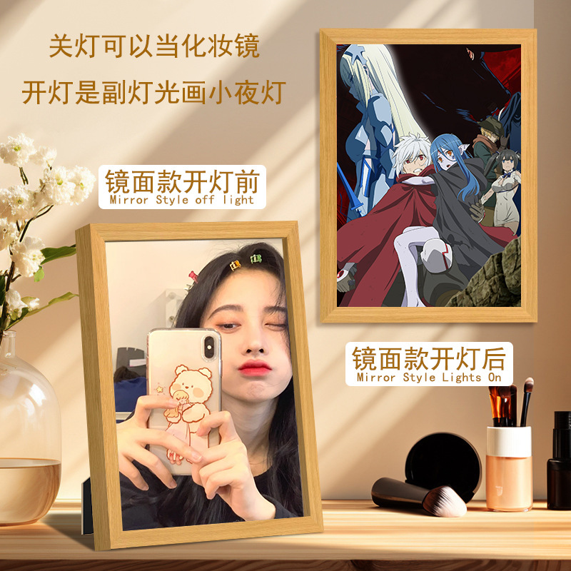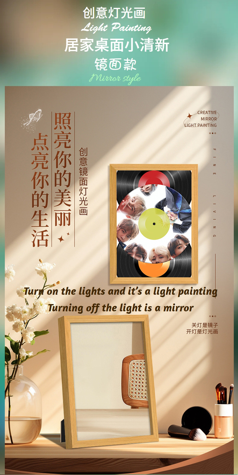 There are two types of light painting effects: double-image superposition and mirror. What you are seeing now is the mirror effect style. When the light is turned off, it is a mirror. When the light is turned on, the picture will be presented. Three colors can be switched, and the intensity of the light can be adjusted.