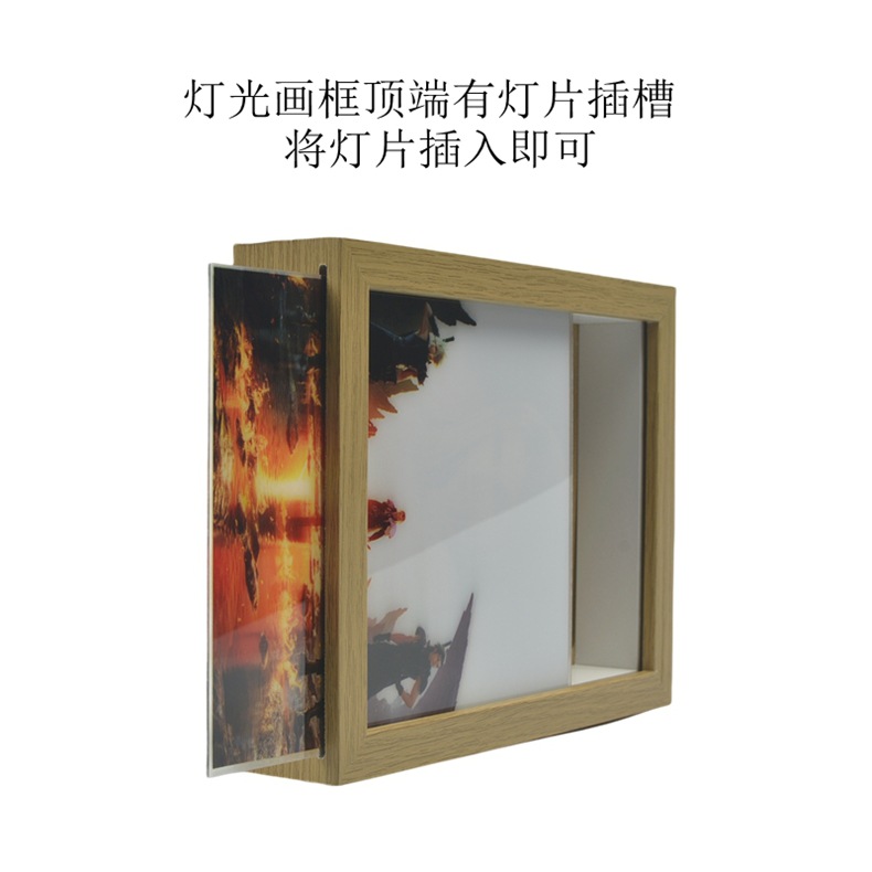 相框侧面有个灯光片的插槽,可以轻松将灯光片插入,请在插入之前将正面的保护膜撕掉哦。