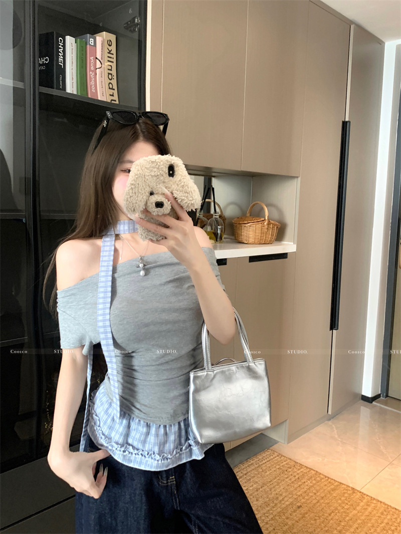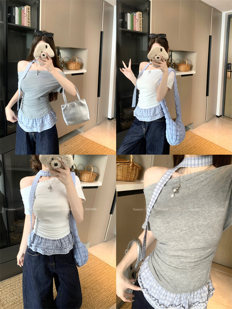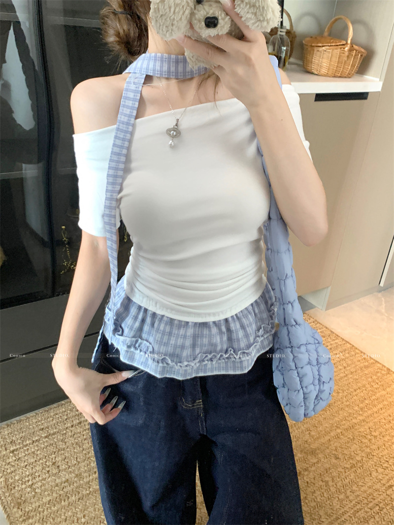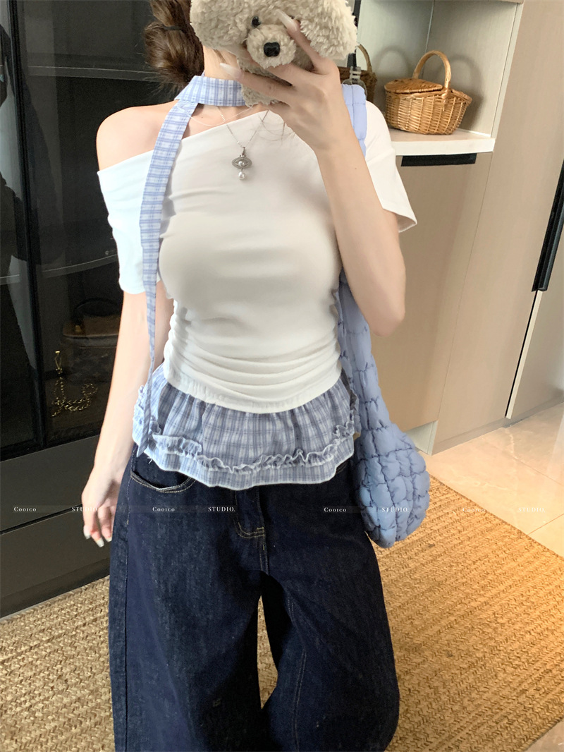 여름 시크 허리 슬리밍 탑 인을 위한 니치 디자인 가짜 투피스 대비 체크 무늬 반팔 슬로프 숄더 티셔츠